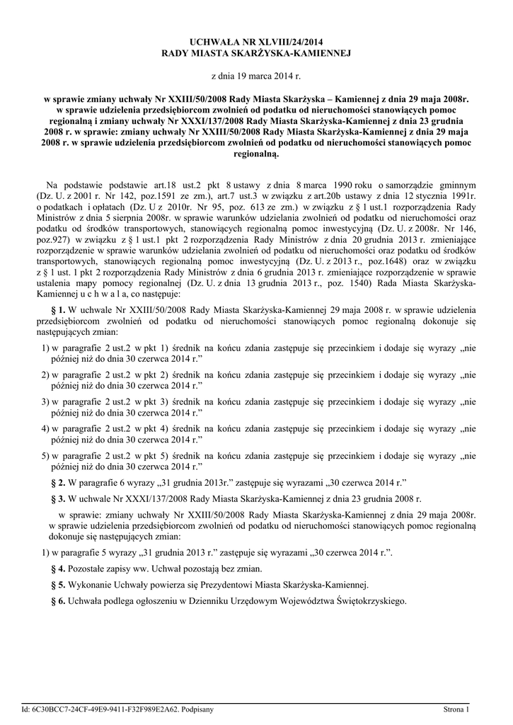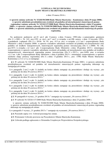 UCHWAŁA NR XLVIII/24/2014 RADY MIASTA SKARŻYSKA-KAMIENNEJ z dnia 19 marca 2014 r. w sprawie zmiany uchwały Nr XXIII/50/2008 Rady Miasta Skarżyska – Kamiennej z dnia 29 maja 2008r. w sprawie udzielenia przedsiębiorcom zwolnień od podatku od nieruchomości stanowiących pomoc regionalną i zmiany uchwały Nr XXXI/137/2008 Rady Miasta Skarżyska-Kamiennej z dnia 23 grudnia 2008 r. w sprawie: zmiany uchwały Nr XXIII/50/2008 Rady Miasta Skarżyska-Kamiennej z dnia 29 maja 2008 r. w sprawie udzielenia przedsiębiorcom zwolnień od podatku od nieruchomości stanowiących pomoc regionalną. Na podstawie podstawie art.18 ust.2 pkt 8 ustawy z dnia 8 marca 1990 roku o samorządzie gminnym (Dz. U. z 2001 r. Nr 142, poz.1591 ze zm.), art.7 ust.3 w związku z art.20b ustawy z dnia 12 stycznia 1991r. o podatkach i opłatach (Dz. U z 2010r. Nr 95, poz. 613 ze zm.) w związku z § 1 ust.1 rozporządzenia Rady Ministrów z dnia 5 sierpnia 2008r. w sprawie warunków udzielania zwolnień od podatku od nieruchomości oraz podatku od środków transportowych, stanowiących regionalną pomoc inwestycyjną (Dz. U. z 2008r. Nr 146, poz.927) w związku z § 1 ust.1 pkt 2 rozporządzenia Rady Ministrów z dnia 20 grudnia 2013 r. zmieniające rozporządzenie w sprawie warunków udzielania zwolnień od podatku od nieruchomości oraz podatku od środków transportowych, stanowiących regionalną pomoc inwestycyjną (Dz. U. z 2013 r., poz.1648) oraz w związku z § 1 ust. 1 pkt 2 rozporządzenia Rady Ministrów z dnia 6 grudnia 2013 r. zmieniające rozporządzenie w sprawie ustalenia mapy pomocy regionalnej (Dz. U. z dnia 13 grudnia 2013 r., poz. 1540) Rada Miasta SkarżyskaKamiennej u c h w a l a, co następuje: § 1. W uchwale Nr XXIII/50/2008 Rady Miasta Skarżyska-Kamiennej 29 maja 2008 r. w sprawie udzielenia przedsiębiorcom zwolnień od podatku od nieruchomości stanowiących pomoc regionalną dokonuje się następujących zmian: 1) w paragrafie 2 ust.2 w pkt 1) średnik na końcu zdania zastępuje się przecinkiem i dodaje się wyrazy „nie później niż do dnia 30 czerwca 2014 r.” 2) w paragrafie 2 ust.2 w pkt 2) średnik na końcu zdania zastępuje się przecinkiem i dodaje się wyrazy „nie później niż do dnia 30 czerwca 2014 r.” 3) w paragrafie 2 ust.2 w pkt 3) średnik na końcu zdania zastępuje się przecinkiem i dodaje się wyrazy „nie później niż do dnia 30 czerwca 2014 r.” 4) w paragrafie 2 ust.2 w pkt 4) średnik na końcu zdania zastępuje się przecinkiem i dodaje się wyrazy „nie później niż do dnia 30 czerwca 2014 r.” 5) w paragrafie 2 ust.2 w pkt 5) średnik na końcu zdania zastępuje się przecinkiem i dodaje się wyrazy „nie później niż do dnia 30 czerwca 2014 r.” § 2. W paragrafie 6 wyrazy „31 grudnia 2013r.” zastępuje się wyrazami „30 czerwca 2014 r.” § 3. W uchwale Nr XXXI/137/2008 Rady Miasta Skarżyska-Kamiennej z dnia 23 grudnia 2008 r. w sprawie: zmiany uchwały Nr XXIII/50/2008 Rady Miasta Skarżyska-Kamiennej z dnia 29 maja 2008r. w sprawie udzielenia przedsiębiorcom zwolnień od podatku od nieruchomości stanowiących pomoc regionalną dokonuje się następujących zmian: 1) w paragrafie 5 wyrazy „31 grudnia 2013 r.” zastępuje się wyrazami „30 czerwca 2014 r.”. § 4. Pozostałe zapisy ww. Uchwał pozostają bez zmian. § 5. Wykonanie Uchwały powierza się Prezydentowi Miasta Skarżyska-Kamiennej. § 6. Uchwała podlega ogłoszeniu w Dzienniku Urzędowym Województwa Świętokrzyskiego. Id: 6C30BCC7-24CF-49E9-9411-F32F989E2A62. Podpisany Strona 1 § 7. Uchwała wchodzi w życie po upływie 14 dni od dnia ogłoszenia w Dzienniku Urzędowym Województwa Świętokrzyskiego z mocą obowiązującą od dnia 01 stycznia 2014 r. Przewodniczący Rady Miasta Andrzej Dąbrowski Id: 6C30BCC7-24CF-49E9-9411-F32F989E2A62. Podpisany Strona 2 UZASADNIENIE Potrzeba wprowadzenia zmian do Uchwały XXIII/50/2008 Rady Miasta Skarżyska -Kamiennej z dnia 29 maja 2008r. w sprawie udzielenia przedsiębiorcom zwolnień w podatku od nieruchomości, stanowiących regionalną pomoc inwestycyjną oraz jej zmiany wprowadzoną uchwałą Nr XXXI/137/2008 Rady Miasta Skarżyska-Kamiennej z dnia 23 grudnia 2008 r. wynika z możliwości przedłużenia okresu ich obowiązywania. W oparciu o obowiązujące wówczas przepisy prawa dotyczące podjęcia uchwał przewidujących udzielanie regionalnej pomocy inwestycyjnej w formie zwolnień z podatku od nieruchomości oraz od środków transportowych - okres ich obowiązywania to 31 grudnia 2013 r. Niniejszym projektem proponuje się zmianę okresu obowiązywania mając na uwadze również zapis § 1 ust. 1 pkt 2 rozporządzenia Rady Ministrów z dnia 20 grudnia 2013 r. (Dz. U. z 2013 r., poz.1648) , gdzie § 13 otrzymuje brzmienie” Pomoc na warunkach określonych w rozporządzeniu może być udzielana do dnia określonego w art.44 ust.3 zdanie drugie rozporządzenia Komisji (WE) nr 800/2008 z dnia 6 sierpnia 2008 r. uznającego niektóre rodzaje pomocy za zgodne ze wspólnym rynkiem w zastosowaniu art.87 i 88 Traktatu (ogólnego rozporządzenia w sprawie wyłączeń blokowych)”, które brzmi: „Wyłączenie programów pomocy regionalnej wygasa z dniem wygaśnięcia zatwierdzonych map pomocy regionalnej”. Rozporządzenie Rady Ministrów z dnia 6 grudnia 2013 r. zmieniające rozporządzenie w sprawie ustalenia mapy pomocy regionalnej (Dz. U. z dnia 13 grudnia 2013 r., poz.1540) - wprowadza następujące zmiany: w § 1 ust. 1 pkt 2 w rozporządzeniu Rady Ministrów z dnia 13 października 2006 r. w sprawie ustalenia mapy pomocy regionalnej (Dz. U. Nr 190, poz.1402) w § 9 wyrazy „31 grudnia 2013 r „ zastępuje się wyrazami „30 czerwca 2014 r.” . Należy wskazać, iż program pomocy regionalnej objęty uchwałą Nr XXIII/50/2008 Rady Miasta Skarżyska-Kamiennej z dnia 29 maja 2008 r. ogłoszony w Dzienniku Urzędowym Województwa Świętokrzyskiego z dnia 16 czerwca 2008r. Nr 118, poz.1686 - zgłos