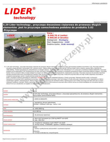 Informacje o produkcie Utworzono 04-03-2017 Cena : 8.048,78 zł (netto) 9.900,00 zł (brutto) zy cz ep y. p Dostępność : Dostępny Stan magazynowy : niski Średnia ocena : brak recenzji l 5.29 Lider technology , przyczepa dwuosiowa ciężarowa do przewozu długich elementów .Jest to przyczepa samochodowa podobna do produktu 5.02 .Przyczepa 0. 5.29 Lider technology , przyczepa dwuosiowa ciężarowa do przewozu długich elementów .Jest to przyczepa samochodowa podobna do produktu 5.02 .Przyczepa podobna w .li de rp r wizualnie ,proszę poczytać o przyczepie 5.02 i samemu ocenić .Główna zaletą przyczepy są dwie osie po 1350 kg. Dzięki czemu możemy uzyskać DMC w zakresie od 1400-2600kg . Produkt specjalistyczny sklasyfikowany w kategorii dłużyca . Producent nadał numer identyfikacji 5.14 o oznaczeniu handlowym EURO B-2600/0/P3. Przyczepa podobnie jak jej poprzednik 5.02 charakteryzuje się super wymiarem wewnętrznym który pozwala na swobodne przewożenie długich elementów 6000mm długości .Przyczepa bardzo mocna a zarazem lekka w swojej kategorii jej waga to ok 480kg w zależności od wyposażenia i doposażenia przyczepy. Przyczepa ciężarowa do pierwszej rejestracji posiada wszystkie dokumenty homologacyjne kupujący staje się pierwszym właścicielem przyczepy. Producent przyczep zaleca do tego modelu doposażyć przyczepę w urządzenie poprawiające jakość i bezpieczeństwo jazdy tzw. Winterhoff. Jazda z zaczepem kulowym posiadającym stabilizator WINTERHOFF skutecznie zapobiega kołysaniu i kiwaniu przyczepy. Poprawia komfort jazdy w sytuacjach awaryjnych,minimalizuje efekt wężykowania przyczepy- wyrównuje tor jazdy przyczepy. Lider technology 5.14 jako przyczepa ciężarowa musi być wyposażona w tablice wyróżniające zgodnie z obowiązującymi. Ważną istotną rzeczą przy rejestracji jest określenie tablicy rejestracyjnej w tym modelu przyczepy jest taka sama jak w autach osobowych podłużna ,standard. Oprócz opisanego wcześniej doposażenia które producent przyczep zaleca istotną rzeczą są uchwytu podłogowe do mocowania ładunku których nie ma w standardzie ze względu na indywidualne zapotrzebowanie . NUMER 5.29 w NAZWA WYMIAR w OZNACZENIE HANDLOWE DMC MASA WŁASNA ROK PRODUKCJI 5.29 Lider technology ,przyczepa dłużyca , przyczepa specjalistyczna ,do przewozu długich elementów , przyczepka samochodowa lekka . - EURO B-2600/0/P3 - zewnętrzny skrzyni ładunkowej 6100dł / 1500szer /450 wys . burtu / mm - 1400-2600 kg -ok 480 kg - do pierwszej rejestracji UKŁAD JEZDNY - dwie osie hamowane po 1350 kg KNOTT lub ALKO - koła 185/ R14 UKŁAD HAMULCOWY - Urządzenie najazdowe marki KNOTT lub ALKO - zaczep kulowy STANDARD zgodnie z układem osiowym RAMA - stalowa o podwyższonej wytrzymałości, ocynkowana ogniowo NADWOZIE Wygenerowano w programie www.oscGold.com PODŁOGA - ze sklejki wodoodpornej- antypoślizgowej - instalacja 12V - wtyczka 7 lub 13 PIN - lampy tylne zespolone - obrysy boczne - podświetlenie tablicy - lampy przednie Elektryka - koło podporowo -manerwowe standard - dyszel V -wzmacniany -burta boczna w postaci kratownicy , tylnia burta otwierana ,przednia stała -ramka tablicy rejestracyjnej -tablice wyróżniające . WYPOSAŻENIE Nowość-urządzenie poprawiające jakość oraz bezpieczeństwo jazdy WINTERHOFF. -plandeka ze stelażem w różnych wysokościach i kolorach -uchwyty podłogowe - barierka przednia - obejmy do podpór bocznych przyczepy - koło zapasowe z uchwytem - koło podporowe wzmacniane - zabezpieczenie antykradzieżowe -inne w w w .li de rp r zy cz ep y. p l DOPOSAŻENIE (dodatkowo płatne)