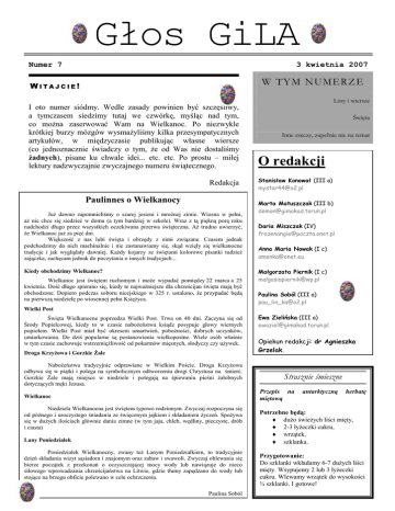 Głos GiLA Numer 7 3 kwietnia 2007 W TYM N UMERZE WITAJCIE! Listy i wiersze I oto numer siódmy. Wedle zasady powinien być szczęśliwy, a tymczasem siedzimy tutaj we czwórkę, myśląc nad tym, co moŜna zaserwować Wam na Wielkanoc. Po niezwykle krótkiej burzy mózgów wysmaŜyliśmy kilka przesympatycznych artykułów, w międzyczasie publikując własne wiersze (co jednoznacznie świadczy o tym, Ŝe od Was nie dostaliśmy Ŝadnych), pisane ku chwale idei... etc. etc. Po prostu – miłej lektury nadzwyczajnie zwyczajnego numeru świątecznego. Redakcja Paulinnes o Wielkanocy JuŜ dawno zapomnieliśmy o szarej jesieni i mroźnej zimie. Wiosna w pełni, aŜ nie chce się siedzieć w domu (a tym bardziej w szkole). Wraz z tą piękną porą roku nadchodzi długo przez wszystkich oczekiwana przerwa świąteczna. AŜ trudno uwierzyć, Ŝe Wielkanoc juŜ za pięć dni. Większość z nas lubi święta i obrzędy z nimi związane. Czasem jednak podchodzimy do nich machinalnie i nie zastanawiamy się, skąd wzięły się wielkanocne tradycje i jak wyglądały dawniej. KaŜdy kojarzy ze świętami kolorowe pisanki tudzieŜ zajączka, zachęcam jednak do poczytania o innych tradycjach... Kiedy obchodzimy Wielkanoc? Wielkanoc jest świętem ruchomym i moŜe wypadać pomiędzy 22 marca a 25 kwietnia. Dość długo spierano się, kiedy te najwaŜniejsze dla chrześcijan święta mają być obchodzone. Dopiero podczas soboru nicejskiego w 325 r. ustalono, Ŝe przypadać będą na pierwszą niedzielę po wiosennej pełni KsięŜyca. Święta Inne rzeczy, zupełnie nie na temat O redakcji Stanisław Konował (III a) [email protected] Marta Matuszczak (III b) [email protected] Daria Miszczak (IV) [email protected] Anna Maria Nowak (I c) [email protected] Małgorzata Piernik (I c) [email protected] Paulina Soból (III a) [email protected] Wielki Post Święta Wielkanocne poprzedza Wielki Post. Trwa on 40 dni. Zaczyna się od Środy Popielcowej, kiedy to w czasie naboŜeństwa ksiądz posypuje głowy wiernych popiołem. Wielki Post miał być okresem umartwień, poboŜności, dobrych uczynków, umiarkowania. Do dziś popularne są postanowienia wielkopostne. Wiele osób właśnie w tym czasie zachowuje wstrzemięźliwość od pokarmów mięsnych, słodyczy czy uŜywek. Droga KrzyŜowa i Gorzkie śale NaboŜeństwa tradycyjnie odprawiane w Wielkim Poście. Droga KrzyŜowa odbywa się w piątki i polega na symbolicznym odtworzeniu drogi Chrystusa na śmierć. Gorzkie śale mają miejsce w niedziele i polegają na śpiewaniu pieśni Ŝałobnych dotyczących męki Jezusa. Ewa Zielińska (III a) [email protected] Opiekun redakcji: dr Agnieszka Grzelak. Strasznie śmieszne Przepis na miętową Wielkanoc Niedziela Wielkanocna jest świętem typowo rodzinnym. Zwyczaj rozpoczyna się od późnego i uroczystego śniadania ze święconym jajkiem i składaniem Ŝyczeń. SpoŜywa się w duŜych ilościach głównie dania zimne (w tym jaja, chleb, wędliny, pieczyste, drób i ciasta) Lany Poniedziałek Poniedziałek Wielkanocny, zwany teŜ Lanym Poniedziałkiem, to tradycyjnie dzień składania wizyt sąsiadom i znajomym oraz zabaw i swawoli. Zwyczaj oblewania się bierze początek z przekonań o oczyszczającej mocy wody lub nawiązuje do nieco siłowego wprowadzania chrześcijaństwa na Litwie, gdzie tłumy zapędzano do wody lub stojące na brzegu obficie polewano w celu ochrzczenia. Paulina Soból antarktyczną herbatę Potrzebne będą: ♦ duŜo świeŜych liści mięty, ♦ 2-3 łyŜeczki cukru, ♦ wrzątek, ♦ szklanka. Przygotowanie: Do szklanki wkładamy 6-7 duŜych liści mięty. Wsypujemy 2 lub 3 łyŜeczki cukru. Wlewamy wrzątek do wysokości ¾ szklanki. I gotowe! GiLA w erze photoblogów Z LISTÓW DO REDAKCJI śycie szkolne kwitnie aŜ miło. MoŜna by nawet powiedzieć, Ŝe wszyscy kochamy się na zabój, tworząc blisko dwustuosobowe koło wzajemnej adoracji. Zastanówmy się jednak, jak naprawdę wygląda nasza szkolna rzeczywistość i czy na co dzień wszyscy jesteśmy na tyle zgodni, na ile chcielibyśmy być. Zacznijmy od tych, którzy byli tu na początku. Miło byłoby, gdyby redakcja dostała choć jeden, nawet obraźliwy, list od piątoklasisty. Niestety, wygląda na to, Ŝe są tak zajęci egzaminem maturalnym, Ŝe coraz bardziej oddalają się od Ŝycia szkolnego. Bo co z tego, Ŝe mijając nas na korytarzu, powiedzą, Ŝe gazetka jest beznadziejna, skoro nie doradzą, co naleŜy w niej zmienić? Nie chcemy, Ŝeby słowa te zostały źle odebrane – sytuacja ta udowadnia, jak bardzo się zmienili w ciągu ostatnich lat. Następnie są czwartoklasiści. Jest to rocznik, który w pewnym stopniu łączy poszczególnych przedstawicieli innych, jednocześnie pozostając przyjaznym dla wszystkich. Ot, takie grono wybrańców, które nie gardzi innymi. O sobie nie będziemy się wypowiadać. Klasy drugie są chyba rocznikiem najciekawszym. Bo niby są, ale tak, jakby ich nie było. Mijają nas na szkolnych korytarzach, spotykamy ich w internacie, ale tylko nieliczni z nich pragną nawiązać jakikolwiek kontakt. Na końcu są pierwszaki. ChociaŜ właściwie jeszcze się integrują, to idzie im to bardzo dobrze. Skomentujemy w przyszłym roku. Teraz czas wytłumaczyć tytuł. Zastanówcie się sami: czy photoblogi nie przyczyniły się do tego, Ŝe znamy się tak, jak się znamy? ;) I dlaczego drugaki, z jednym tylko chyba wyjątkiem, photoblogów nie mają? I tak po raz kolejny krótkie rozmyślania zaprzeczyły najbardziej absurdalnej tezie, jaka kiedykolwiek dotarła do naszych redakcyjnych uszu: Nieparzyste roczniki trzymają się z nieparzystymi, a parzyste z parzystymi. Skąd niby ta reguła? POEZYJA Pańka D. wymiata Asia Siejbik pozdrawia: Panią prof. A.Grzelak Z LISTÓW TO TYLE :D SENTENCJE TYGODNIA śADNEJ SMAśENINY ! BO TAK JEST, TAK? TU, DO WODY? JESTEM ŚLICZNA ! HEEE...? Polecamy ksiąŜki na święta • • • • • Ciekawa Fizyka, cz. I PoŜary serc Saga Rodu z Lipow