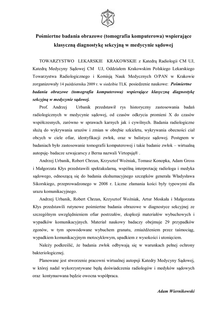 Pośmiertne badania obrazowe (tomografia komputerowa) wspierające klasyczną diagnostykę sekcyjną w medycynie sądowej TOWARZYSTWO LEKARSKIE KRAKOWSKIE z Katedrą Radiologii CM UJ, Katedrą Medycyny Sądowej CM UJ, Oddziałem Krakowskim Polskiego Lekarskiego Towarzystwa Radiologicznego i Komisją Nauk Medycznych O/PAN w Krakowie zorganizowały 14 października 2009 r. w siedzibie TLK posiedzenie naukowe: Pośmiertne badania obrazowe (tomografia komputerowa) wspierające klasyczną diagnostykę sekcyjną w medycynie sądowej. Prof. Andrzej Urbanik przedstawił rys historyczny zastosowania badań radiologicznych w medycynie sądowej, od czasów odkrycia promieni X do czasów współczesnych, zarówno w sprawach karnych jak i cywilnych. Badania radiologiczne służą do wykrywania urazów i zmian w obrębie szkieletu, wykrywania obecności ciał obcych w ciele ofiar, identyfikacji zwłok, oraz w balistyce sądowej. Postępem w badaniach było zastosowanie tomografii komputerowej i takie badanie zwłok – wirtualną autopsję- badacze szwajcarscy z Berna nazwali Virtopsją® . Andrzej Urbanik, Robert Chrzan, Krzysztof Woźniak, Tomasz Konopka, Adam Gross i Małgorzata Kłys przedstawili spektakularną, wspólną interpretację radiologa i medyka sądowego, odnoszącą się do badania ekshumacyjnego szczątków generała Władysława Sikorskiego, przeprowadzonego w 2008 r. Liczne złamania kości były typowymi dla urazu komunikacyjnego. Andrzej Urbanik, Robert Chrzan, Krzysztof Woźniak, Artur Moskała i Małgorzata Kłys przedstawili rutynowe pośmiertne badania obrazowe w diagnostyce sekcyjnej ze szczególnym uwzględnieniem ofiar postrzałów, eksplozji materiałów wybuchowych i wypadków komunikacyjnych. Materiał naukowy badaczy obejmuje 29 przypadków zgonów, w tym spowodowane wybuchem granatu, zmiażdżeniem przez taśmociąg, wypadkiem komunikacyjnym motocyklowym, upadkiem z wysokości i utonięciem. Należy podkreślić, że badania zwłok odbywają się w warunkach pełnej ochrony bakteriologicznej. Planowane jest stworzenie pracowni wirtualnej autopsji Katedry Medycyny Sądowej, w której nadal wykorzystywane będą doświadczenia radiologów i medyków sądowych oraz kontynuowana będzie owocna współpraca. Adam Wiernikowski