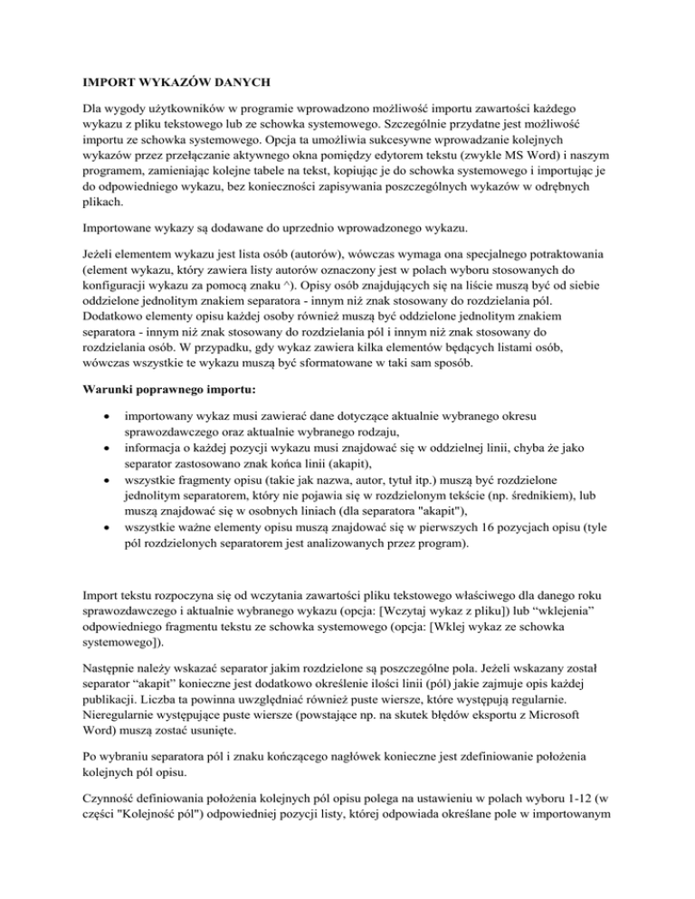 IMPORT WYKAZÓW DANYCH Dla wygody użytkowników w programie wprowadzono możliwość importu zawartości każdego wykazu z pliku tekstowego lub ze schowka systemowego. Szczególnie przydatne jest możliwość importu ze schowka systemowego. Opcja ta umożliwia sukcesywne wprowadzanie kolejnych wykazów przez przełączanie aktywnego okna pomiędzy edytorem tekstu (zwykle MS Word) i naszym programem, zamieniając kolejne tabele na tekst, kopiując je do schowka systemowego i importując je do odpowiedniego wykazu, bez konieczności zapisywania poszczególnych wykazów w odrębnych plikach. Importowane wykazy są dodawane do uprzednio wprowadzonego wykazu. Jeżeli elementem wykazu jest lista osób (autorów), wówczas wymaga ona specjalnego potraktowania (element wykazu, który zawiera listy autorów oznaczony jest w polach wyboru stosowanych do konfiguracji wykazu za pomocą znaku ^). Opisy osób znajdujących się na liście muszą być od siebie oddzielone jednolitym znakiem separatora - innym niż znak stosowany do rozdzielania pól. Dodatkowo elementy opisu każdej osoby również muszą być oddzielone jednolitym znakiem separatora - innym niż znak stosowany do rozdzielania pól i innym niż znak stosowany do rozdzielania osób. W przypadku, gdy wykaz zawiera kilka elementów będących listami osób, wówczas wszystkie te wykazu muszą być sformatowane w taki sam sposób. Warunki poprawnego importu: importowany wykaz musi zawierać dane dotyczące aktualnie wybranego okresu sprawozdawczego oraz aktualnie wybranego rodzaju, informacja o każdej pozycji wykazu musi znajdować się w oddzielnej linii, chyba że jako separator zastosowano znak końca linii (akapit), wszystkie fragmenty opisu (takie jak nazwa, autor, tytuł itp.) muszą być rozdzielone jednolitym separatorem, który nie pojawia się w rozdzielonym tekście (np. średnikiem), lub muszą znajdować się w osobnych liniach (dla separatora "akapit"), wszystkie ważne elementy opisu muszą znajdować się w pierwszych 16 pozycjach opisu (tyle pól rozdzielonych separatorem jest analizowanych przez program). Import tekstu rozpoczyna się od wczytania zawartości pliku tekstowego właściwego dla danego roku sprawozdawczego i aktualnie wybranego wykazu (opcja: [Wczytaj wykaz z pliku]) lub “wklejenia” odpowiedniego fragmentu tekstu ze schowka systemowego (opcja: [Wklej wykaz ze schowka systemowego]). Następnie należy wskazać separator jakim rozdzielone są poszczególne pola. Jeżeli wskazany został separator “akapit” konieczne jest dodatkowo określenie ilości linii (pól) jakie zajmuje opis każdej publikacji. Liczba ta powinna uwzględniać również puste wiersze, które występują regularnie. Nieregularnie występujące puste wiersze (powstające np. na skutek błędów eksportu z Microsoft Word) muszą zostać usunięte. Po wybraniu separatora pól i znaku kończącego nagłówek konieczne jest zdefiniowanie położenia kolejnych pól opisu. Czynność definiowania położenia kolejnych pól opisu polega na ustawieniu w polach wyboru 1-12 (w części "Kolejność pól") odpowiedniej pozycji listy, której odpowiada określane pole w importowanym zbiorze. Jeżeli wybór kolejności pól został zakończony, należy nacisnąć przycisk "Dalej". W tym momencie rozpocznie się analiza zawartości importowanego zbioru oraz podział linii na pola zgodnie z wybranymi parametrami. Wynik importu odpowiadający podanym kryteriom zostaje przed wprowadzeniem do bazy danych wyświetlony w formie kolumn na ekranie. Można w tym momencie cofnąć się do poprzedniego ekranu i zdefiniować inaczej parametry podziału linii na pola, lub jeżeli wszystkie pola zostały wczytane prawidłowo można sfinalizować import (umożliwić programowi ostateczne załadowanie danych) poprzez naciśnięcie przycisku [Wprowadź wykaz do bazy]. W przypadku importu tekstu zapisanego wcześniej jako tabela w dokumencie programu Microsoft Word zaleca się: 1. Wybrać odpowiednią tabelę. 2. Usunąć nagłówek tabeli. 3. Zaznaczyć całą tabelę i uruchomić opcję menu MS Word "Tabela" -> "Konwertuj tabelę na tekst". 4. Ustawić separator tekstu jako "Znaczniki akapitu" i uruchomić konwersję. 5. Usunąć nieregularnie występujące puste wiersze, jakie czasem powstają podczas konwersji. 6. Powstały tekst skopiować do schowka systemowego (opcja menu MS Word “Edytuj -> Kopiuj”) lub do innego dokumentu i zapisać jako "Plik tekstowy". 7. Wczytać tekst ze schowka systemowego (opcja naszego programu [Wklej wykaz ze schowka systemowego]) lub pliku tekstowego (opcja naszego programu [Wczytaj wykaz z pliku]) 8. Zaimportować plik do programu ankiety jednostki, ustawiając separator jako "akapit" oraz podając liczbę linii jaka opisuje każdą pozycję. Uwaga! Przed wprowadzeniem do bazy dane są dokładnie sprawdzane pod kątem ilości znaków, typu oraz zgodności ze stosowanymi w programie klasyfikacjami. Jeżeli dane nie będą prawidłowe system odmówi ich wprowadzenia do bazy. Konieczne jest wówczas poprawienie wczytywanego tekstu (lub opcji importu) i ponowne wczytanie go do struktury danych. Przykładowe dane do importu wykazu publikacji: Import do wykazu czasopism 3.1.a Importowany tekst: ACADEMIC RADIOLOGY;tytuł_1; A01$dr$Jan$Tadeusz$Kowalski$tak# A02$$Ignacy$$Krasicki$tak; 4;$$J.$$Smith$tak# $$Wolt$$Disney$tak;2010;A-15;12-20;angielski PEPTIDES;tytuł_2;A01$dr$Jan$Tadeusz$Kowalski$tak# $prof.$Andrzej$$Nowak$nie; 1; $$Frank$$ Man$tak; 2011;T.12;1290-1300;włoski PLASMA SOURCES SCIENCE & TECHNOLOGY;tytuł_3;A02$$Ignacy$$Krasicki$tak; 0;; 2012; 1; 35; francuski Ustawienia: Definicja struktury wykazu: 1- 'Nazwa czasopisma*' 2- 'Tytuł publikacji*' 3- 'Autorzy z jednostki**' 4- 'Liczba autorów spoza jednostki*' 5- 'Autorzy spoza jednostki**' 6- 'Rok*' 7- 'Tom*' 8- 'Strony*' 9- 'Język*' Separator pól: ; Definicja opisu osoby: 1- identyfikator 2- stopień/tytuł 3- imię 4- drugie imię 5- nazwisko 6- afiliacja Separator os