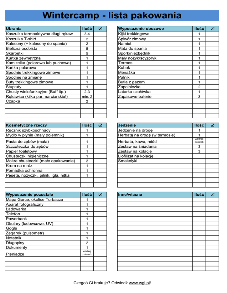 Wintercamp - lista pakowania Ilość Ubrania Koszulka termoaktywna długi rękaw Koszulka T-shirt Kalesony (+ kalesony do spania) Bielizna osobista Skarpetki Kurtka zewnętrzna Kamizelka (polarowa lub puchowa) Kurtka polarowa Spodnie trekkingowe zimowe Spodnie na zmianę Buty trekkingowe zimowe Stuptuty Chusty wielofunkcyjne (Buff itp.) Rękawice (kilka par, narciarskie!) Czapka 3-4 2 2 5 5 1 1 1 1 1 1 1 2-3 min. 2 2 Ilość Kosmetyczne rzeczy Ręcznik szybkoschnący Mydło w płynie (mały pojemnik) Pieniądze ☑ 1 1 Pasta do zębów (mała) Szczoteczka do zębów Papier toaletowy Chusteczki higieniczne Mokre chusteczki (małe opakowania) Krem na mróz Pomadka ochronna Pęseta, nożyczki, pilnik, igła, nitka Wyposażenie pozostałe Mapa Gorce, okolice Turbacza Aparat fotograficzny Ładowarka Telefon Powerbank Okulary (lodowcowe, UV) Gogle Zegarek (pulsometr) Notatnik Długopisy Dokumenty ☑ Ilość Jedzenie Jedzenie na drogę Herbatą na drogę (w termosie) Ilość Herbata, kawa, miód Zestaw na śniadania Zestaw na kolacje Liofilizat na kolację Smakołyki 1 1 1 1 2 1 1 1 Ilość Wyposażenie obozowe Kijki trekkingowe Śpiwór zimowy Namiot Mata do spania Spork/niezbędnik Mały nożyk/scyzoryk Termos Kubek Menażka Palnik Butla z gazem Zapalniczka Latarka czołówka Zapasowe baterie ☑ Inne/własne 1 1 1 1 1 1 1 1 1 2 1 według potrzeb Czegoś Ci brakuje? Odwiedź www.wgl.pl! ☑ 1 1 1 1 1 1 1 1 1 1 1 2 1 3 ☑ 1 1 według potrzeb 3 3 Ilość ☑