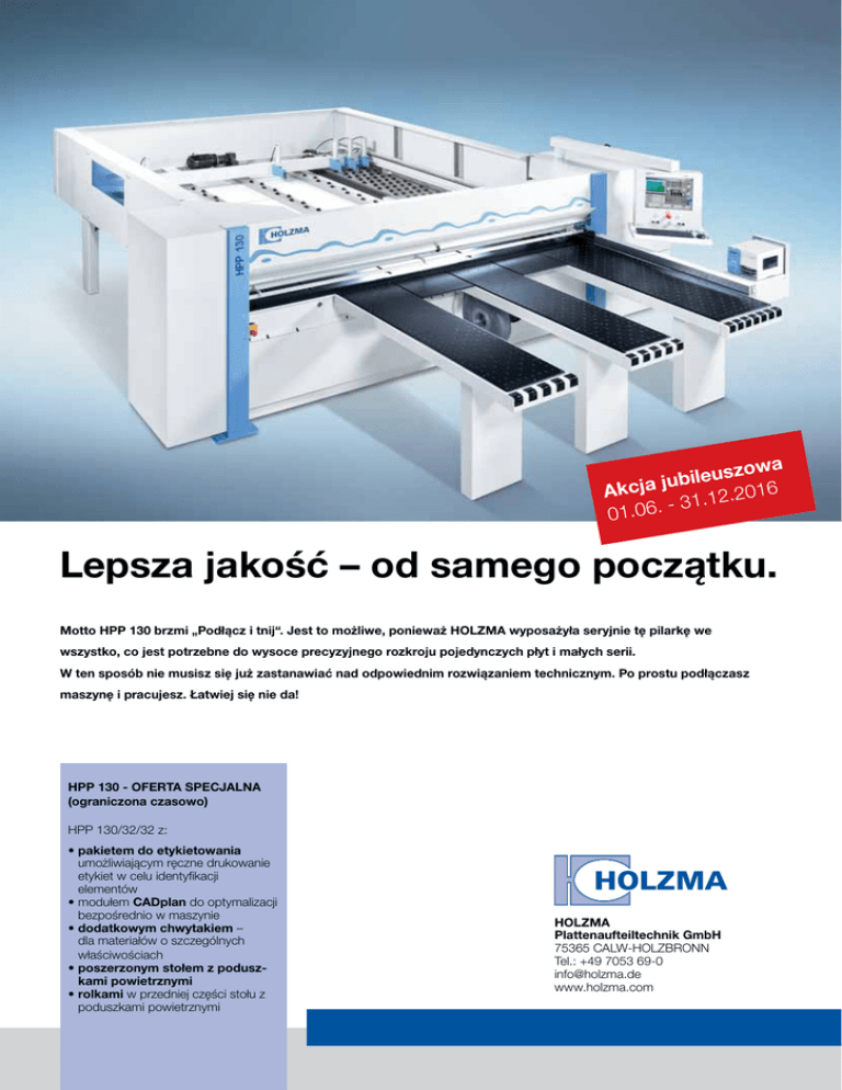 szowa u e l i b ju Akcja 2.2016 1 . 1 3 01.06. Lepsza jakość – od samego początku. Motto HPP 130 brzmi „Podłącz i tnij“. Jest to możliwe, ponieważ HOLZMA wyposażyła seryjnie tę pilarkę we wszystko, co jest potrzebne do wysoce precyzyjnego rozkroju pojedynczych płyt i małych serii. W ten sposób nie musisz się już zastanawiać nad odpowiednim rozwiązaniem technicznym. Po prostu podłączasz maszynę i pracujesz. Łatwiej się nie da! HPP 130 - OFERTA SPECJALNA (ograniczona czasowo) HPP 130/32/32 z: •pakietem do etykietowania umożliwiającym ręczne drukowanie etykiet w celu identyfikacji elementów •modułem CADplan do optymalizacji bezpośrednio w maszynie •dodatkowym chwytakiem – dla materiałów o szczególnych właściwościach •poszerzonym stołem z poduszkami powietrznymi •rolkami w przedniej części stołu z poduszkami powietrznymi HOLZMA Plattenaufteiltechnik GmbH 75365 Calw-Holzbronn Tel.: +49 7053 69-0 [email protected] www.holzma.com HPP 130 – najwyższa jakość w dobrej cenie. W skrócie •najwyższa jakość w promocyjnej cenie •idealna do pojedynczych płyt i małych serii •60 mm wystawanie tarczy piły •3 stoły z poduszkami powietrznymi umozliwiające łatwy i bezpieczny transport •sprawdzone i proste w obsłudze oprogramowanie CADmatic •pakiet zabezpieczeń •Idealna zarówno dla początkujących, jak i doświadczonych: korzystna cena, wysoka wydajność •Automatyczne cięcie: szybkie, wydajne, bezpieczne •Wszystko w jednym: precyzyjne przycinanie płyt Dane techniczne* Wystawanie tarczy piły Długość cięcia Oferta specjalna pilarek panelowych HPP 130 z okazji jubileuszu firmy. ZŁAP OKAZJĘ: oferta ograniczona czasowo! Szczegóły: •czas trwania: od 01.06.2016 do 31.12.2016. Liczy się data i czas wpłynięcia zamówienia do HOMAG Polska Sp. z o.o., Środa Wlkp., bądź HOLZMA Plattenaufteiltechnik GmbH, Holzbronn. •uczestnictwo: W ramach podziękowania za długoletnią współpracę i zaufanie firma HOLZMA przygotowała specjalną ofertę pilarek HPP 130. Skierowana jest ona zarówno do nowych Klientów, jak i wieloletnich partnerów firmy. •uwaga: Akcja nie łączy się z innymi promocjami. HPP 130 60 mm 3 200 mm Prędkość belki podającej do 60 m/min Posuw wózka piły do 60 m/min Silnik piły głównej 5,5 kW (optional 7,5 kW) Oprogramowanie CADmatic 4 PRACTIVE Monitor * Zainteresowany? Zapraszamy po szczegóły do Działu Handlowego HOMAG Polska! Nie zwlekaj – jesteśmy do Twojej dyspozycji 19"-calowy płaski wyświetlacz TFT w odniesieniu do wyposażenia HOLZMA Plattenaufteiltechnik GmbH 75365 Calw-Holzbronn Tel. +49 7053 69-0 [email protected] HOMAG Polska Sp. z o.o. 63-000 SRODA WIELKOPOLSKA Tel. +48 61 6474500 [email protected]