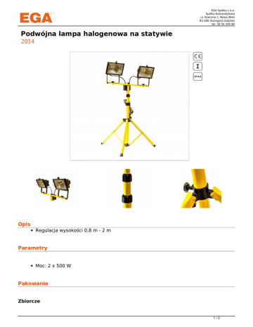 EGA Spółka z o.o. Spółka Komandytowa ul. Rzeczna 1, Nowa Wieś 83-200 Starogard Gdański tel. 58 56 300 80 Podwójna lampa halogenowa na statywie 2014 Opis Regulacja wysokości 0,8 m - 2 m Parametry Moc: 2 x 500 W Pakowanie Zbiorcze 1/2 EGA Spółka z o.o. Spółka Komandytowa ul. Rzeczna 1, Nowa Wieś 83-200 Starogard Gdański tel. 58 56 300 80 Karton: 4 szt. Warianty Lp. Nr katalogowy EAN Moc 1 2014 5907078920146 2 x 500 W 2/2 Powered by TCPDF (www.tcpdf.org)