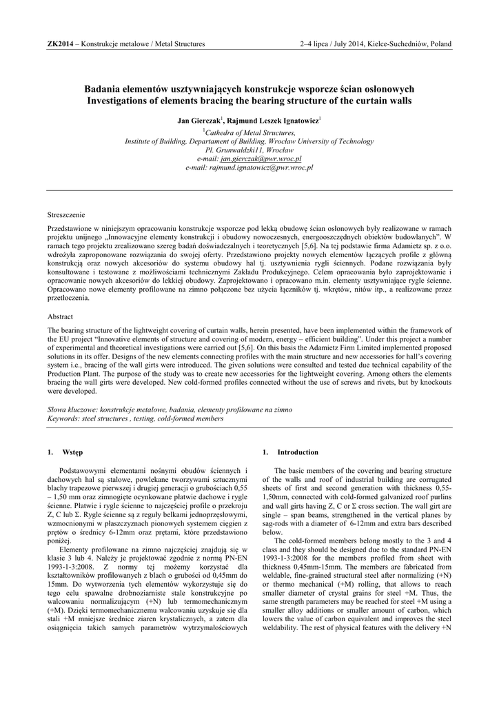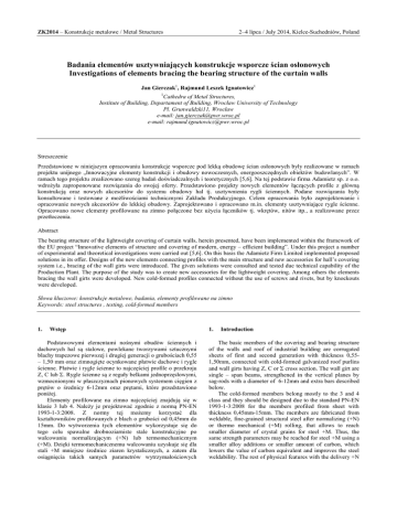 ZK2014 – Konstrukcje metalowe / Metal Structures 2–4 lipca / July 2014, Kielce-Suchedniów, Poland Badania elementów usztywniających konstrukcje wsporcze ścian osłonowych Investigations of elements bracing the bearing structure of the curtain walls Jan Gierczak1, Rajmund Leszek Ignatowicz1 1 Cathedra of Metal Structures, Institute of Building, Departament of Building, Wrocław University of Technology Pl. Grunwaldzki11, Wrocław e-mail: [email protected] e-mail: [email protected] Streszczenie Przedstawione w niniejszym opracowaniu konstrukcje wsporcze pod lekką obudowę ścian osłonowych były realizowane w ramach projektu unijnego „Innowacyjne elementy konstrukcji i obudowy nowoczesnych, energooszczędnych obiektów budowlanych”. W ramach tego projektu zrealizowano szereg badań doświadczalnych i teoretycznych [5,6]. Na tej podstawie firma Adamietz sp. z o.o. wdrożyła zaproponowane rozwiązania do swojej oferty. Przedstawiono projekty nowych elementów łączących profile z główną konstrukcją oraz nowych akcesoriów do systemu obudowy hal tj. usztywnienia rygli ściennych. Podane rozwiązania były konsultowane i testowane z możliwościami technicznymi Zakładu Produkcyjnego. Celem opracowania było zaprojektowanie i opracowanie nowych akcesoriów do lekkiej obudowy. Zaprojektowano i opracowano m.in. elementy usztywniające rygle ścienne. Opracowano nowe elementy profilowane na zimno połączone bez użycia łączników tj. wkrętów, nitów itp., a realizowane przez przetłoczenia. Abstract The bearing structure of the lightweight covering of curtain walls, herein presented, have been implemented within the framework of the EU project “Innovative elements of structure and covering of modern, energy – efficient building”. Under this project a number of experimental and theoretical investigations were carried out [5,6]. On this basis the Adamietz Firm Limited implemented proposed solutions in its offer. Designs of the new elements connecting profiles with the main structure and new accessories for hall’s covering system i.e., bracing of the wall girts were introduced. The given solutions were consulted and tested due technical capability of the Production Plant. The purpose of the study was to create new accessories for the lightweight covering. Among others the elements bracing the wall girts were developed. New cold-formed profiles connected without the use of screws and rivets, but by knockouts were developed. Słowa kluczowe: konstrukcje metalowe, badania, elementy profilowane na zimno Keywords: steel structures , testing, cold-formed members 1. Wstęp Podstawowymi elementami nośnymi obudów ściennych i dachowych hal są stalowe, powlekane tworzywami sztucznymi blachy trapezowe pierwszej i drugiej generacji o grubościach 0,55 – 1,50 mm oraz zimnogięte ocynkowane płatwie dachowe i rygle ścienne. Płatwie i rygle ścienne to najczęściej profile o przekroju Z, C lub Σ. Rygle ścienne są z reguły belkami jednoprzęsłowymi, wzmocnionymi w płaszczyznach pionowych systemem cięgien z prętów o średnicy 6-12mm oraz prętami, które przedstawiono poniżej. Elementy profilowane na zimno najczęściej znajdują się w klasie 3 lub 4. Należy je projektować zgodnie z normą PN-EN 1993-1-3:2008. Z normy tej możemy korzystać dla kształtowników profilowanych z blach o grubości od 0,45mm do 15mm. Do wytworzenia tych elementów wykorzystuje się do tego celu spawalne drobnoziarniste stale konstrukcyjne po walcowaniu normalizującym (+N) lub termomechanicznym (+M). Dzięki termomechanicznemu walcowaniu uzyskuje się dla stali +M mniejsze średnice ziaren krystalicznych, a zatem dla osiągnięcia takich samych parametrów wytrzymałościowych 1. Introduction The basic members of the covering and bearing structure of the walls and roof of industrial building are corrugated sheets of first and second generation with thickness 0,551,50mm, connected with cold-formed galvanized roof purlins and wall girts having Z, C or Σ cross section. The wall girt are single – span beams, strengthened in the vertical planes by sag-rods with a diameter of 6-12mm and extra bars described below. The cold-formed members belong mostly to the 3 and 4 class and they should be designed due to the standard PN-EN 1993-1-3:2008 for the members profiled from sheet with thickness 0,45mm-15mm. The members are fabricated from weldable, fine-grained structural steel after normalizing (+N) or thermo mechanical (+M) rolling, that allows to reach smaller diameter of crystal grains for steel +M. Thus, the same strength parameters may be reached for steel +M using a smaller alloy additions or smaller amount of carbon, which lowers the value of carbon equivalent and improves the steel weldability. The rest of physical features with the delivery +N ZK2014 – Konstrukcje metalowe / Metal Structures 2–4 lipca / July 2014, Kielce-Suchedniów, Poland można w przypadku stali +M stosować mniej dodatków stopowych lub mniej węgla, co wpływa na obniżenie wartości równoważnika węgla i polepszenie spawalności metalurgicznej tej stali. Pozostałe cechy fizyczne stali z dostawą +N i +M nie ulegają zmianie. Nośność przekroju wyznacza się redukując ściskane półki wg teorii szerokości współpracującej Wintera w zależności od smukłości półki i naprężeń panujących w danym przekroju. Rozróżniamy pracę w stanie krytycznym i w stanie nadkrytycznym. W stanie krytycznym rozkład naprężeń jest liniowy, natomiast w stanie nadkrytycznym rozkład ten jest nieliniowy. Spowodowane jest to lokalnym wyboczeniem półek ściskanych. Sposób redukcji przekroju oraz zasady obliczeń podają m.in. autorzy [1-6]. 2. Badania elementów usztywniających Dla zadanych i opisanych schematów statycznych badano poszczególne elementy konstrukcji wsporczej. Opracowano nowe elementy tj. słupki ściskane. Słupki są wykonane z blachy ocynkowanej i profilowane na zimno. Dodatkowo wprowad