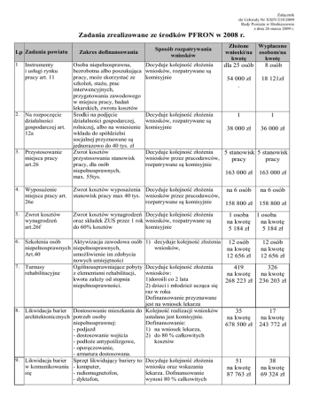 Załącznik do Uchwały Nr XXIV/218/2009 Rady Powiatu w Hrubieszowie z dnia 26 marca 2009 r. Zadania zrealizowane ze środków PFRON w 2008 r. Lp Zadania powiatu 1 2. 3. 4. 5. 6. Instrumenty i usługi rynku pracy art. 11 Na rozpoczęcie działalności gospodarczej art. 12a Przystosowanie miejsca pracy art.26 Zakres dofinansowania Osoba niepełnosprawna, bezrobotna albo poszukująca pracy, może skorzystać ze szkoleń, stażu, prac interwencyjnych, przygotowania zawodowego w miejscu pracy, badań lekarskich, zwrotu kosztów Środki na podjęcie działalności gospodarczej, rolniczej, albo na wniesienie wkładu do spółdzielni socjalnej przyznawane są jednorazowo do 40 tys. zł Zwrot kosztów przystosowania stanowisk pracy, dla osób niepełnosprawnych, max. 55tys. Sposób rozpatrywania wniosków Złożone Wypłacono wnioski/na osobom/na kwotę kwotę Decyduje kolejność złożenia wniosków, rozpatrywane są komisyjnie dla 25 osób 8 osób 54 000 zł . 18 121zł Decyduje kolejność złożenia wniosków, rozpatrywane są komisyjnie 1 1 38 000 zł 36 000 zł Decyduje kolejność złożenia 5 stanowisk 5 stanowisk wniosków przez pracodawców, pracy pracy rozpatrywane są komisyjnie 163 000 zł 163 000 zł Wyposażenie miejsca pracy art. 26e Zwrot kosztów wyposażenia Decyduje kolejność złożenia na 6 osób stanowisk pracy max 40 tys. wniosków przez pracodawców, rozpatrywane są komisyjnie 158 800 zł na 6 osób Zwrot kosztów wynagrodzeń art.26f Zwrot kosztów wynagrodzeń Decyduje kolejność złożenia oraz składek ZUS przez 1 rok wniosków, rozpatrywane są do 60% kosztów komisyjnie Szkolenia osób Aktywizacja zawodowa osób niepełnosprawnych niepełnosprawnych, Art.40 umożliwienie im zdobycia nowych umiejętności 7. Turnusy Ogólnousprawniające pobyty rehabilitacyjne z elementami rehabilitacji, kwota zależy od stopnia niepełnosprawności. 1) decyduje kolejność złożenia wniosków, Decyduje kolejność złożenia wniosków: 1)dorośli co 2 lata 2) dzieci i młodzież ucząca się raz w roku Dofinansowanie przyznawane jest na wniosek lekarza 8. Likwidacja barier Dostosowanie mieszkania do Kolejność realizacji wniosków architektonicznych potrzeb osoby ustalana jest komisyjnie. niepełnosprawnej: Dofinansowanie: - podjazd 1) na wniosek lekarza, - dostosowanie wejścia 2) do 80 % całkowitych - podłoże antypoślizgowe, kosztów - oporęczowanie, - armatura dostosowana. 9. Likwidacja barier Sprzęt likwidujący bariery to: Decyduje kolejność złożenia w komunikowaniu - komputer, wniosku oraz wskazania się - radiomagnetofon, lekarza. Dofinansowanie - dyktafon, wynosi 80 % całkowitych 158 800 zł 1 osoba 1 osoba na kwotę na kwotę 5 184 zł 5 184 zł 12 osób na kwotę 12 656 zł 12 osób na kwotę 12 656 zł 419 na kwotę 268 223 zł 326 na kwotę 236 203 zł 35 na kwotę 678 500 zł 17 na kwotę 243 772 zł 51 na kwotę 87 763 zł 38 na kwotę 69 324 zł - telefon, telefon komórkowy. kosztów 10. Likwidacja barier technicznych Sprzęt AGD i techniczny ułatwiający funkcjonowanie: - pralka automatyczna, - kuchnia elektryczna, - kuchenka mikrofalowa, - robot wielofunkcyjny - pompy insulinowe, Decyduje kolejność złożenia wniosku oraz wskazanie lekarza. Dofinansowanie wynosi 80 % całkowitych kosztów 52 na kwotę 89 738 zł 35 Na kwotę 53 107 zł 11 Sport, kultura Imprezy kulturalno-sportowe, 1) wnioski składają 24 340 osób/10 rekreacja i wycieczki, konkursy, Stowarzyszenia do 30 listopada stowarzy- stowarzyturystyka osób spotkania okolicznościowe. roku poprzedzającego szeń szeń niepełnosprawnych 2) 60 % kosztów na kwotę na kwotę 73 083 zł 12. Sprzęt Sprzęt służący rehabilitacji rehabilitacyjny, w warunkach domowych środki zalecany przez lekarza ortopedyczne specjalistę: rowerek i pomocnicze rehabilitacyjny, materac do ćwiczeń, rotor, hantle, masażer do stóp, łóżka rehabilitacyjne, urządzenie do hydromasażu i ozonoterapii, sprzęt ortopedyczny, pieluchomajtki, materace i poduszki przeciwodleżynowe, aparaty słuchowe, wózki inwalidzkie, laski, kule, pionizatory, łuski, ortezy, gorsety, protezy 13. Dofinansowanie WTZ jest placówką pobytu bieżącej dziennego dla 111osób działalności trzech niepełnosprawnych, która Warsztatów realizuje zadania z zakresu Terapii Zajęciowej rehabilitacji społecznej i zawodowej osób niepełnosprawnych. Decyduje kolejność złożenia 466 wniosku oraz zalecenie lekarza specjalisty. Dofinansowanie 423 934zł wynosi do 60% wartości sprzętu rehabilitacyjnego. W przypadku sprzętu ortopedycznego decyduje kolejność złożenia wniosku oraz potwierdzone dofinansowanie Narodowego Funduszu Zdrowia. Dofinansowanie uzależnione jest od limitu przyznanego przez Narodowy Fundusz Zdrowia i maksymalnie wynosi 150% limitu przyznanego na dany sprzęt. Dofinansowanie do bieżącej 95% działalności WTZ zgodnie z 1 488 954 zł ustawą wynosi 95 % ogólnych kosztów, które finansuje 5% PFRON oraz 5%, które 165 439,34zł finansuje samorząd powiatowy . ze środków własnych lub innych źródeł, np. samorząd gminy 14. Środki na obsługę Wynagrodzenie osób Na obsługę realizowanych realizowanych zajmujących się obsługą zadań urząd otrzymuje 2,5 % 71 784 zł zadań zadań, art. biurowe, od ogólnych środków szkolenia, delegacje, opłata wydatkowanych na realizację za konserwację windy, koszty zadań umowy zlecenia Inspektora Nadzoru Budowlanego RAZEM : 14 652 zł 415 371 518 zł 95%1 488 954 zł 5%165439,34zł. 71 783 zł. 2 943 074 zł