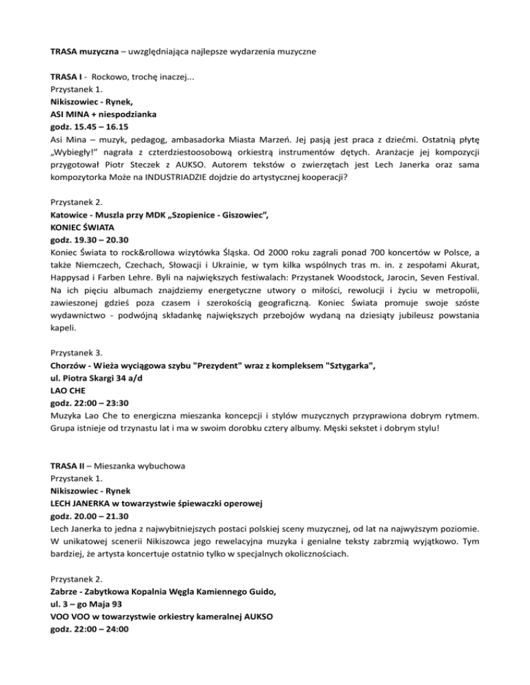 TRASA muzyczna – uwzględniająca najlepsze wydarzenia muzyczne TRASA I ‐ Rockowo, trochę inaczej... Przystanek 1. Nikiszowiec ‐ Rynek, ASI MINA + niespodzianka godz. 15.45 – 16.15 Asi Mina – muzyk, pedagog, ambasadorka Miasta Marzeń. Jej pasją jest praca z dziećmi. Ostatnią płytę „Wybiegły!” nagrała z czterdziestoosobową orkiestrą instrumentów dętych. Aranżacje jej kompozycji przygotował Piotr Steczek z AUKSO. Autorem tekstów o zwierzętach jest Lech Janerka oraz sama kompozytorka Może na INDUSTRIADZIE dojdzie do artystycznej kooperacji? Przystanek 2. Katowice ‐ Muszla przy MDK „Szopienice ‐ Giszowiec”, KONIEC ŚWIATA godz. 19.30 – 20.30 Koniec Świata to rock&rollowa wizytówka Śląska. Od 2000 roku zagrali ponad 700 koncertów w Polsce, a także Niemczech, Czechach, Słowacji i Ukrainie, w tym kilka wspólnych tras m. in. z zespołami Akurat, Happysad i Farben Lehre. Byli na największych festiwalach: Przystanek Woodstock, Jarocin, Seven Festival. Na ich pięciu albumach znajdziemy energetyczne utwory o miłości, rewolucji i życiu w metropolii, zawieszonej gdzieś poza czasem i szerokością geograficzną. Koniec Świata promuje swoje szóste wydawnictwo ‐ podwójną składankę największych przebojów wydaną na dziesiąty jubileusz powstania kapeli. Przystanek 3. Chorzów ‐ Wieża wyciągowa szybu "Prezydent" wraz z kompleksem "Sztygarka", ul. Piotra Skargi 34 a/d LAO CHE godz. 22:00 – 23:30 Muzyka Lao Che to energiczna mieszanka koncepcji i stylów muzycznych przyprawiona dobrym rytmem. Grupa istnieje od trzynastu lat i ma w swoim dorobku cztery albumy. Męski sekstet i dobrym stylu! TRASA II – Mieszanka wybuchowa Przystanek 1. Nikiszowiec ‐ Rynek LECH JANERKA w towarzystwie śpiewaczki operowej godz. 20.00 – 21.30 Lech Janerka to jedna z najwybitniejszych postaci polskiej sceny muzycznej, od lat na najwyższym poziomie. W unikatowej scenerii Nikiszowca jego rewelacyjna muzyka i genialne teksty zabrzmią wyjątkowo. Tym bardziej, że artysta koncertuje ostatnio tylko w specjalnych okolicznościach. Przystanek 2. Zabrze ‐ Zabytkowa Kopalnia Węgla Kamiennego Guido, ul. 3 – go Maja 93 VOO VOO w towarzystwie orkiestry kameralnej AUKSO godz. 22:00 – 24:00 Ani VOO VOO ani AUKSO przedstawiać nie trzeba. Ambitne granie to znak rozpoznawczy obydwu grup, w Zabrzu przedstawią utwory z płyty „21” nagranej wspólnie pod dyrekcją Marka Mosia. Przystanek 3. Chorzów ‐ Wieża wyciągowa szybu "Prezydent" wraz z kompleksem "Sztygarka” ŁONA & WEBBER ul. Piotra Skargi 34 a/d godz. 00:00 – 01:30 „Łona i Webber czyli niesztampowy raper i klasyczny producent.” – tak mówią sami o sobie. I coś w tym musi być, bowiem ten szczeciński duet od ponad dekady intryguje, ciekawi i bawi hip‐hopową publiczność. Jeśli chcesz posłuchać ambitnych tekstów i świetnych rytmów – wybierz się koniecznie! UWAGA! Liczba osób ograniczona – maksymalnie 300. TRASA III – Elektronika Przystanek 1. Chorzów – Wieża wyciągowa szybu "Prezydent" wraz z kompleksem "Sztygarka, ul. Piotra Skargi 34 a/d CLAPHAM SOUND godz. 19:30 – 20:15 Dynamiczne elektro w bajkowej atmosferze – tak w skrócie określić można styl muzyczny śląskiej grupy Clapham South. Dobra zabawa i dużo energii gwarantowane! Przystanek 3. Tychy ‐ Pub Tyskiego Browarium, ul. Mikołowska 5 GABA KULKA Godz. 21.00 Elektryzujący koncert jednej z najciekawszych polskich wokalistek, zdobywczyni Paszportu Polityki. UWAGA! Impreza biletowana. Cena biletu: 35 zł. Liczba miejsc ograniczona.