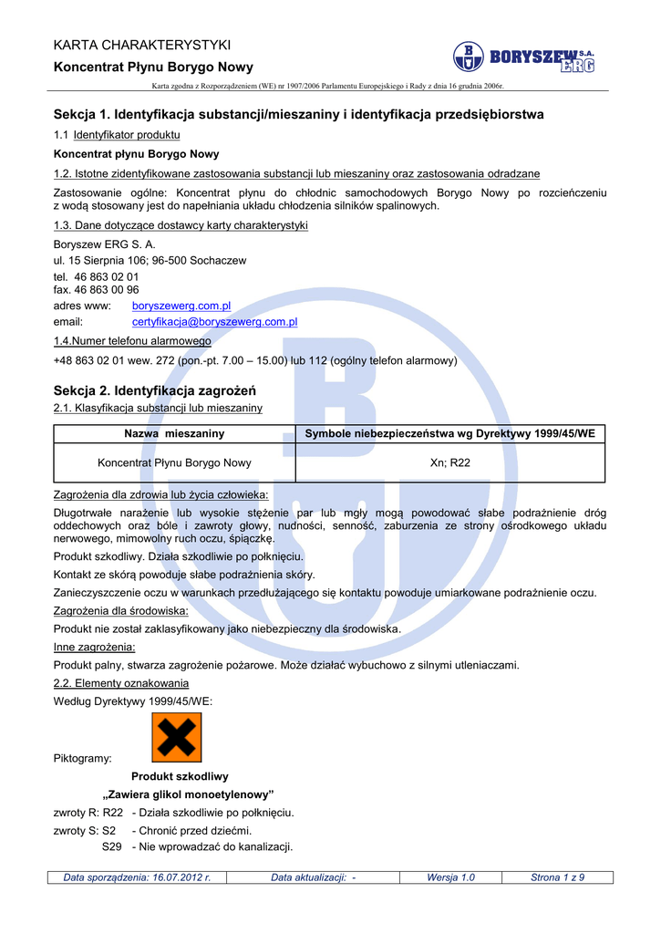 KARTA CHARAKTERYSTYKI Koncentrat Płynu Borygo Nowy Karta zgodna z Rozporządzeniem (WE) nr 1907/2006 Parlamentu Europejskiego i Rady z dnia 16 grudnia 2006r. Sekcja 1. Identyfikacja substancji/mieszaniny i identyfikacja przedsiębiorstwa 1.1 Identyfikator produktu Koncentrat płynu Borygo Nowy 1.2. Istotne zidentyfikowane zastosowania substancji lub mieszaniny oraz zastosowania odradzane Zastosowanie ogólne: Koncentrat płynu do chłodnic samochodowych Borygo Nowy po rozcieńczeniu z wodą stosowany jest do napełniania układu chłodzenia silników spalinowych. 1.3. Dane dotyczące dostawcy karty charakterystyki Boryszew ERG S. A. ul. 15 Sierpnia 106; 96-500 Sochaczew tel. 46 863 02 01 fax. 46 863 00 96 adres www: boryszewerg.com.pl email: [email protected] 1.4.Numer telefonu alarmowego +48 863 02 01 wew. 272 (pon.-pt. 7.00 – 15.00) lub 112 (ogólny telefon alarmowy) Sekcja 2. Identyfikacja zagrożeń 2.1. Klasyfikacja substancji lub mieszaniny Nazwa mieszaniny Symbole niebezpieczeństwa wg Dyrektywy 1999/45/WE Koncentrat Płynu Borygo Nowy Xn; R22 Zagrożenia dla zdrowia lub życia człowieka: Długotrwałe narażenie lub wysokie stężenie par lub mgły mogą powodować słabe podrażnienie dróg oddechowych oraz bóle i zawroty głowy, nudności, senność, zaburzenia ze strony ośrodkowego układu nerwowego, mimowolny ruch oczu, śpiączkę. Produkt szkodliwy. Działa szkodliwie po połknięciu. Kontakt ze skórą powoduje słabe podrażnienia skóry. Zanieczyszczenie oczu w warunkach przedłużającego się kontaktu powoduje umiarkowane podrażnienie oczu. Zagrożenia dla środowiska: Produkt nie został zaklasyfikowany jako niebezpieczny dla środowiska. Inne zagrożenia: Produkt palny, stwarza zagrożenie pożarowe. Może działać wybuchowo z silnymi utleniaczami. 2.2. Elementy oznakowania Według Dyrektywy 1999/45/WE: Piktogramy: Produkt szkodliwy „Zawiera glikol monoetylenowy” zwroty R: R22 - Działa szkodliwie po połknięciu. zwroty S: S2 - Chronić przed dziećmi. S29 - Nie wprowadzać do kanalizacji. Data sporządzenia: 16.07.2012 r. Data aktualizacji: - Wersja 1.0 Strona 1 z 9 KARTA CHARAKTERYSTYKI Koncentrat Płynu Borygo Nowy Karta zgodna z Rozporządzeniem (WE) nr 1907/2006 Parlamentu Europejskiego i Rady z dnia 16 grudnia 2006r. S 36/37 - Nosić odpowiednią odzież ochronną i odpowiednie rękawice ochronne. S 46 - W razie połknięcia niezwłocznie zasięgnij porady lekarza – pokaż opakowanie lub etykietę. 2.3. Inne zagrożenia Brak informacji na temat spełnienia kryteriów PBT lub vPvB zgodnie z załącznikiem XIII rozporządzenia REACH. Odpowiednie badania nie były przeprowadzone. Sekcja 3. Skład / informacje o składnikach 3.1. Substancje Nie dotyczy 3.2. Mieszanina Symbole niebezpieczeństwa*** Nazwa substancji Zakres stężeń [%] Numer CAS Numer WE Glikol etylenowy* < 93 107-21-1 Tetraboran disodu** < 2,5 12179-04-3 Dyrektywa 67/548/EWG Rozporządzenie (WE) 1272/2008 203-473-3 Xn; R22 Acute Tox. 4; H302 STOT Rep. Exp.2;H373 215-540-4 Repr.Cat 2; R60-61 Xi; R36 Repr. 1B; H360 FD Eye Irrit 2; H319 * Numer rejestracji dla glikolu etylenowego: 01-2119456816-28-0004 ** Numer rejestracji dla Tetraboranu disodu 01-2119490790-32-XXXX *** patrz sekcja 16 Sekcja 4. Środki pierwszej pomocy 4.1. Opis środków pierwszej pomocy Połknięcie: w razie połknięcia sprowokować wymioty, podać do wypicia ok.100ml wódki (40%) lub innego podobnego napoju alkoholowego. Wezwać natychmiast pomoc lekarską. Wdychanie: przy wystąpieniu trudności z oddychaniem podawać tlen. Wynieść poszkodowanego na świeże powietrze. Skóra: przemyć wodą z mydłem. Oczy: natychmiast przemyć oczy dużą ilością bieżącej wody przy szeroko otwartych powiekach. 4.2. Najważniejsze ostre i opóźnione objawy oraz skutki narażenia W pierwszym okresie zatrucia po połknięciu występują objawy podobne do stanu upojenia alkoholowego: stan pobudzenia, zaburzenia mowy, zaburzenia równowagi i koordynacji ruchów, bóle i zawroty głowy, senność itp. Następnie występują nudności i wymioty, biegunka. Może wystąpić zaburzenia oddychania. W przypadku ciężkich zatruć zaburzenia krążenia, przyspieszenie akcji serca, spadek ciśnienia krwi, śpiączka, utrata przytomności z drgawkami, zapaść. Możliwa śmierć z powodu zatrzymania oddychania. Dawka śmiertelna dla człowieka wynosi 100 ml. Kontakt ze skórą powoduje słabe podrażnienie skóry. Zanieczyszczenie oczu powoduje umiarkowane podrażnienie oczu przy przedłużającym się kontakcie. Skutkiem przewlekłego narażenia jest nasilenie występujących dolegliwości skórnych, oczu, dróg oddechowych. Może powodować zaburzenia i uszkodzenia nerek i wątroby, możliwe uszkodzenia mózgu. 4.3. Wskazania dotyczące wszelkiej natychmiastowej pomocy lekarskiej i szczególnego postępowania z poszkodowanym. Osobie nieprzytomnej nie podawać niczego doustnie i nie prowokować wymiotów. Personelowi medycznemu udzielającemu pomocy pokazać kartę charakterystyki, etykietę lub opakowanie. Leczenie zatrucia glikolem etylenowym, odpowiednio do stanu chorego, powinno obejmować: - płukanie żołądka w czasie do 2 godzin od zatrucia, zwalczanie zaburzeń krążeniowo-oddechowych, podanie alkoholu etylenowego (dożylnie we wlewie kroplowym 5-15% roztwór alkoholu etylenowego w 5% glukozie). W przypadku ciężkich zatruć stosować hemodializę, diurezę. ( dane z sekcji 4 dotyczą 100% glikolu etylenowego) Data sporządzenia: 16.07.2012 r. Data aktualizacji: - Wersja 1.0 Strona 2 z 9 KARTA CHARAKTERYSTYKI Koncentrat Płynu Borygo Nowy Karta zgodna z Rozporządzeniem (WE) nr 1907/2006 Parlamentu Europejskiego i Rady z dnia 16 grudnia 2006r. Sekcja 5. Postępowanie w przypadku pożaru 5.1. Środki gaśnicze Odpowiednie środki gaśnicze: dwutlenek węgla, proszki gaśnicze, piany odporne na alkohol, woda. Nieodpowiednie środki gaśnicze: nie są znane. 5.2. Szczególne zagrożenia związane z produktem Produkt palny. W 