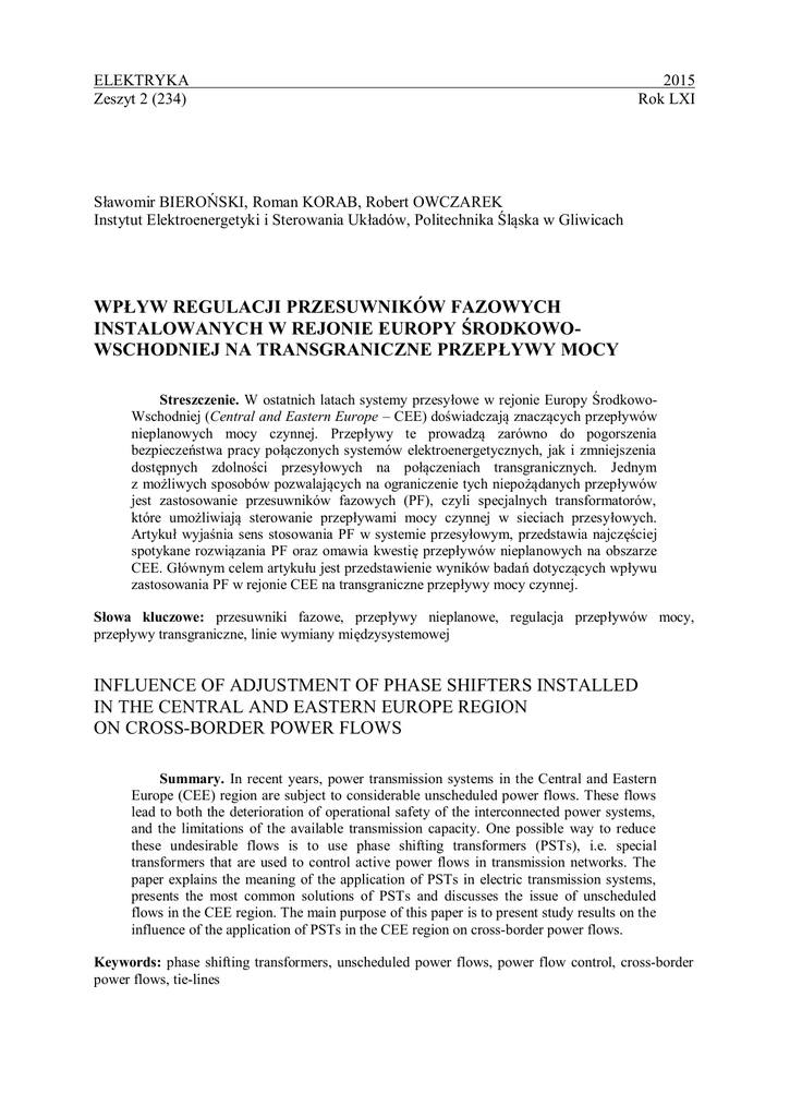 ELEKTRYKA Zeszyt 2 (234) 2015 Rok LXI Sławomir BIEROŃSKI, Roman KORAB, Robert OWCZAREK Instytut Elektroenergetyki i Sterowania Układów, Politechnika Śląska w Gliwicach WPŁYW REGULACJI PRZESUWNIKÓW FAZOWYCH INSTALOWANYCH W REJONIE EUROPY ŚRODKOWOWSCHODNIEJ NA TRANSGRANICZNE PRZEPŁYWY MOCY Streszczenie. W ostatnich latach systemy przesyłowe w rejonie Europy ŚrodkowoWschodniej (Central and Eastern Europe – CEE) doświadczają znaczących przepływów nieplanowych mocy czynnej. Przepływy te prowadzą zarówno do pogorszenia bezpieczeństwa pracy połączonych systemów elektroenergetycznych, jak i zmniejszenia dostępnych zdolności przesyłowych na połączeniach transgranicznych. Jednym z możliwych sposobów pozwalających na ograniczenie tych niepożądanych przepływów jest zastosowanie przesuwników fazowych (PF), czyli specjalnych transformatorów, które umożliwiają sterowanie przepływami mocy czynnej w sieciach przesyłowych. Artykuł wyjaśnia sens stosowania PF w systemie przesyłowym, przedstawia najczęściej spotykane rozwiązania PF oraz omawia kwestię przepływów nieplanowych na obszarze CEE. Głównym celem artykułu jest przedstawienie wyników badań dotyczących wpływu zastosowania PF w rejonie CEE na transgraniczne przepływy mocy czynnej. Słowa kluczowe: przesuwniki fazowe, przepływy nieplanowe, regulacja przepływów mocy, przepływy transgraniczne, linie wymiany międzysystemowej INFLUENCE OF ADJUSTMENT OF PHASE SHIFTERS INSTALLED IN THE CENTRAL AND EASTERN EUROPE REGION ON CROSS-BORDER POWER FLOWS Summary. In recent years, power transmission systems in the Central and Eastern Europe (CEE) region are subject to considerable unscheduled power flows. These flows lead to both the deterioration of operational safety of the interconnected power systems, and the limitations of the available transmission capacity. One possible way to reduce these undesirable flows is to use phase shifting transformers (PSTs), i.e. special transformers that are used to control active power flows in transmission networks. The paper explains the meaning of the application of PSTs in electric transmission systems, presents the most common solutions of PSTs and discusses the issue of unscheduled flows in the CEE region. The main purpose of this paper is to present study results on the influence of the application of PSTs in the CEE region on cross-border power flows. Keywords: phase shifting transformers, unscheduled power flows, power flow control, cross-border power flows, tie-lines 8 S. Bieroński, R. Korab, R. Owczarek 1. WPROWADZENIE W ostatnich latach w regionie Europy Środkowo-Wschodniej (Central and Eastern Europe – CEE) obserwuje się silny wzrost tzw. przepływów karuzelowych (kołowych), czyli nieplanowych przepływów wyrównawczych mocy czynnej między systemami przesyłowymi poszczególnych państw. Do podstawowych przyczyn nasilania się tego zjawiska należy dynamiczny rozwój generacji ze źródeł odnawialnych w Niemczech oraz nienadążający za nim rozwój sieci elektroenergetycznych. Przepływy nieplanowe wykorzystują znaczącą część fizycznych zdolności przesyłowych połączeń transgranicznych w regionie CEE (szczególnie linii wymiany systemu polskiego), ograniczając tym samym ilość mocy przesyłowych udostępnianych uczestnikom rynku, zainteresowanym międzysystemowym handlem energią. Mogą powodować również wzrost strat przesyłowych w pewnych obszarach, pogorszając tym samym ekonomikę pracy sieci. Jednakże znacznie poważniejszą konsekwencją tej sytuacji jest fakt, że ze względu na swój charakter przepływy nieplanowe prowadzą do pogorszenia bezpieczeństwa pracy systemu połączonego, w tym bezpieczeństwa funkcjonowania Krajowego Systemu Elektroenergetycznego (KSE) [22]. Podstawowym kryterium wykorzystywanym w analizach bezpieczeństwa pracy systemu elektroenergetycznego jest kryterium n-1, które mówi, że system powinien pracować z takimi marginesami bezpieczeństwa, aby po wyłączeniu dowolnego z jego elementów składowych (linii, transformatora, sekcji szyn zbiorczych, generatora itd.), pozostałe w ruchu elementy były w stanie przejąć obciążenie elementu wyłączonego, bez przekroczenia obowiązujących ograniczeń technicznych. W sytuacji przeciwnej może dojść do kaskadowych wyłączeń kolejnych elementów systemu, prowadzących w skrajnym przypadku do awarii katastrofalnej (blackoutu). Międzysystemowe przepływy mocy czynnej powodują zwiększenie obciążenia poszczególnych elementów sieci, w szczególności gałęzi znajdujących się w pobliżu granic dwóch obszarów. W związku z tym, aby zagwarantować bezpieczeństwo pracy systemów połączonych, konieczne jest utrzymywanie przepływów międzysystemowych poniżej wartości dopuszczalnych. W przypadku systemu polskiego newralgicznym przekrojem jest przekrój zachodni, na którym obserwuje się ciągły wzrost niekontrolowanych przepływów mocy czynnej z systemu niemieckiego. W związku z opisaną sytuacją, operatorzy systemów przesyłowych (OSP) w CEE podejmują odpowiednie działania, zmierzające do zmniejszenia negatywnego wpływu przepływów nieplanowych na warunki pracy sieci w regionie. Obejmują one rekonfigurację sieci poprzez dokonywanie odpowiednich przełączeń (otwieranie sprzęgieł w stacjach lub wyłączenie wybranych linii NN), zmianę grafików pracy jednostek wytwórczych w systemie polskim lub w systemach polskim i niemieckim (tzw. cross-border redispatching, czyli transgraniczne przekierowanie mocy) oraz zastosowanie tzw. pętli stałoprądowej (DC Loop), czyli przesyłanie mocy z Niemiec do Polski przez Danię i Szwecję z wykorzystanie połączeń Wpływ regulacji przesuwników fazowych… 9 stałoprądowych Polska – Szwecja i Dania – Niemcy [20]. Pomimo stosowania tych środków zaradczych, coraz częściej zdarzają się sytuacje, w których środki te stają się niewystarczające do zachowania bezpiecz