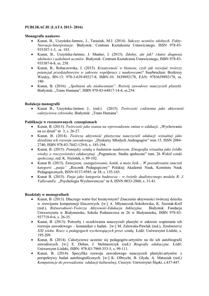 PUBLIKACJE (LATA 2013- 2016) Monografie naukowe Kunat, B., Uszyńska-Jarmoc, J., Tarasiuk, M.J. (2014). Sukcesy uczniów zdolnych. FaktyNarracje-Interpretacje. Białystok: Centrum Kształcenia Ustawicznego, ISSN 978-83935387-1-3, ss. 183. Kunat, B., Uszyńska-Jarmoc, J. Mantur, J. (2015). Zdolny, ale jak? (Auto) diagnoza zdolności i uzdolnień uczniów. Białystok: Centrum Kształcenia Ustawicznego, ISBN 978-83935387-6-8, ss. 258. Kunat, B., Robaczewska, J. (2015). Kreatywność w biznesie, czyli jak rozwijać twórczy potencjał przedsiębiorców w zakresie współpracy z naukowcami? Saarbrucken: Bezkresy Wiedzy, BN-13: 978-3-639-89217-8, ISBN-10: 3639892178, EAN: 9783639892178, ss. 180. Kunat, B. (2016). „Spełnieni ale niedoceniani”. Rozwój zawodowy nauczycieli plastyki. Białystok: „Trans Humana”, ISBN 978-83-64817-14-4, ss.254. Redakcja monografii Kunat B., Uszyńska-Jarmoc J., (red.) (2015). Twórczość codzienna jako aktywność całożyciowa człowieka. Białystok: „Trans Humana”. Publikacje w recenzowanych czasopismach Kunat, B. (2013). Twórczość jako szansa na wprowadzenie zmian w edukacji. „Wychowanie na co dzień” nr 3, s. 26-27. Kunat, B. (2014). Twórcza aktywność plastyczna nauczycieli edukacji wizualnej jako dziedzina ich rozwoju zawodowego. „Dyskursy Młodych Andragogów” tom 15, ISSN 20842740, ISBN 978-83-7842-129-0, s. 185-194. Kunat, B. (2015). Pomiędzy sztuką a badaniem naukowym. Etnografia wizualna jako źródło wiedzy o rzeczywistości edukacyjnej. „Pogranicze. Studia społeczne” tom. 26 Wokół sztuki społecznej, red. K. Niziołek, s. 89-102. Kunat B. (2015). Entuzjazm, zaangażowanie, konik, a może bzik… W poszukiwaniu znaczeń kategorii „pasja” „Rocznik Pedagogiczny” Polskiej Akademii Nauk, Komitetu Nauk Pedagogicznych, ISNN 0137-9585, nr 38, s. 155-165. Kunat B. (2015). Pasja jako kategoria badawcza - w świetle dualistycznego modelu R. J. Vallerand'a. „Psychologia Wychowawcza” nr 8, ISNN 0033-2860, s. 31-41. Rozdziały w monografiach Kunat, B. (2013). Dlaczego warto być kreatywnym? Znaczenie aktywności twórczej dziecka w rozwijaniu kompetencji kluczowych. [w:] A. Młynarczuk-Sokołowska, K. Szostak-Król (red.), Różnorodność-Twórcza Aktywność-Edukacja Inkluzyjna. Białystok: Fundacja Uniwersytetu w Białymstoku, Szkoła Podstawowa nr 26 w Białymstoku, ISBN 978-83937718-0-6, s. 26-35. Kunat, B. (2013). Potrzeby i oczekiwania nauczycieli plastyki w zakresie wspierania ich rozwoju zawodowego – komunikat z badań. [w:] M. Zalewska-Pawlak (red.), Sztukmistrze XXI wieku. Rzecz o pedagogach wychowujących przez sztukę. Łódź: Uniwersytet Łódzki, s. 195-209. Kunat, B. (2014). Całożyciowe uczenie się pedagogów-artystów na tle ich autobiografii zawodowych. [w:] E. Dubas, J. Stelmaszczyk (red.) Biografie edukacyjne. Łódź: Uniwersytet Łódzki, ISBN: 978-83-7969-353-5, s. 99-111. Kunat, B. (2014). Specyfika rozwoju zawodowego nauczycieli plastyki-artystów z perspektywy badań autobiograficznych. [w:] K. Olbrycht, B. Głyda, A. Matusiak (red.) Kompetencje do prowadzenia edukacji kulturalnej, Cieszyn: Uniwersytet Śląski, s.437-447. Kunat, B. (2014). Teoria i praktyka pedagogiczna z perspektywy autobiografii zawodowych nauczycieli edukacji wizualnej. [w:] M. Kowalczuk-Walędziak, A. Korzeniecka-Bondar, K. Bocheńska-Włostowska (red.), Twórcze wiązanie teorii i praktyki pedagogicznej – możliwości, wyzwania, inspiracje, „Impuls”, Kraków, 978-83-78-50-335-4, s. 81-92. Kunat, B. (2015). Rozwój zawodowy nauczycieli plastyki. [w:] Sztuka i edukacja. Sztuki wizualne, A. Boguszewska, B. Niścior (red.), Lublin: Wydział Artystyczny, UMCS, ISBN 978-83-6528-901-8, s. 75-88. Kunat B. (2015). Pasja jako źródło twórczości codziennej człowieka. [w:] J. UszyńskaJarmoc, B. Kunat (red.), Twórczość codzienna jako aktywność całożyciowa człowieka. Białystok: „Trans Humana”, s. 94-103. Kunat, B., Uszyńska-Jarmoc, J. (2015). Twórczość codzienna człowieka – dylematy, pytania, nadzieje. [w:] J. Uszyńska-Jarmoc, B. Kunat (red.), Twórczość codzienna jako aktywność całożyciowa człowieka. Białystok: „Trans Humana”, s. 9-20. Kunat B. (2015). Entuzjazm, zaangażowanie, konik, a może bzik… W poszukiwaniu znaczeń kategorii „pasja”. [w:] Opowiem wam o swojej pasji: słowem, obrazem, dźwiękiem…, XIX Zeszyt Forum Młodych Pedagogów przy KNP PAN (red.) D. Bis, K. Braun, M. Jeziorański, Lublin: Wyd. Academicon, ISBN 978-83-62475-13-1, s. 19 – 31. Kunat B., Korzeniecka-Bondar A., Szorc K. (w druku), Przestrzeń miasta Białystok z perspektywy mieszkańca – w poszukiwaniu miejsc znaczących. [w:] E. Dubas, A. Gutowska (red.) Biografie edukacyjne. Łódź: Uniwersytet Łódzki. Kunat B. (w druku). „Dzielenie się czasem wolnym z uczniem” czyli o pracy nauczycieli z pasją. [w:] E. Dubas, A. Gutowska (red.) Biografie edukacyjne. Łódź: Uniwersytet Łódzki. Publikacje metodyczne Kunat B. (2014). Rozwijanie twórczego potencjału ucznia z perspektywy pedagogiki twórczości. Publikacja przygotowane w ramach projektu „Opracowanie i wdrożenie kompleksowego systemu pracy z uczniem zdolnym” – moduł Model Szkolnego Systemu Wspierania Zdolności – Kreatywny uczeń – kreatywny nauczyciel – kreatywna szkoła na zlecenie Ośrodka Rozwoju Edukacji [publikacja online www.ore.edu. pl dodana 31.10.2014].