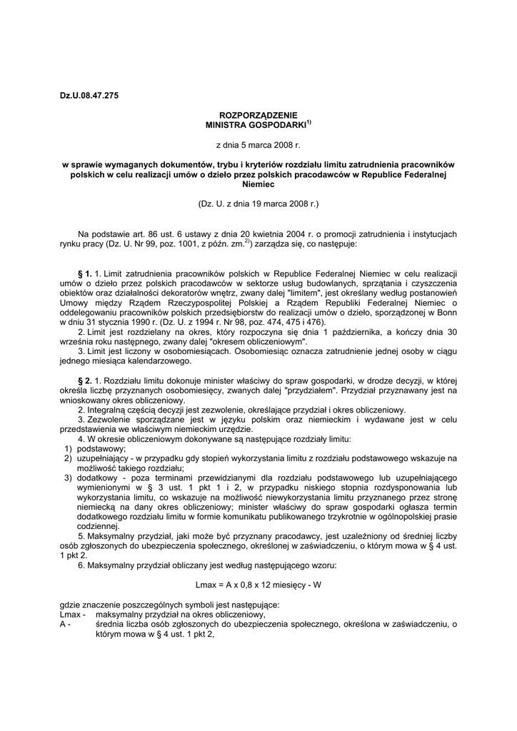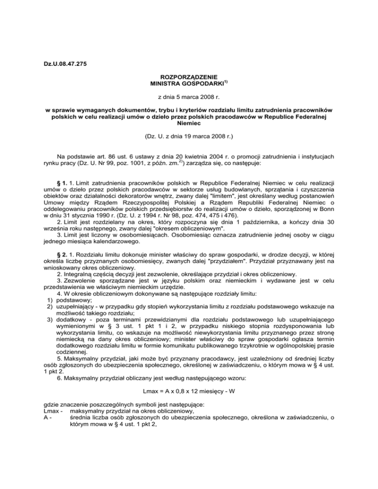 Dz.U.08.47.275 ROZPORZĄDZENIE MINISTRA GOSPODARKI1) z dnia 5 marca 2008 r. w sprawie wymaganych dokumentów, trybu i kryteriów rozdziału limitu zatrudnienia pracowników polskich w celu realizacji umów o dzieło przez polskich pracodawców w Republice Federalnej Niemiec (Dz. U. z dnia 19 marca 2008 r.) Na podstawie art. 86 ust. 6 ustawy z dnia 20 kwietnia 2004 r. o promocji zatrudnienia i instytucjach rynku pracy (Dz. U. Nr 99, poz. 1001, z późn. zm.2)) zarządza się, co następuje: § 1. 1. Limit zatrudnienia pracowników polskich w Republice Federalnej Niemiec w celu realizacji umów o dzieło przez polskich pracodawców w sektorze usług budowlanych, sprzątania i czyszczenia obiektów oraz działalności dekoratorów wnętrz, zwany dalej "limitem", jest określany według postanowień Umowy między Rządem Rzeczypospolitej Polskiej a Rządem Republiki Federalnej Niemiec o oddelegowaniu pracowników polskich przedsiębiorstw do realizacji umów o dzieło, sporządzonej w Bonn w dniu 31 stycznia 1990 r. (Dz. U. z 1994 r. Nr 98, poz. 474, 475 i 476). 2. Limit jest rozdzielany na okres, który rozpoczyna się dnia 1 października, a kończy dnia 30 września roku następnego, zwany dalej "okresem obliczeniowym". 3. Limit jest liczony w osobomiesiącach. Osobomiesiąc oznacza zatrudnienie jednej osoby w ciągu jednego miesiąca kalendarzowego. § 2. 1. Rozdziału limitu dokonuje minister właściwy do spraw gospodarki, w drodze decyzji, w której określa liczbę przyznanych osobomiesięcy, zwanych dalej "przydziałem". Przydział przyznawany jest na wnioskowany okres obliczeniowy. 2. Integralną częścią decyzji jest zezwolenie, określające przydział i okres obliczeniowy. 3. Zezwolenie sporządzane jest w języku polskim oraz niemieckim i wydawane jest w celu przedstawienia we właściwym niemieckim urzędzie. 4. W okresie obliczeniowym dokonywane są następujące rozdziały limitu: 1) podstawowy; 2) uzupełniający - w przypadku gdy stopień wykorzystania limitu z rozdziału podstawowego wskazuje na możliwość takiego rozdziału; 3) dodatkowy - poza terminami przewidzianymi dla rozdziału podstawowego lub uzupełniającego wymienionymi w § 3 ust. 1 pkt 1 i 2, w przypadku niskiego stopnia rozdysponowania lub wykorzystania limitu, co wskazuje na możliwość niewykorzystania limitu przyznanego przez stronę niemiecką na dany okres obliczeniowy; minister właściwy do spraw gospodarki ogłasza termin dodatkowego rozdziału limitu w formie komunikatu publikowanego trzykrotnie w ogólnopolskiej prasie codziennej. 5. Maksymalny przydział, jaki może być przyznany pracodawcy, jest uzależniony od średniej liczby osób zgłoszonych do ubezpieczenia społecznego, określonej w zaświadczeniu, o którym mowa w § 4 ust. 1 pkt 2. 6. Maksymalny przydział obliczany jest według następującego wzoru: Lmax = A x 0,8 x 12 miesięcy - W gdzie znaczenie poszczególnych symboli jest następujące: Lmax - maksymalny przydział na okres obliczeniowy, Aśrednia liczba osób zgłoszonych do ubezpieczenia społecznego, określona w zaświadczeniu, o którym mowa w § 4 ust. 1 pkt 2, W- suma osobomiesięcy, jaką pracodawca wykorzystał na realizację umów o dzieło w rozpatrywanym okresie obliczeniowym na podstawie poprzednio uzyskanych zezwoleń przez zarejestrowanie we właściwym niemieckim urzędzie; w przypadku gdy termin ważności poprzednio udzielonych zezwoleń nie upłynął, uznaje się, że pracodawca wykorzystał cały przyznany przydział. 7. Jeżeli maksymalny przydział, obliczony w sposób określony w ust. 6, jest wyższy od wnioskowanego przez pracodawcę, minister właściwy do spraw gospodarki przyznaje wnioskowany przydział. § 3. 1. Przydział jest przyznawany na wniosek pracodawcy, zwany dalej "wnioskiem", składany do ministra właściwego do spraw gospodarki w następujących terminach: 1) od dnia 1 czerwca do dnia 31 sierpnia każdego roku - w ramach rozdziału podstawowego; 2) od dnia 1 stycznia do dnia 28 lutego roku następnego - w ramach rozdziału uzupełniającego; 3) wskazanych w komunikacie ministra właściwego do spraw gospodarki - w ramach rozdziału dodatkowego. 2. Wzór wniosku określa załącznik do rozporządzenia. § 4. 1. Do wniosku pracodawca załącza następujące dokumenty: 1) kserokopię odpisu z Krajowego Rejestru Sądowego lub innego właściwego rejestru stwierdzającego status oraz przedmiot przedsiębiorstwa; 2) zaświadczenie właściwej terenowej jednostki organizacyjnej Zakładu Ubezpieczeń Społecznych stwierdzające średnią liczbę osób zgłoszonych do ubezpieczenia społecznego w okresie ostatnich 12 miesięcy poprzedzających złożenie wniosku oraz zaświadczenie o niezaleganiu z opłacaniem składek na ubezpieczenia społeczne; 3) zaświadczenie wydane przez naczelnika właściwego urzędu skarbowego o niezaleganiu w podatkach; 4) oświadczenie o znajomości zasad i przepisów związanych z realizacją umów o dzieło w Republice Federalnej Niemiec, zawierające nazwę pracodawcy oraz imię i nazwisko osoby składającej to oświadczenie; 5) informację o rodzaju prac, jakie pracodawca zamierza realizować w ramach umów o dzieło w Republice Federalnej Niemiec; 6) kserokopię decyzji właściwego urzędu skarbowego w sprawie nadania numeru identyfikacji podatkowej NIP. 2. Dokumenty, o których mowa w ust. 1 pkt 1-3, powinny być opatrzone podpisem i imienną pieczęcią pracodawcy oraz zawierać klauzulę "Przedkładam jako załącznik do wniosku z dnia ..... ". 3. Dokumenty, o których mowa w ust. 1 pkt 1-3, zachowują ważność przez okres 3 miesięcy od daty wydania, jeżeli z ich treści nie wynika inna data ważności. § 5. 1. Decyzja, o której mowa w § 2 ust. 1, może być wydana, jeżeli pracodawca spełnia łącznie następujące warunki: 1) prowadził na terenie kraju działalność gospodarczą przez okres co najmniej jednego roku poprzedzającego złożenie wniosku; 2) nie posiada zaległości podatkowyc