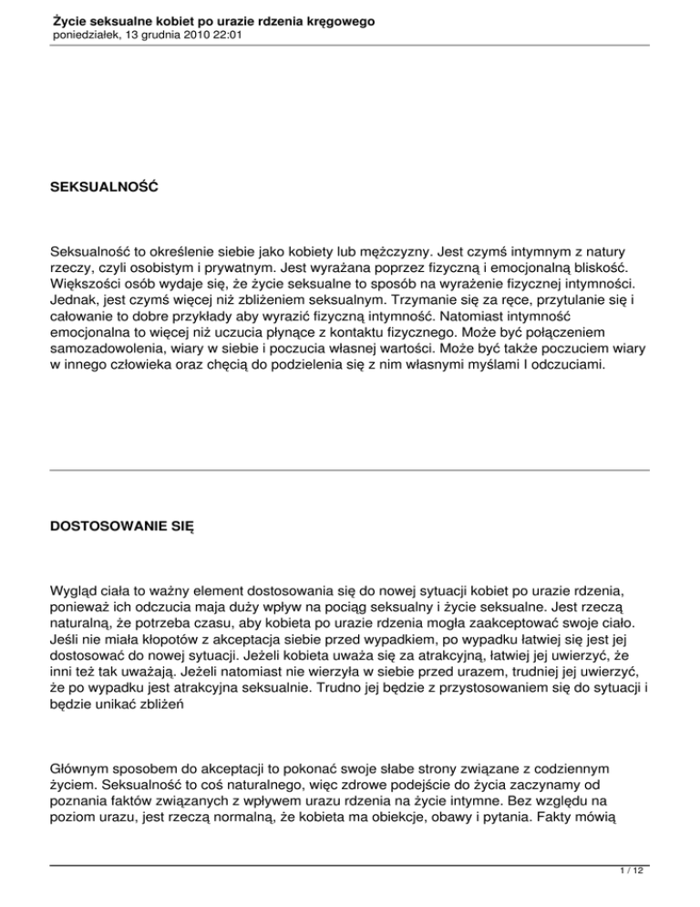 Życie seksualne kobiet po urazie rdzenia kręgowego poniedziałek, 13 grudnia 2010 22:01 SEKSUALNOŚĆ Seksualność to określenie siebie jako kobiety lub mężczyzny. Jest czymś intymnym z natury rzeczy, czyli osobistym i prywatnym. Jest wyrażana poprzez fizyczną i emocjonalną bliskość. Większości osób wydaje się, że życie seksualne to sposób na wyrażenie fizycznej intymności. Jednak, jest czymś więcej niż zbliżeniem seksualnym. Trzymanie się za ręce, przytulanie się i całowanie to dobre przykłady aby wyrazić fizyczną intymność. Natomiast intymność emocjonalna to więcej niż uczucia płynące z kontaktu fizycznego. Może być połączeniem samozadowolenia, wiary w siebie i poczucia własnej wartości. Może być także poczuciem wiary w innego człowieka oraz chęcią do podzielenia się z nim własnymi myślami I odczuciami. DOSTOSOWANIE SIĘ Wygląd ciała to ważny element dostosowania się do nowej sytuacji kobiet po urazie rdzenia, ponieważ ich odczucia maja duży wpływ na pociąg seksualny i życie seksualne. Jest rzeczą naturalną, że potrzeba czasu, aby kobieta po urazie rdzenia mogła zaakceptować swoje ciało. Jeśli nie miała kłopotów z akceptacja siebie przed wypadkiem, po wypadku łatwiej się jest jej dostosować do nowej sytuacji. Jeżeli kobieta uważa się za atrakcyjną, łatwiej jej uwierzyć, że inni też tak uważają. Jeżeli natomiast nie wierzyła w siebie przed urazem, trudniej jej uwierzyć, że po wypadku jest atrakcyjna seksualnie. Trudno jej będzie z przystosowaniem się do sytuacji i będzie unikać zbliżeń Głównym sposobem do akceptacji to pokonać swoje słabe strony związane z codziennym życiem. Seksualność to coś naturalnego, więc zdrowe podejście do życia zaczynamy od poznania faktów związanych z wpływem urazu rdzenia na życie intymne. Bez względu na poziom urazu, jest rzeczą normalną, że kobieta ma obiekcje, obawy i pytania. Fakty mówią 1 / 12 Życie seksualne kobiet po urazie rdzenia kręgowego poniedziałek, 13 grudnia 2010 22:01 same za siebie. Kobiety po urazie rdzenia: - są atrakcyjne; - mają możliwość poznawania ludzi , zakochania się i wyjścia za mąż; - mają możliwość przeżycia pierwszych doświadczeń seksualnych; - mają potrzeby seksualne; - maja możliwość dawać i otrzymywać przyjemność; - mogą i cieszą się aktywnym życiem seksualnym; oraz - mogą zajść w ciążę i mieć dzieci. Kobiety, które akceptują te fakty, mogą mieć pytania związane ze związkiem kobiety i mężczyzny. Prościej mówiąc, kobiety które są chętne poznawać ludzi maja większą szansę na związek. Nie jest ważne kto kogo poprosi o spotkanie, odpowiedź może być "tak" lub "nie". Kobiety, które są już w związku, mogą się zastanawiać czy zdołają go utrzymać. W rzeczywistości nie jest możliwe aby zapewnić sukces w jakimkolwiek związku. Zależy to bowiem od wielu czynników takich jak wspólne zainteresowania, wzajemna komunikacja, uczucia, i dopasowanie się do siebie. Jeśli brać to pod uwagę to połowa wszystkich małżeństw kończy się rozwodami, co znaczy tyle, że bez względu czy kobieta jest po urazie rdzenia czy nie, utrzymanie związku nie jest proste. Kiedy kobieta po urazie jest w stałym związku, musi pamiętać, że ich partnerzy także muszą zrozumieć wszystkie fakty związane z seksualnością. Gdy partner zrozumie wszystkie ważne aspekty, dostosowanie się przychodzi łatwiej dla każdego. Kobiety i ich partnerzy mogą rozmawiać o problemach i rozwiązywać je, jest to dobry sposób na budowanie fizycznego i emocjonalnego związku. 2 / 12 Życie seksualne kobiet po urazie rdzenia kręgowego poniedziałek, 13 grudnia 2010 22:01 Podczas gdy kobiety i ich partnerzy pracują nad pokonywaniem problemów, ważne jest, aby zrozumieć, że przystosowanie seksualne zajmuje trochę czasu. Mogą wystąpić obawy związane ze współżyciem wraz z nieoczekiwanymi kłopotami różnego rodzaju. Jeśli para skoncentruje się na wspólnym celu, może rozwiązać każdy problem. WSPÓŁŻYCIE SEKSUALNE Dla kobiety normalne podniecenie seksualne objawia się przez nawilżenie pochwy, powiększenie się łechtaczki, zwiększenie pracy serca, przyśpieszone oddychanie i zwiększone ciśnienie krwi1. To są typowe objawy jakie zachodzą po pobudzeniu seksualnym psychicznym i fizycznym. Pobudzenie psychiczne to stymulujące myśli, odruch, natomiast fizyczne to na przykład dotyk czy pocałunek. Chociaż kobieta po urazie rdzenia może współżyć, to sposób jej odczuwania i odruchów zależy w dużej mierze od rodzaju i wysokości urazu rdzenia2. Większość kobiet po urazie zachowa fizyczną zdolność do współżycia, lecz utraci psychiczne odruchy. Jakkolwiek kobiety które mają czucie na wysokości tali (T11) i na wysokości ud (L-2) mają większą zdolność do odczuwania bodźców seksualnych3. U niektórych kobiet największy znaczący wpływ urazu na współżycie seksualne ma brak wydzieliny w pochwie. Wydzielina ta pomaga w łatwiejszej penetracji, a jej brak powoduje uszkodzenia i ból podczas współżycia. Można jednak zastosować preparaty zastępujące naturalną wydzielinę pochwy na bazie wody. Nie należy nigdy stosować nawilżaczy na bazie oleju. Większość kobiet po urazie traci częściowo lub całkowicie czucie w pochwie i kontrolę nad mięśniami. Utrata czucia w pochwie powoduje, że odczucia fizyczne u kobiet po urazie są inne niż u zdrowych. Utrata kontroli nad mięśniami uniemożliwia kurczeniu się mięśni pochwy i w rezultacie mniejszą zdolność pobudzania podczas stosunku. Można to poprawić poprzez stosowanie różnych pozycji przy współżyciu. Przy nasileniu się problemu należy zasięgnąć 3 / 12 Życie seksualne kobiet po urazie rdzenia kręgowego poniedziałek, 13 grudnia 2010 22:01 porady lekarza. PODNIECENIE SEKSUALNE Podniecenie seksualne jest procesem stymulacji i przygotowaniem do współżyc