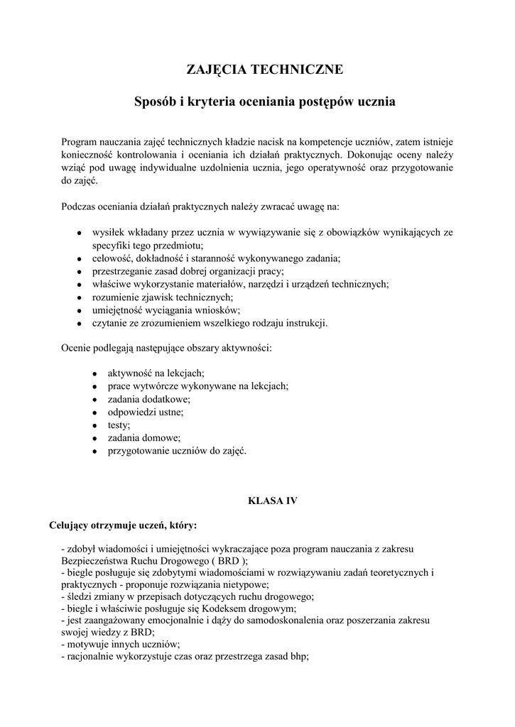 ZAJĘCIA TECHNICZNE Sposób i kryteria oceniania postępów ucznia Program nauczania zajęć technicznych kładzie nacisk na kompetencje uczniów, zatem istnieje konieczność kontrolowania i oceniania ich działań praktycznych. Dokonując oceny należy wziąć pod uwagę indywidualne uzdolnienia ucznia, jego operatywność oraz przygotowanie do zajęć. Podczas oceniania działań praktycznych należy zwracać uwagę na: wysiłek wkładany przez ucznia w wywiązywanie się z obowiązków wynikających ze specyfiki tego przedmiotu; celowość, dokładność i staranność wykonywanego zadania; przestrzeganie zasad dobrej organizacji pracy; właściwe wykorzystanie materiałów, narzędzi i urządzeń technicznych; rozumienie zjawisk technicznych; umiejętność wyciągania wniosków; czytanie ze zrozumieniem wszelkiego rodzaju instrukcji. Ocenie podlegają następujące obszary aktywności: aktywność na lekcjach; prace wytwórcze wykonywane na lekcjach; zadania dodatkowe; odpowiedzi ustne; testy; zadania domowe; przygotowanie uczniów do zajęć. KLASA IV Celujący otrzymuje uczeń, który: - zdobył wiadomości i umiejętności wykraczające poza program nauczania z zakresu Bezpieczeństwa Ruchu Drogowego ( BRD ); - biegle posługuje się zdobytymi wiadomościami w rozwiązywaniu zadań teoretycznych i praktycznych - proponuje rozwiązania nietypowe; - śledzi zmiany w przepisach dotyczących ruchu drogowego; - biegle i właściwie posługuje się Kodeksem drogowym; - jest zaangażowany emocjonalnie i dąży do samodoskonalenia oraz poszerzania zakresu swojej wiedzy z BRD; - motywuje innych uczniów; - racjonalnie wykorzystuje czas oraz przestrzega zasad bhp; - odnosi sukcesy w konkursach BRD. Bardzo dobry otrzymuje uczeń, który: - podczas wykonywania typowych zadań teoretycznych i praktycznych wykazuje się dużą samodzielnością, starannością, sumiennością oraz odpowiedzialnością w działaniu; - opanował pełny zakres wiedzy określonej programem nauczania dotyczący BRD; - w pełni wykorzystuje wiadomości i umiejętności do rozwiązywania zadań problemowych; - potrafi w praktyce zastosować poznane wiadomości dotyczące zasad ruchu drogowego; - umiejętnie posługuje się Kodeksem drogowym; - opanował bezbłędnie technikę jazdy na rowerze; - prace wytwórcze wykonuje zgodne z projektem; - zna i stosuje podczas pracy zasady bezpieczeństwa i higieny; - bardzo chętnie prezentuje zdobytą wiedzę na forum klasy. Dobry otrzymuje uczeń, który: - podczas wykonywania typowych zadań teoretycznych i praktycznych wykazuje zaangażowanie i samodzielność w działaniu, jest staranny i systematyczny; - opanował w dużym zakresie wiedzę określoną programem nauczania w zakresie BRD; - wykorzystuje zdobyte wiadomości i umiejętności do samodzielnego rozwiązywania typowych zadań; - jego prace są estetyczne lecz zawierają drobne niedociągnięcia; - właściwie korzysta z Kodeksu drogowego; - zna i stosuje zasady bezpieczeństwa i higieny pracy. Dostateczny otrzymuje uczeń, który: - podczas wykonywania typowych zadań teoretycznych i praktycznych podejmuje próby samodzielnego rozwiązywania zadań, rozwiązuje zadania o średnim stopniu trudności; - opanował minimum zakresu wiedzy określonej programem nauczania z zakresu BRD; - ma problem z zastosowaniem w praktyce poznanych wiadomości dotyczących zasad ruchu drogowego; - opanował w stopniu podstawowym technikę jazdy na rowerze; - prace wytwórcze wykonuje niedokładnie i mało estetycznie; - czasami korzysta z Kodeksu drogowego; - mało efektywnie wykorzystuje czas pracy; - stosuje zasady bezpieczeństwa i higieny pracy. Dopuszczający otrzymuje uczeń, który: - podczas wykonywania zadań teoretycznych i praktycznych musi być nakłaniany i mobilizowany do pracy przez nauczyciela, wykonuje zadanie niedokładnie i nieestetycznie; - ma braki wiedzy w zakresie podstawowych treści określonych programem nauczania; - przy pomocy nauczyciela rozwiązuje zadania o niewielkim stopniu trudności; - rzadko korzysta z Kodeksu drogowego; - ma trudności z poprawną organizacją pracy. Niedostateczny otrzymuje uczeń, który: - podczas wykonywania zadań teoretycznych i praktycznych nie wykazuje chęci do pracy, jest niesamodzielny oraz nie potrafi organizować pracy; - nie opanował minimum wiedzy określonej programem nauczania, co uniemożliwia zdobycie karty rowerowej; - nie jest w stanie wykonać najprostszych zadań; - nie przestrzega zasad bezpiecznej i higienicznej pracy. KLASA V -VI Wymagania na poszczególne oceny: Celujący – uczeń wykazuje biegłość w posługiwaniu się zakresem wiadomości przewidzianych dla danej klasy, wprowadza własne rozwiązania racjonalizatorskie, osiąga sukcesy w konkursach lub wystawach prac wytwórczych, rozpoznaje sytuacje techniczne, potrafi rozwiązywać sytuacje techniczne, właściwie wykonuje czynności związane z użytkowaniem wytworów techniki, opanował umiejętności i wiadomości wykraczające poza te, które są przewidziane dla danej klasy, właściwie organizuje stanowisko pracy. Potrafi rozpoznać, zapobiegać i likwidować negatywne skutki działań człowieka w środowisku. Bardzo dobry – uczeń opanował w pełni treści programowe dla danej klasy, samodzielnie wyjaśnia zjawiska, procesy i zależności techniczne. Wykorzystuje wiedzę przy wykonywaniu zadań wytwórczych. Poprawnie, systematycznie i estetycznie wykonuje dokumentację techniczną ( zeszyt przedmiotowy, zeszyt ćwiczeń i rysunki ), właściwie organizuje stanowisko pracy. Oszczędnie gospodaruje materiałami. Poprawnie wykorzystuje do pracy dokumentację techniczną oraz poznane operacje technologiczne. Rozpoznaje, ocenia i stosuje w pracach wytwórczych poznane materiały. Prace wytwórcze wykonuje starannie, zgodnie z rysunkami. Rozpoznaje, zapobiega i likwiduje negatywne skutki działania człowieka w środowisku. Dobry – uczeń nie opanował w pełni treści przedmiotowych or