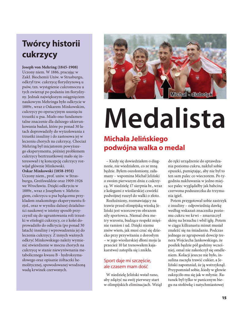 Twórcy historii cukrzycy Joseph von Mehring (1845-1908) Uczony niem. W 1886, pracując w Zakł. Biochemii Uniw. w Strasburgu, odkrył tzw. cukrzycę florydzynową u psów, tzn. wystąpienie cukromoczu u tych zwierząt po podaniu im florydzyny. Jednak największym osiągnięciem naukowym Mehringa było odkrycie w 1889r., wraz z Oskarem Minkowskim, cukrzycy po operacyjnym usunięciu trzustki u psa. Miało ono fundamentalne znaczenie dla dalszego ukierunkowania badań, które po ponad 30 latach doprowadziły do wyizolowania z trzustki insuliny i do zastosowa jej w leczeniu chorych na cukrzycę. Chociaż Mehring był inicjatorem powyższego eksperymentu, później problemem cukrzycy beztrzustkowej mało się interesował i tę koncepcję cukrzycy rozwijał głównie Minkowski. Oskar Minkowski (1858-1931) Uczony niem., prof. uniw. w Strasburgu, Greifswaldzie oraz 1909-1926 we Wrocławiu. Dzięki odkryciu w 1889r., wraz z Josephem v. Mehringiem, cukrzycu u psa będącemu przykładem znakomitego eksperymentu fizjol., oraz w wyniku dalszej działalności naukowej w istotny sposób przyczynił się do ugruntowania roli trzustki w etiologii cukrzycy, co z kolei doprowadziło do odkrycia (po ponad 30 latach) insuliny i wprowadzenia jej do leczenia cukrzycy. Z innych ważnych odkryć Minkowskiego należy wymienić stwierdzenie w moczu chorych na cukrzycę w stanie niewyrównania metabolicznego kwasu B - hydroksymasłowego oraz opisanie żółtaczki hemolitycznej, spowodowanej wrodzoną wadą krwinek czerwonych. Medalista Michała Jelińskiego podwójna walka o medal – Kiedy się dowiedziałem o diagnozie, nie wiedziałem, co ze mną będzie. Byłem oszołomiony, załamany – wspomina Michał Jeliński o swoim pierwszym dniu z cukrzycą. W niedzielę 17 sierpnia br., wraz z kolegami z wioślarskiej czwórki podwójnej ruszył do walki o złoto. Rozluźniony, rozmawiający na trawie przed olimpijską wioską Jeliński jest wzorcowym obrazem siły sportowca. Niemal dwa metry wzrostu, budzące respekt mięśnie ramion i ud. Dzięki niemu znów wiem, jak musi czuć się dziecko przy przywitaniu z dorosłym – w jego wioślarskiej dłoni moja (a przecież 10 lat trenowałem kajakarstwo) zatopiła się i znikła. Sport daje mi szczęście, ale czasem mam dość W niedzielę Jeliński wstał rano, aby zdążyć na swój pierwszy start w olimpijskich eliminacjach. Wziął do ręki urządzenie do sprawdzania poziomu cukru, nakłuł sobie opuszki, pamiętając, aby nie był to ten sam palec co wieczorem. Po tygodniu nakłuwania w jedno miejsce palec wyglądałby jak babcina czerwona poduszeczka do trzymania igieł. Potem przygotował sobie zastrzyk z insuliny – odpowiednią dawkę według wskazań znacznika poziomu cukru we krwi – zmarszczył skórę na brzuchu i wbił igłę. Potem w ciągu kilkunastu minut musiał znaleźć się na śniadaniu. Podczas jednego ze zgrupowań dowcip trenera Wojciecha Jankowskiego, że posiłek będzie pół godziny wcześniej, omal nie zakończył się omdleniem. Kolacji jeszcze nie było, insulina zaczęła trawić cukier, a Jeliński zapomniał, że ją wstrzyknął. Przypomniał sobie, kiedy w głowie zakręciło mu się jak w młynie. Ratunek był tylko w panicznym biegu na stołówkę i natychmiastowej 15 Nagrody Nobla za badania dotyczące cukrzycy i przemiany węglowodanów * 1923 Frederic Grant Banting (1891-1941) i John James R. MacLeod (1876-1935) Kanada, za odkrycie insuliny. Podzielili się nagrodą z najbardziej w tym odkryciu zasłużonymi współpracownikami. Banting przekazał połowę otrzymanej nagrody prowadzącemu z nim od początku badania młodemu absolwentowi biochemii – Charlesowi Herbertowi Bestowi (1899- 1978), zaś MacLeod – chemikowi Jamesowi Bertramowi Collipowi (1892-1965) za wkład w oczyszczenie pierwszych preparatów insuliny. misce deserów, najszybszym źródle cukru. Złożona procedura pomiarów i zastrzyków powtarzała się przed zejściem czwórki na wodę i pierwszym startem na podpekińskim torze Shunyi. A także przed obiadem, przed kolacją – na posiłkach musi oszacować ilość węglowodanów, aby wiedzieć, na ile czasu zastrzyk powinien działać – i przed snem. Na zgrupowaniach dochodzi jeszcze seria przed popołudniowym treningiem. Zwykle jest to O tej chorobie nie można przestać myśleć, bo inaczej powoli, niezauważalnie zniszczy organizm. Na trening Jeliński zabiera ze sobą do łódki energetyczne batony, odżywki z glukozą, aby w krytycznym momencie móc zareagować. Koledzy są przygotowani, choć jeszcze ani razu nie zdarzyło się, aby na treningu Jeliński omdlał z powodu obniżenia poziomu cukru. Czasami treningi polegają na tym, że osada płynie 45 sekund szalonym tempem, potem ma 15 pięć zastrzyków dziennie z insuliną działająca natychmiastowo i dwa wstrzykiwane w udo o działaniu długoterminowym. Siedem zastrzyków, dzień w dzień. Około 2000-2400 w roku. – Już dawno zapomniałem o tym, że igły są jednorazowe. Ile ich musiałbym wziąć na trzymiesięczny wyjazd? – mówi Jeliński. Oprócz tego wszystkiego trzy, cztery razy w roku powinien meldować się w szpitalu na kilkudniowe szkolenie połączone z leczeniem. sekund przerwy i znów przedłużony sprint, jak mawiają wioślarze: „w trupa”. I jeszcze raz. Takie morderstwo na własnym organizmie, cięższe niż sam wyścig na 2000m, powoduje, że organizm wyrzuca nadmiary cukru do krwi. Wtedy niemiłosiernie zaczynają szczypać oczy. I na to nie ma rady, trzeba dotrwać do końca mordęgi. Po niej organizm sam się reguluje. – Obowiązkowość mnie męczy. Czasem mam dość. Trudno jest żyć cukrzykowi, a co dopiero mnie, sportowcowi – mówi Jeliński. – Nie mogę się od tego uwolnić na- * 1947 Carl Ferdinand Cori (1896- 1984) i Gerty Theresa Cori (1896-1957)USA, za badania wyjaśniające strukturę i przemianę glikogenu Bernardo Alberto Houssay (1887-1971) Argentyna, za odkrycie w przysadce hormonu pogarsza
