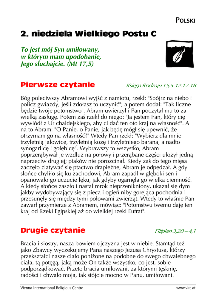 Polski To jest mój Syn umiłowany, w którym mam upodobanie, Jego słuchajcie. (Mt 17,5) Bóg poleciwszy Abramowi wyjść z namiotu, rzekł: "Spójrz na niebo i policz gwiazdy, jeśli zdołasz to uczynić"; a potem dodał: "Tak liczne będzie twoje potomstwo". Abram uwierzył i Pan poczytał mu to za wielką zasługę. Potem zaś rzekł do niego: "Ja jestem Pan, który cię wywiódł z Ur chaldejskiego, aby ci dać ten oto kraj na własność". A na to Abram: "O Panie, o Panie, jak będę mógł się upewnić, że otrzymam go na własność?" Wtedy Pan rzekł: "Wybierz dla mnie trzyletnią jałowicę, trzyletnią kozę i trzyletniego barana, a nadto synogarlicę i gołębicę". Wybrawszy to wszystko, Abram poprzerąbywał je wzdłuż na połowy i przerąbane części ułożył jedną naprzeciw drugiej; ptaków nie porozcinał. Kiedy zaś do tego mięsa zaczęło zlatywać się ptactwo drapieżne, Abram je odpędzał. A gdy słońce chyliło się ku zachodowi, Abram zapadł w głęboki sen i opanowało go uczucie lęku, jak gdyby ogarnęła go wielka ciemność. A kiedy słońce zaszło i nastał mrok nieprzenikniony, ukazał się dym jakby wydobywający się z pieca i ogień niby gorejąca pochodnia i przesunęły się między tymi połowami zwierząt. Wtedy to właśnie Pan zawarł przymierze z Abramem, mówiąc: "Potomstwu twemu daję ten kraj od Rzeki Egipskiej aż do wielkiej rzeki Eufrat". Bracia i siostry, nasza bowiem ojczyzna jest w niebie. Stamtąd też jako Zbawcy wyczekujemy Pana naszego Jezusa Chrystusa, którzy przekształci nasze ciało poniżone na podobne do swego chwalebnego ciała, tą potęgą, jaką może On także wszystko, co jest, sobie podporządkować. Przeto bracia umiłowani, za którymi tęsknię, radości i chwało moja, tak stójcie mocno w Panu, umiłowani. Vienna International Religious Centre www.virc.at Jezus wziął z sobą Piotra, Jana i Jakuba i wyszedł na górę, aby się modlić. Gdy się modlił, wygląd Jego twarzy się odmienił, a Jego odzienie stało się lśniąco białe. A oto dwóch mężów rozmawiało z Nim. Byli to Mojżesz i Eliasz. Ukazali się oni w chwale i mówili o Jego odejściu, którego miał dokonać w Jerozolimie. Tymczasem Piotr i towarzysze snem byli zmorzeni. Gdy się ocknęli, ujrzeli Jego chwałę i obydwóch mężów, stojących przy Nim. Gdy oni odchodzili od Niego, Piotr rzekł do Jezusa: "Mistrzu, dobrze, że tu jesteśmy. Postawimy trzy namioty: jeden dla Ciebie, jeden dla Mojżesza i jeden dla Eliasza". Nie wiedział bowiem, co mówi. Gdy jeszcze to mówił, zjawił się obłok i osłonił ich; zlękli się, gdy weszli w obłok. A z obłoku odezwał się głos: "To jest mój Syn wybrany, Jego słuchajcie". W chwili, gdy odezwał się ten głos, Jezus znalazł się sam. A oni zachowali milczenie i w owym czasie nikomu nic nie oznajmili o tym, co widzieli. Czas postu jest czasem refleksji i przygotowania do Wielkanocy. Jednocześnie uchodzi za czas nawrócenia i nowego zorientowania na Boga. To, na czym polega owe nowe ukierunkowanie na Boga, nowa orientacja, jest wyjaśnione w dzisiejszych czytaniach. To, wokół czego orientujemy nasze życie nie tkwi w nas, lecz w Stworzeniu. Człowiekowi dany jest punkt odniesienia, który znajduje się poza nim, co prawda w tym świecie, ale nie z tego świata. Prawdziwy punkt orientacji dla ludzkiego życia może pochodzić tylko od Boga. Bóg jest tym, który obiecuje Abrahamowi przyszłość (potomstwo) i ojczyznę (kraj). Wierność Boga stanowi zasadę dla nadziei Abrahama, który z niewzruszoną wiarą otwiera się na wolę Boga. Na życiu chrześcijanina piętno powinno wywierać współuczestniczenie w cierpieniu i losie Ukrzyżowanego i Zmartwychwstałego. Jezus Chrystus jest zatem właściwym punktem odniesienia, a nie nasz "brzuch". W przemienieniu Jezusa uczniowie doświadczają cząstki Jego Boskiej chwały. Wybrany, Boży Syn daje życie, jeśli naszą drogę ukierunkowujemy według Jego drogi (Ewangelia). Uczniowie doświadczają również tego, że przemienienie nie może trwać na ziemi wiecznie. Podobnie jak oni i my chcemy zatrzymać to, co piękne i dostarczające wrażeń; chcemy zatrzymać się przy tym, co fascynujące i przyjemne. Na trudności naszej drogi i naszego otoczenia chętnie zamykamy oczy. Do pełnej blasku strony Zmartwychwstania przynależą jednak ciemne wydarzenia męki. Czas postu chce nam podarować możliwość dokładniejszego uświadomienia sobie ciemnych i jasnych stron naszego życia po to, aby mocniej związać się z naszym celem: z postawą wiary w Ukrzyżowanego i Zmartwychwstałego, który nas prowadzi – właśnie przez cierpienie – do wspaniałości przebywania z Bogiem. Vienna International Religious Centre [email protected] To jest mój Syn umiłowany, w którym mam upodobanie, Jego słuchajcie. (Mt 17,5) Bóg poleciwszy Abramowi wyjść z namiotu, rzekł: "Spójrz na niebo i policz gwiazdy, jeśli zdołasz to uczynić"; a potem dodał: "Tak liczne będzie twoje potomstwo". Abram uwierzył i Pan poczytał mu to za wielką zasługę. Potem zaś rzekł do niego: "Ja jestem Pan, który cię wywiódł z Ur chaldejskiego, aby ci dać ten oto kraj na własność". A na to Abram: "O Panie, o Panie, jak będę mógł się upewnić, że otrzymam go na własność?" Wtedy Pan rzekł: "Wybierz dla mnie trzyletnią jałowicę, trzyletnią kozę i trzyletniego barana, a nadto synogarlicę i gołębicę". Wybrawszy to wszystko, Abram poprzerąbywał je wzdłuż na połowy i przerąbane części ułożył jedną naprzeciw drugiej; ptaków nie porozcinał. Kiedy zaś do tego mięsa zaczęło zlatywać się ptactwo drapieżne, Abram je odpędzał. A gdy słońce chyliło się ku zachodowi, Abram zapadł w głęboki sen i opanowało go uczucie lęku, jak gdyby ogarnęła go wielka ciemność. A kiedy słońce zaszło i nastał mrok nieprzenikniony, ukazał się dym jakby wydobywający się z pieca i ogień niby gorejąca pochodnia i przesu