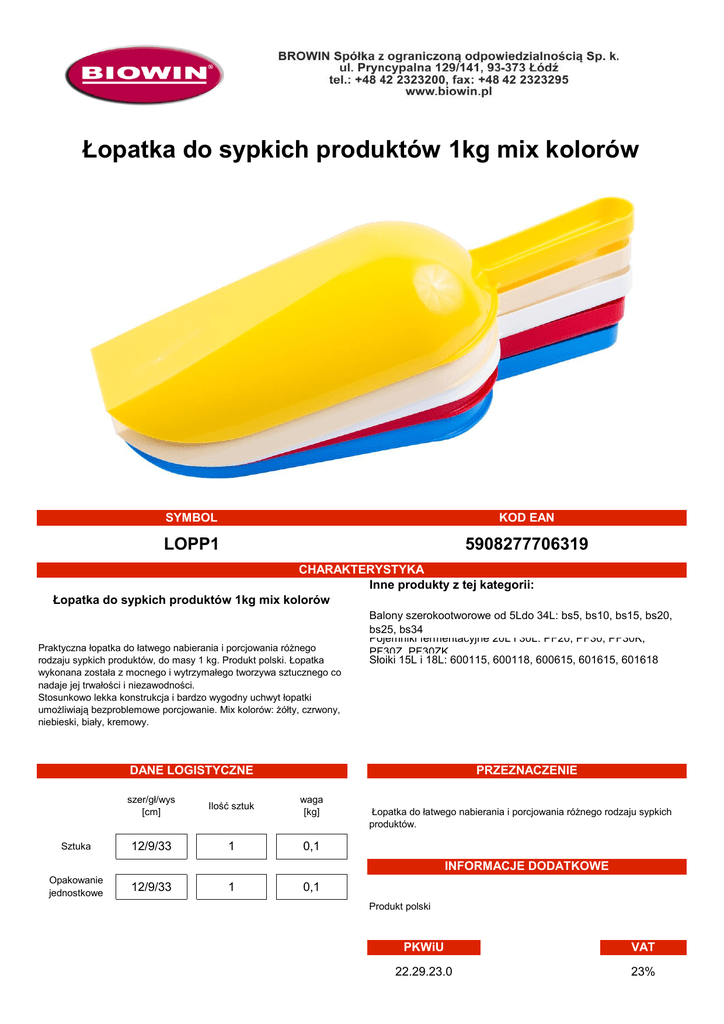 Łopatka do sypkich produktów 1kg mix kolorów SYMBOL KOD EAN LOPP1 5908277706319 CHARAKTERYSTYKA Inne produkty z tej kategorii: Łopatka do sypkich produktów 1kg mix kolorów Praktyczna łopatka do łatwego nabierania i porcjowania różnego rodzaju sypkich produktów, do masy 1 kg. Produkt polski. Łopatka wykonana została z mocnego i wytrzymałego tworzywa sztucznego co nadaje jej trwałości i niezawodności. Stosunkowo lekka konstrukcja i bardzo wygodny uchwyt łopatki umożliwiają bezproblemowe porcjowanie. Mix kolorów: żółty, czrwony, niebieski, biały, kremowy. Balony szerokootworowe od 5Ldo 34L: bs5, bs10, bs15, bs20, bs25, bs34 Pojemniki fermentacyjne 20L i 30L: PF20, PF30, PF30K, PF30Z, PF30ZK Słoiki 15L i 18L: 600115, 600118, 600615, 601615, 601618 DANE LOGISTYCZNE Sztuka PRZEZNACZENIE szer/gł/wys [cm] Ilość sztuk waga [kg] 12/9/33 1 0,1 Łopatka do łatwego nabierania i porcjowania różnego rodzaju sypkich produktów. INFORMACJE DODATKOWE Opakowanie jednostkowe 12/9/33 1 0,1 Produkt polski PKWiU VAT 22.29.23.0 23%