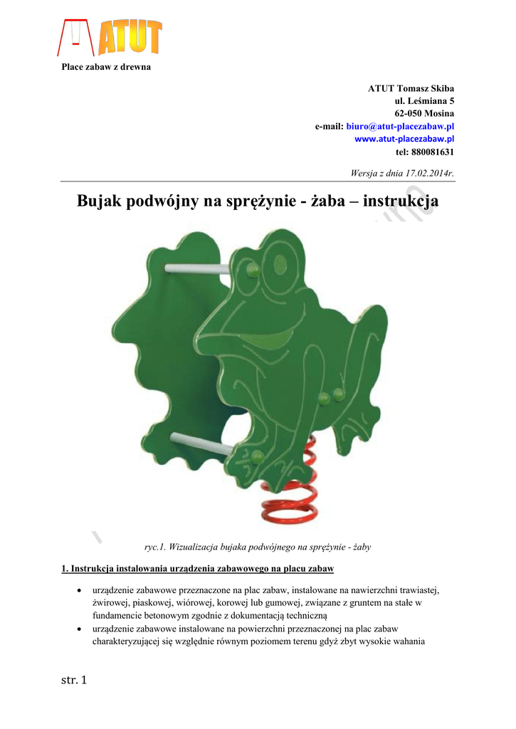 Place zabaw z drewna ATUT Tomasz Skiba ul. Leśmiana 5 62-050 Mosina e-mail: [email protected] www.atut-placezabaw.pl tel: 880081631 Wersja z dnia 17.02.2014r. Bujak podwójny na sprężynie - żaba – instrukcja ryc.1. Wizualizacja bujaka podwójnego na sprężynie - żaby 1. Instrukcja instalowania urządzenia zabawowego na placu zabaw str. 1 urządzenie zabawowe przeznaczone na plac zabaw, instalowane na nawierzchni trawiastej, żwirowej, piaskowej, wiórowej, korowej lub gumowej, związane z gruntem na stałe w fundamencie betonowym zgodnie z dokumentacją techniczną urządzenie zabawowe instalowane na powierzchni przeznaczonej na plac zabaw charakteryzującej się względnie równym poziomem terenu gdyż zbyt wysokie wahania poziomu terenu wpływają na wysokość swobodnego upadku i mogą wymusić zastosowanie innego rodzaju nawierzchni lub całkowicie uniemożliwić montaż urządzenia przestrzeń montażowa niezbędna do zamontowania urządzenia zabawowego na placu zabaw odpowiada minimalnej strefie funkcjonowania minimalna strefa funkcjonalna urządzenia zabawowego to 380cm x 340cm (ryc. 2) ryc. 2. Minimalna strefa użytkowania urządzenia montaż urządzenia na placu zabaw zgodnie z dokumentacją techniczną, na terenie nieuzbrojonym, poza strefą użytkowania innych urządzeń zabawowych umieszczonych na placu zabaw. W przypadku montażu zestawów zabawowych przy budynkach wielorodzinnych objętych jednym pozwoleniem na budowę istnieje obowiązek zachowania odległości 10m od linii rozgraniczających ulicę, od okien pomieszczeń przeznaczonych na pobyt ludzi oraz od miejsc gromadzenia odpadów. Zasada ta nie dotyczy placówek oświatowych. Plac zabaw powinien być oddalony od parkingu o przynajmniej 7m w przypadku parkingu na 4 stanowiska włącznie, 10m w przypadku parkingu z liczbą miejsc od 5 do 60 włącznie oraz 20m w przypadku parkingu z liczbą miejsc powyżej 60 urządzenie zabawowe instalowane bezpośrednio po przywiezieniu na teren budowy placu zabaw 2. Instrukcja montażu, demontażu i wymiany części urządzenia zabawowego str. 2 do czasu usunięcia nieprawidłowości urządzenie na placu zabaw zabezpieczyć przed użytkownikami budowlaną taśmą ostrzegawczą oraz umieszczoną w widocznym miejscu informacją w formie pisemnej zakazującą korzystania z urządzania na placu zabaw zdemontować uszkodzony element urządzenia zabawowego, który stanowi zagrożenie dla bezpieczeństwa uczestników korzystających z placu zabaw wymienić uszkodzoną część na identyczną z użytymi przez producenta placu zabaw w razie konieczności skontaktować się z producentem wyrobu 3. Instrukcja kontroli urządzenia dla osób odpowiedzialnych za bezpieczeństwo na placu zabaw co 1 do 7 dni sprawdzić teren placu zabaw poprzez oględziny polegające na usunięciu z powierzchni urządzenia zabawowego oraz strefy funkcjonowania urządzenia zanieczyszczeń oraz wszystkich elementów stanowiących zagrożenie dla użytkowników placu zabaw. Kontrola ta polega również na ocenie kompletności elementów i uszkodzeń będących skutkiem wandalizmu, zużycia lub niekorzystnych warunków pogodowych. Jeśli urządzenie zabawowe znajduje się w miejscu szczególnie narażonym na wandalizm należy odpowiednio do potrzeb dopasować częstotliwość oględzin placu zabaw co 1 do 3 miesięcy przeprowadzić przegląd funkcjonalny urządzeń zabawowych znajdujących się na placu zabaw polegający przede wszystkim na sprawdzeniu stanu połączeń śrubowych oraz stanu powierzchni drewnianych (zadry). W razie wykrycia nieprawidłowości usunąć je poprzez dokręcenie poluzowanych śrub oraz usunięcie zadr. Podczas tej kontroli ocenić należy funkcjonalność, stabilność oraz stopień zużycia urządzeń zabawowych lub ich elementów. Podczas tej kontroli należy również sprawdzić stan nawierzchni i w razie konieczności wyrównać lub uzupełnić poziom nawierzchni trawiastej lub nawierzchni sypkich (piasek, żwir, kora) pod urządzeniem. Należy zwrócić szczególną uwagę na elementy szczególnie eksploatowane np. huśtawki, zjeżdżalnie, wejścia na podesty. Prawidłowy stan nawierzchni pod urządzeniem występuję gdy poziom nawierzchni trawiastej lub sypkiej znajduje się około 5cm pod podstawą kotwy. Tolerowany (nie stwarzający zagrożenia dla bezpieczeństwa) stan nawierzchni występuję gdy poziom nawierzchni znajduje się od 5cm do 15 cm pod podstawą kotwy. Przekroczenie granicy poziomu tolerowanego stwarza zagrożenie dla bezpieczeństwa użytkowników korzystających z placu zabaw. raz w roku przeprowadzić kontrolę podstawową stanu technicznego urządzeń zabawowych na placu zabaw najlepiej poprzez przedstawiciela producenta urządzeń lub wykwalifikowane do tego osoby. Podczas tej kontroli sprawdzić należy ogólny poziom bezpieczeństwa urządzeń zabawowych, stan fundamentów oraz nawierzchni, ocenić wpływ warunków atmosferycznych na urządzenia, stan rozkładu i korozji oraz ocenić zmiany poziomu bezpieczeństwa na skutek przeprowadzonych napraw czynności kontrolne powinny być udokumentowane oraz wykonywane przez odpowiednio wykwalifikowany personel 4. Instrukcja użytkowania urządzenia zabawowego na placu zabaw urządzenie zabawowe jest przeznaczone dla dzieci od 3 do 6 roku życia dzieci do 12 roku życia powinny korzystać z urządzenia na placu zabaw tylko pod opieką osoby dorosłej ilość osób mogących korzystać jednocześnie z urządzenia na placu zabaw nie powinna przekraczać 1 5. Instrukcja pakowania, przechowywania i transportu urządzenia zabawowego str. 3 podczas transportu urządzenie zabawowe zabezpieczyć przed uszkodzeniami mechanicznymi urządzenia na plac zabaw należy przechowywać w miejscu zabezpieczonym przed osobami niepowołanymi w razie konieczności składowania urządzenie zabawowe należy układać starannie na płaskim podłożu w warunkach zbliżonych do warunków eksploatacji