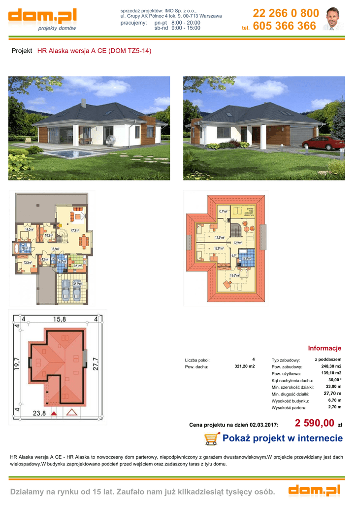 sprzedaż projektów: IMO Sp. z o.o., ul. Grupy AK Północ 4 lok. 9, 00-713 Warszawa pracujemy: pn-pt 8:00 - 20:00 sb-nd 9:00 - 15:00 22 266 0 800 tel. 605 366 366 Projekt HR Alaska wersja A CE (DOM TZ5-14) Informacje Liczba pokoi: Pow. dachu: 4 321,20 m2 Typ zabudowy: z poddaszem Pow. zabudowy: 248,30 m2 Pow. użytkowa: 139,10 m2 Kąt nachylenia dachu: 30,00 0 Min. szerokość działki: 23,80 m Min. długość działki: 27,70 m Wysokość budynku: 6,70 m Wysokość parteru: 2,70 m Cena projektu na dzień 02.03.2017: 2 590,00 zł Pokaż projekt w internecie HR Alaska wersja A CE - HR Alaska to nowoczesny dom parterowy, niepodpiwniczony z garażem dwustanowiskowym.W projekcie przewidziany jest dach wielospadowy.W budynku zaprojektowano podcień przed wejściem oraz zadaszony taras z tyłu domu. Działamy na rynku od 15 lat. Zaufało nam już kilkadziesiąt tysięcy osób.