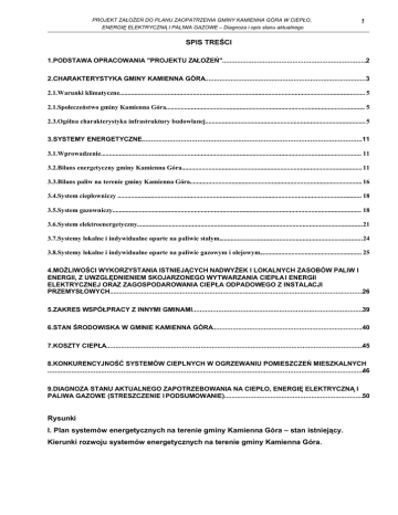 PROJEKT ZAŁOŻEŃ DO PLANU ZAOPATRZENIA GMINY KAMIENNA GÓRA W CIEPŁO, ENERGIĘ ELEKTRYCZNĄ I PALIWA GAZOWE – Diagnoza i opis stanu aktualnego 1 SPIS TREŚCI 1.PODSTAWA OPRACOWANIA "PROJEKTU ZAŁOŻEŃ"..............................................................................2 2.CHARAKTERYSTYKA GMINY KAMIENNA GÓRA.......................................................................................3 2.1.Warunki klimatyczne................................................................................................................................................... 5 2.1.Społeczeństwo gminy Kamienna Góra....................................................................................................................... 5 2.3.Ogólna charakterystyka infrastruktury budowlanej................................................................................................ 5 3.SYSTEMY ENERGETYCZNE.......................................................................................................................11 3.1.Wprowadzenie............................................................................................................................................................ 11 3.2.Bilans energetyczny gminy Kamienna Góra............................................................................................................ 11 3.3.Bilans paliw na terenie gminy Kamienna Góra....................................................................................................... 16 3.4.System ciepłowniczy .................................................................................................................................................. 18 3.5.System gazowniczy..................................................................................................................................................... 18 3.6.System elektroenergetyczny.......................................................................................................................................21 3.7.Systemy lokalne i indywidualne oparte na paliwie stałym......................................................................................24 3.8.Systemy lokalne i indywidualne oparte na paliwie gazowym i olejowym............................................................. 25 4.MOŻLIWOŚCI WYKORZYSTANIA ISTNIEJĄCYCH NADWYŻEK I LOKALNYCH ZASOBÓW PALIW I ENERGII, Z UWZGLĘDNIENIEM SKOJARZONEGO WYTWARZANIA CIEPŁA I ENERGII ELEKTRYCZNEJ ORAZ ZAGOSPODAROWANIA CIEPŁA ODPADOWEGO Z INSTALACJI PRZEMYSŁOWYCH.........................................................................................................................................26 5.ZAKRES WSPÓŁPRACY Z INNYMI GMINAMI............................................................................................39 6.STAN ŚRODOWISKA W GMINIE KAMIENNA GÓRA.................................................................................40 7.KOSZTY CIEPŁA...........................................................................................................................................45 8.KONKURENCYJNOŚĆ SYSTEMÓW CIEPLNYCH W OGRZEWANIU POMIESZCZEŃ MIESZKALNYCH ...........................................................................................................................................................................46 9.DIAGNOZA STANU AKTUALNEGO ZAPOTRZEBOWANIA NA CIEPŁO, ENERGIĘ ELEKTRYCZNĄ I PALIWA GAZOWE (STRESZCZENIE I PODSUMOWANIE)...........................................................................50 Rysunki I. Plan systemów energetycznych na terenie gminy Kamienna Góra – stan istniejący. Kierunki rozwoju systemów energetycznych na terenie gminy Kamienna Góra. 2 PROJEKT ZAŁOŻEŃ DO PLANU ZAOPATRZENIA GMINY KAMIENNA GÓRA W CIEPŁO, ENERGIĘ ELEKTRYCZNĄ I PALIWA GAZOWE – Diagnoza i opis stanu aktualnego 1. PODSTAWA OPRACOWANIA "PROJEKTU ZAŁOŻEŃ" Podstawą prawną do opracowania "Projektu założeń do planu zaopatrzenia gminy 1.1. Kamienna Góra w ciepło, energię elektryczną i paliwa gazowe" jest Ustawa Prawo energetyczne z dnia 10 kwietnia 1997r. (Dziennik Ustaw z 1997r. Nr 54, poz. 348 wraz z późniejszymi zmianami wynikającymi z Ustawy z dnia 4 grudnia 1997r., 2 lipca 1998r. oraz 24 lipca 1998r.) przypisujące gminie zadanie własne; planowania i organizacji zaopatrzenia w ciepło, energię elektryczną i paliwa gazowe na obszarze gminy (Art. 18 Ustawy) i zobowiązującą Urząd Gminy do opracowania "Projektu założeń do planu" (Art. 19 Ustawy) i "Projektu planu" (Art. 20 Ustawy). 1.2. Podstawą formalną opracowania "Projektu założeń do planu zaopatrzenia Gminy Kamienna Góra w ciepło, energię elektryczną i paliwa gazowe " jest Umowa zawarta pomiędzy Wójtem Gminy Kamienna Góra, a Fundacją na rzecz Efektywnego Wykorzystania Energii w Katowicach (FEWE). Podstawą analityczną i udokumentowaniem uogólnień niniejszego "Projektu założeń" 1.3. jest diagnoza stanu istniejącego (część I) oraz prognozy i koncepcje (część II). Zakres i redakcja części szczegółowej odpowiada wymogom Ustawy - Prawo energetyczne, to jest określa: 1) ocenę stanu aktualnego i przewidywanych zmian zapotrzebowania na ciepło, energię elektryczną i paliw gazowych, 2) przedsięwzięcia racjonalizujące użytkowanie ciepła, energii elektrycznej i paliw gazowych, 3) możliwości wykorzystania istniejących nadwyżek i lokalnych zasobów paliw i energii z uwzględnieniem skojarzonego wytwarzania ciepła i energii elektrycznej oraz zagospodarowania ciepła odpadowego z instalacji przemysłowych, 4) 1.4. zakres współpracy z innymi gminami. Niniejsza dokumentacja została wykonana zgodnie z umową, obowiązującymi przepisami, w tym techniczno – budowlanymi, Polskimi Normami i zasadami wiedzy technicznej. Dokumentacja wydana jest w stanie zupełnym ze względu na cel oznaczony w umowie. PROJEKT ZAŁOŻEŃ DO PLANU ZAOPATRZENIA GMINY KAMIENNA GÓRA W CIEPŁO,