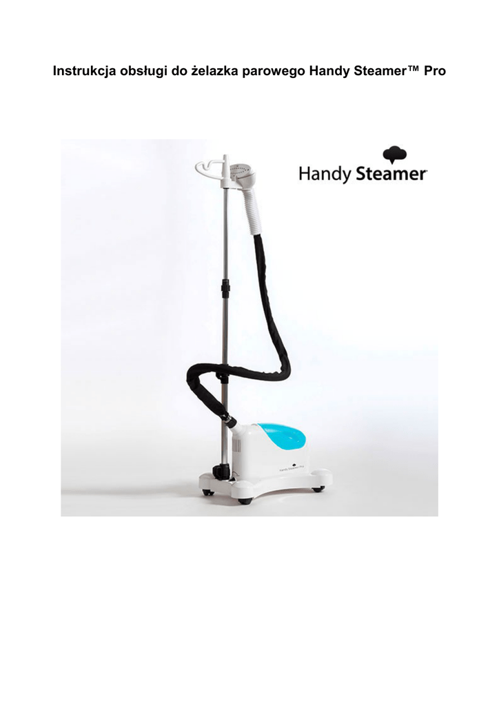 Instrukcja obsługi do żelazka parowego Handy Steamer™ Pro Specyfikacja techniczna: Moc: 1500 W, Napięcie 230V, Częstotliwość: 50 Hz, pojemność zbiornika na wodę ok 800 ml, prasowanie przy użyciu pary pod kątem 90º, czas opróżniania wkładu: ok 40-60 minut. Zestaw zawiera: żelazko do prasowania pionowego z elastycznym, lekkim wężem (przybliżona długość: 150 cm), podstawa na kółkach (przybliżone wymiary: 39 x 25 x 6 cm), teleskopowy trzonek ze stali nierdzewnej (przybliżona długość 138 cm), wieszak na ubrania z podstawką na dyszę parową (przybliżone wymiary: 23 x 11 x 15 cm), 2 wymienne szczotki, pasek do noszenia, torba. Montaż: 1. Instalacja rurki stojącej: włożyć grubszą część rurki do platformy na kółkach, następnie włożyć cieńszą rurkę do wcześniej zamontowanej części. 2. Przekręcić mechanizm blokujący LOCK. Część zmontowana z dwóch rurek teleskopowych służy do regulacji wysokości. Nałożyć na rurkę teleskopową hak. 3. Przykręcić wąż z dyszą do bazy żelazka. Instrukcja: 1. Wyjąć zbiornik na wodę, następnie napełnić go. 2. Upewnić się, że zawór jest całkowicie zakręcony. 3. Umieścić Pro Handy Steamer na platformie, podłączyć do sieci, a następnie wcisnąć przycisk zasilania. 4. Po około minucie, urządzenie będzie gotowe do użytku. 5. Upewnić się czy prasowane materiały, są przystosowane do prasowania parowego. 6. Umieścić ubranie na wieszaku a następnie na haku. Ubranie trzymać do dołu, prasować pod kątem około 45º. Niektóre z ubrań wymagają również prasowania od wewnętrznej strony. 7. Prasowanie tapicerki, firan, zasłon: zamontować pasek na żelazku, wyciągnąć żelazko, naciskając przycisk z tyłu urządzenia, aby wyciągnąć je z bazy. Powiesić żelazko na ramieniu. Konserwacja: 1. Zewnętrzną część żelazka przecierać wilgotną ściereczką. 2. W przypadku gdy urządzenie nie jest używane przez dłuższy czas, opróżnić zbiornik z wodą. 3. Okresowo czyścić zbiornik na wodę oraz wąż za pomocą roztworu (50% wody i kilka kropel octu). 4. Umieścić roztwór w zbiorniku i włączyć urządzenie na kilka minut. 5. Powtórzyć czynność używając już tylko wody destylowanej. 6. Przechowywać urządzenie w miejscu wolnym od wilgoci oraz kurzu. Ważne informacje: 1. Nie prasować ubrań na ciele człowieka. 2. 3. 4. 5. Zawsze używać żelazko w pionie. Wąż w trakcie użytkowania, powinien być zawsze powyżej zbiornika. Nie stosować gdy zbiornik nie jest napełniony wodą. Para nigdy nie może być skierowana w stronę ciała. Wskazówki dotyczące bezpieczeństwa użytkowania: Przed użyciem przeczytaj dokładnie instrukcję obsługi. Żelazko powinno być podłączone do uziemionego źródła prądu. Zachowaj szczególną ostrożność, gdy w pobliżu urządzenia znajdują się dzieci! Nie wolno zanurzać urządzenia, przewodu i wtyczki w wodzie lub innych płynach! Nie wolno zostawiać włączonego urządzenia bez nadzoru ze względu na możliwość powstania pożaru! Nie wieszaj przewodu na ostrych krawędziach inie pozwól, aby stykał się z gorącymi powierzchniami. Regularnie sprawdzaj czy przewód sieciowy nie jest uszkodzony. Nie wolno używać uszkodzonego urządzenia, również wtedy, gdy uszko- dzony jest przewód lub wtyczka - w takim wypadku oddaj urządzenie do naprawy w autoryzowanym punkcie serwisowym. Zawsze wyjmuj wtyczke z gniazdka, gdy nie korzystasz z urządzenia lub przed rozpoczęciem czyszczenia. Podczas napełniania zbiornika wodą lub jego opróżniania należy odłączyć urządzenie od źródła prądu. Nigdy nie dotykaj stopy grzejnej żelazka, gdy jest ono włączone! Do zbiornika należy wlewać wyłącznie wodę. Zaleca się stosowanie wody destylowanej, aby uniknąć osadzania się kamienia na wewnętrznych częsciach żelazka. Nie wolno dodawać do wody wlewanej do zbiornika jakichkolwiek środków chemicznych - mogą one poważnie uszkodzić urządzenie. Nie dotykać gorących metalowych części, gorącej wody bądź pary, aby uniknąć oparzenia. Nie wykorzystuj urządzenia do innych celów niż zostalo przeznaczone. Urządzenie przeznaczone jest tylko do użytku domowego. Nie wolno korzystać z urządzenia na wolnym powietrzu. Urządzenie należy przechowywać poza zasięgiem dzieci. Żelazko musi być używane na stablinej powierzchni i na taką odstawione. UWAGA! Nigdy nie napełniaj zbiornika powyżej maksymalnego poziomu wody! Prawidłowe usuwanie produktu (zużyty sprzęt elektryczny i elektroniczny) Oznaczenie umieszczane na produkcie lub w odnoszących się do niego tekstach wskazują, że produktu po upływie okresu użytkowania nie należy usuwać z innymi odpadami pochodzącymi z gospodarstw domowych. Aby unknąć szkodliwego wpływu na środowisko naturalne i zdrowie ludzi wskutek niekontrolowanego usuwania odpadów, prosimy o oddzielenie produktu od innego typu odpadów oraz odpowiedzialny recykling w celu promowania ponownego użycia zasobów materialnych jako stałej praktyki. W celu uzyskania informacji na temat miejsca i sposobu bezpiecznego dla środowiska recyklingu tego produktu użytkownicy w gospodarstwach domowych powinni skontaktować się z punktem sprzedaży detalicznej, w którym dokonali zakupu produktu, lub z organem władz lokalnych. Produkty nie należy usuwać razem z innymi odpadami komercyjnymi. Niniejszy sprzęt nie jest przeznaczony do użytkowania przez osoby (w tym dzieci) o ograniczonej zdolności fizycznej, czuciowej lub psychicznej, lub osoby nie mające doświadczenia lub znajomości sprzętu, chyba że odbywa się to pod nadzorem lub zgodnie z instrukcją użytkowania sprzętu, przekazanej przez osoby odpowiadające za ich bezpieczeństwo. W przypadku stwierdzenia wady produktu, prosimy o kontakt e-mail pod adresem: [email protected]