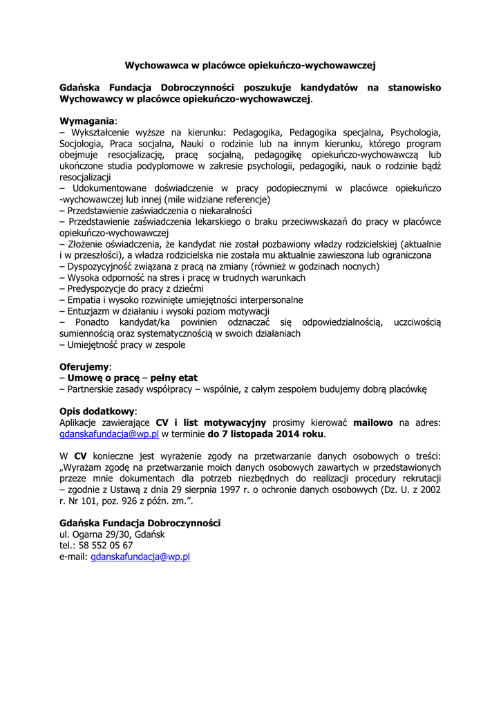 Wychowawca w placówce opiekuńczo-wychowawczej Gdańska Fundacja Dobroczynności poszukuje kandydatów Wychowawcy w placówce opiekuńczo-wychowawczej. na stanowisko Wymagania: – Wykształcenie wyższe na kierunku: Pedagogika, Pedagogika specjalna, Psychologia, Socjologia, Praca socjalna, Nauki o rodzinie lub na innym kierunku, którego program obejmuje resocjalizację, pracę socjalną, pedagogikę opiekuńczo-wyc owawczą lub ukończone studia podyplomowe w zakresie psychologii, pedagogiki, nauk o rodzinie bądź resocjalizacji – Udokumentowane doświadczenie w pracy podopiecznymi w placówce opiekuńczo -wychowawczej lub innej (mile widziane referencje) – Przedstawienie zaświadczenia o niekaralności – Przedstawienie zaświadczenia lekarskiego o braku przeciwwskazań do pracy w placówce opiekuńczo-wychowawczej – Złożenie oświadczenia, że kandydat nie został pozbawiony władzy rodzicielskiej (aktualnie i w przeszłości), a władza rodzicielska nie została mu aktualnie zawieszona lub ograniczona – Dyspozycyjność związana z pracą na zmiany (również w godzinac nocnyc ) – Wysoka odporność na stres i pracę w trudnyc warunkac – Predyspozycje do pracy z dziećmi – Empatia i wysoko rozwinięte umiejętności interpersonalne – Entuzjazm w działaniu i wysoki poziom motywacji – Ponadto kandydat/ka powinien odznaczać się odpowiedzialnością, uczciwością sumiennością oraz systematycznością w swoic działaniac – Umiejętność pracy w zespole Oferujemy: – Umowę o pracę – pełny etat – Partnerskie zasady współpracy – wspólnie, z całym zespołem budujemy dobrą placówkę Opis dodatkowy: Aplikacje zawierające CV i list motywacyjny prosimy kierować mailowo na adres: [email protected] w terminie do 7 listopada 2014 roku. W CV konieczne jest wyrażenie zgody na przetwarzanie danyc osobowyc o treści: „Wyrażam zgodę na przetwarzanie moic danyc osobowyc zawartyc w przedstawionyc przeze mnie dokumentac dla potrzeb niezbędnyc do realizacji procedury rekrutacji – zgodnie z Ustawą z dnia 29 sierpnia 1997 r. o oc ronie danyc osobowyc (Dz. U. z 2002 r. Nr 101, poz. 926 z późn. zm.”. Gdańska Fundacja Dobroczynności ul. Ogarna 29/30, Gdańsk tel.: 58 552 05 67 e-mail: [email protected]