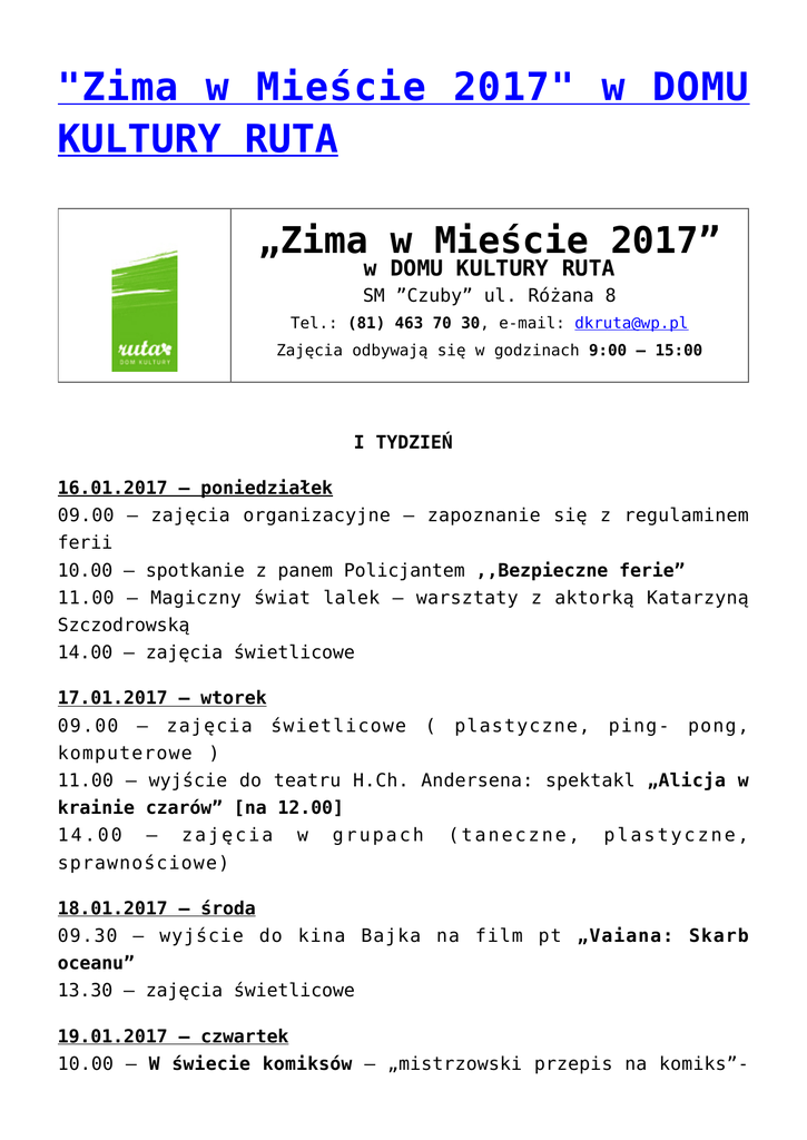 "Zima w Mieście 2017" w DOMU KULTURY RUTA