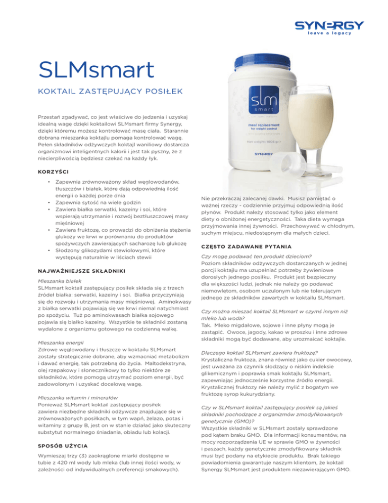 4 COLORg CMYK 2 COLORg PMS 287 PMS 299 SLMsmart KOKTAIL ZASTĘPUJĄCY POSIŁEK 1 COLORg PMS 287 1 COLORg BLACK W/ HALFTONE Przestań zgadywać, co jest właściwe do jedzenia i uzyskaj idealną wagę dzięki koktailowi SLMsmart firmy Synergy, dzięki któremu możesz kontrolować masę ciała. Starannie dobrana mieszanka koktajlu pomaga kontrolować wagę. Pełen składników odżywczych koktajl waniliowy dostarcza organizmowi inteligentnych kalorii i jest tak pyszny, że z niecierpliwością będziesz czekać na każdy łyk. 1 COLORg BLACK 1 COLORg WHITE KORZYŚCI • Zapewnia zrównoważony skład węglowodanów, tłuszczów i białek, które dają odpowiednią ilość energii o każdej porze dnia • Zapewnia sytość na wiele godzin • Zawiera białka serwatki, kazeiny i soi, które wspierają utrzymanie i rozwój beztłuszczowej masy mięśniowej • Zawiera fruktozę, co prowadzi do obniżenia stężenia glukozy we krwi w porównaniu do produktów spożywczych zawierających sacharozę lub glukozę • Słodzony glikozydami stewiolowymi, które występują naturalnie w liściach stewii NAJWAŻNIEJSZE SKŁADNIKI Mieszanka białek SLMsmart koktail zastępujący posiłek składa się z trzech źródeł białka: serwatki, kazeiny i soi. Białka przyczyniają się do rozwoju i utrzymania masy mięśniowej. Aminokwasy z białka serwatki pojawiają się we krwi niemal natychmiast po spożyciu. Tuż po aminokwasach białka sojowego pojawia się białko kazeiny. Wszystkie te składniki zostaną wydalone z organizmu gotowego na codzienną walkę. Mieszanka energii Zdrowe węglowodany i tłuszcze w koktailu SLMsmart zostały strategicznie dobrane, aby wzmacniać metabolizm i dawać energię, tak potrzebną do życia. Maltodekstryna, olej rzepakowy i słonecznikowy to tylko niektóre ze składników, które pomogą utrzymać poziom energii, być zadowolonym i uzyskać docelową wagę. Mieszanka witamin i minerałów Ponieważ SLMsmart koktail zastępujący posiłek zawiera niezbędne składniki odżywcze znajdujące się w zrównoważonych posiłkach, w tym wapń, żelazo, potas i witaminy z grupy B, jest on w stanie działać jako skuteczny substytut normalnego śniadania, obiadu lub kolacji. SPOSÓB UŻYCIA Wymieszaj trzy (3) zaokrąglone miarki dostępne w tubie z 420 ml wody lub mleka (lub innej ilości wody, w zależności od indywidualnych preferencji smakowych). Nie przekraczaj zalecanej dawki. Musisz pamiętać o ważnej rzeczy - codziennie przyjmuj odpowiednią ilość płynów. Produkt należy stosować tylko jako element diety o obniżonej energetyczności. Taka dieta wymaga przyjmowania innej żywności. Przechowywać w chłodnym, suchym miejscu, niedostępnym dla małych dzieci. CZĘSTO ZADAWANE PYTANIA Czy mogę podawać ten produkt dzieciom? Poziom składników odżywczych dostarczanych w jednej porcji koktajlu ma uzupełniać potrzeby żywieniowe dorosłych jednego posiłku. Produkt jest bezpieczny dla większości ludzi, jednak nie należy go podawać niemowlętom, osobom uczulonym lub nie tolerującym jednego ze składników zawartych w koktailu SLMsmart. Czy można mieszać koktail SLMsmart w czymś innym niż mleko lub woda? Tak. Mleko migdałowe, sojowe i inne płyny mogą je zastąpić. Owoce, jagody, kakao w proszku i inne zdrowe składniki mogą być dodawane, aby urozmaicać koktajle. Dlaczego koktail SLMsmart zawiera fruktozę? Krystaliczna fruktoza, znana również jako cukier owocowy, jest uważana za czynnik słodzący o niskim indeksie glikemicznym i poprawia smak koktajlu SLMsmart, zapewniając jednocześnie korzystne źródło energii. Krystalicznej fruktozy nie należy mylić z bogatym we fruktozę syrop kukurydziany. Czy w SLMsmart koktail zastępujący posiłek są jakieś składniki pochodzące z organizmów zmodyfikowanych genetycznie (GMO)? Wszystkie składniki w SLMsmart zostały sprawdzone pod kątem braku GMO. Dla informacji konsumentów, na mocy rozporządzenia UE w sprawie GMO w żywności i paszach, każdy genetycznie zmodyfikowany składnik musi być podany na etykiecie produktu. Brak takiego powiadomienia gwarantuje naszym klientom, że koktail Synergy SLMsmart jest produktem niezawierającym GMO.