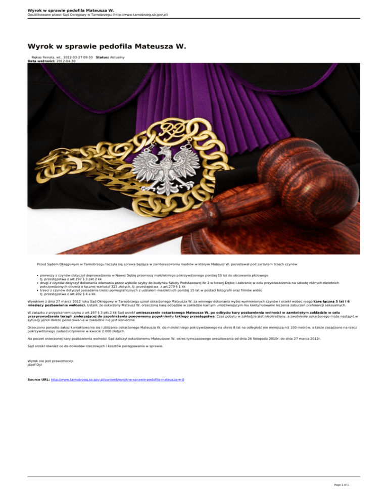 Wyrok w sprawie pedofila Mateusza W. Opublikowane przez: Sąd Okręgowy w Tarnobrzegu (http://www.tarnobrzeg.so.gov.pl) Wyrok w sprawie pedofila Mateusza W. Rękas Renata, wt., 2012-03-27 09:50 Status: Aktualny Data ważności: 2012-04-30 Przed Sądem Okręgowym w Tarnobrzegu toczyła się sprawa będąca w zainteresowaniu mediów w którym Mateusz W. pozostawał pod zarzutem trzech czynów: pierwszy z czynów dotyczył doprowadzenia w Nowej Dębię przemocą małoletniego pokrzywdzonego poniżej 15 lat do obcowania płciowego tj. przestępstwa z art.197 § 3 pkt.2 kk drugi z czynów dotyczył dokonania włamania przez wybicie szyby do budynku Szkoły Podstawowej Nr 2 w Nowej Dębie i zabranie w celu przywłaszczenia na szkodę różnych nieletnich pokrzywdzonych obuwia o łącznej wartości 325 złotych, tj. przestępstwa z art.279 § 1 kk trzeci z czynów dotyczył posiadania treści pornograficznych z udziałem małoletnich poniżej 15 lat w postaci fotografii oraz filmów wideo tj. przestępstwa z art.202 § 4 a kk. Wyrokiem z dnia 27 marca 2012 roku Sąd Okręgowy w Tarnobrzegu uznał oskarżonego Mateusza W. za winnego dokonania wyżej wymienionych czynów i orzekł wobec niego karę łączną 5 lat i 6 miesięcy pozbawienia wolności. Ustalił, że oskarżony Mateusz W. orzeczoną karę odbędzie w zakładzie karnym umożliwiającym mu kontynuowanie leczenia zaburzeń preferencji seksualnych. W związku z przypisaniem czynu z art.197 § 3 pkt.2 kk Sąd orzekł umieszczenie oskarżonego Mateusza W. po odbyciu kary pozbawienia wolności w zamkniętym zakładzie w celu przeprowadzenia terapii zmierzającej do zapobieżenia ponownemu popełnieniu takiego przestępstwa. Czas pobytu w zakładzie jest nieokreślony, a zwolnienie oskarżonego może nastąpić w sytuacji jeżeli dalsze pozostawanie w zakładzie nie jest konieczne. Orzeczono ponadto zakaz kontaktowania się i zbliżania oskarżonego Mateusza W. do małoletniego pokrzywdzonego na okres 8 lat na odległość nie mniejszą niż 100 metrów, a także zasądzono na rzecz pokrzywdzonego zadośćuczynienie w kwocie 2.000 złotych. Na poczet orzeczonej kary pozbawienia wolności Sąd zaliczył oskarżonemu Mateuszowi W. okres tymczasowego aresztowania od dnia 26 listopada 2010r. do dnia 27 marca 2012r. Sąd orzekł również co do dowodów rzeczowych i kosztów postępowania w sprawie. Wyrok nie jest prawomocny. Józef Dyl Source URL: http://www.tarnobrzeg.so.gov.pl/content/wyrok-w-sprawie-pedofila-mateusza-w-0 Page 1 of 1 Powered by TCPDF (www.tcpdf.org)