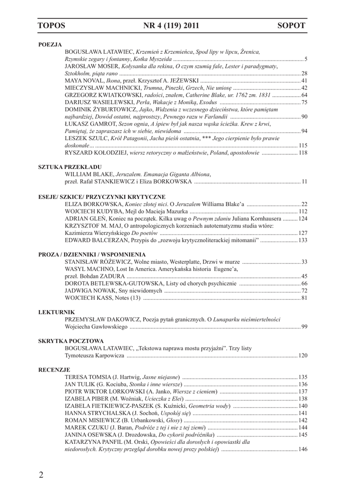 TOPOS POEZJA NR 4 (119) 2011 SOPOT BOGUSŁAWA LATAWIEC, Krzemień z Krzemieńca, Spod lipy w lipcu, Źrenica, Rzymskie zegary i fontanny, Kotka Myszeida ....................................................................................... 5 JAROSŁAW MOSER, Kołysanka dla rekina, O czym szumią fale, Lester i paradygmaty, Sztokholm, piąta rano ......................................................................................................................... 28 MAYA NOVAL, Ikona, przeł. Krzysztof A. JEŻEWSKI ................................................................... 41 MIECZYSŁAW MACHNICKI, Trumna, Pinezki, Grzech, Nie uniosę . ............................................ 42 GRZEGORZ KWIATKOWSKI, radości, znałem, Catherine Blake, ur. 1762 zm. 1831 ................... 64 DARIUSZ WASIELEWSKI, Perła, Wakacje z Moniką, Exodus ....................................................... 75 DOMINIK ŻYBURTOWICZ, Jajko, Widzenia z wczesnego dzieciństwa, które pamiętam najbardziej, Dowód ostatni, najprostszy, Pewnego razu w Farlandii ................................................ 90 ŁUKASZ GAMROT, Sezon ognia, A śpiew był jak nasza wąska ścieżka. Krew z krwi, Pamiętaj, że zapraszasz ich w siebie, niewidoma ............................................................................... 94 LESZEK SZULC, Król Patagonii, Jacha pieśń ostatnia, *** Jego cierpienie było prawie doskonałe…........................................................................................................................................ 115 RYSZARD KOŁODZIEJ, wiersz retoryczny o małżeństwie, Poland, apostołowie ......................... 118 SZTUKA PRZEKŁADU WILLIAM BLAKE, Jeruzalem. Emanacja Giganta Albiona, przeł. Rafał STANKIEWICZ i Eliza BORKOWSKA ........................................................................ 11 ESEJE/ SZKICE/ PRZYCZYNKI KRYTYCZNE ELIZA BORKOWSKA, Koniec złotej nici. O Jeruzalem Williama Blake’a ..................................... 22 WOJCIECH KUDYBA, Mejl do Macieja Mazurka . ....................................................................... 112 ADRIAN GLEŃ, Koniec na początek. Kilka uwag o Pewnym zdaniu Juliana Kornhausera .......... 124 KRZYSZTOF M. MAJ, O antropologicznych korzeniach autotematyzmu studia wtóre: Kazimierza Wierzyńskiego Do poetów ............................................................................................. 127 EDWARD BALCERZAN, Przypis do „rozwoju krytycznoliterackiej mitomanii” ......................... 133 PROZA / DZIENNIKI / WSPOMNIENIA STANISŁAW RÓŻEWICZ, Wolne miasto, Westerplatte, Drzwi w murze ........................................ 33 WASYL MACHNO, Lost In America. Amerykańska historia Eugene’a, przeł. Bohdan ZADURA ..................................................................................................................... 45 DOROTA BETLEWSKA-GUTOWSKA, Listy od chorych psychicznie .......................................... 66 JADWIGA NOWAK, Sny niewidomych ............................................................................................ 72 WOJCIECH KASS, Notes (13) .......................................................................................................... 81 LEKTURNIK PRZEMYSŁAW DAKOWICZ, Poezja pytań granicznych. O Lunaparku nieśmiertelności Wojciecha Gawłowskiego ................................................................................................................... 99 SKRYTKA POCZTOWA BOGUSŁAWA LATAWIEC, „Tekstowa naprawa mostu przyjaźni”. Trzy listy Tymoteusza Karpowicza ................................................................................................................... 120 RECENZJE TERESA TOMSIA (J. Hartwig, Jasne niejasne) .............................................................................. 135 JAN TULIK (G. Kociuba, Stonka i inne wiersze) ............................................................................ 136 PIOTR WIKTOR LORKOWSKI (A. Janko, Wiersze z cieniem) ..................................................... 137 IZABELA PIBER (M. Woźniak, Ucieczka z Elei) . .......................................................................... 138 IZABELA FIETKIEWICZ-PASZEK (S. Kuźnicki, Geometria wody) ............................................ 140 HANNA STRYCHALSKA (J. Sochoń, Uspokój się) . ..................................................................... 141 ROMAN MISIEWICZ (B. Urbankowski, Głosy) ............................................................................ 142 MAREK CZUKU (J. Baran, Podróże z tej i nie z tej ziemi) ............................................................. 144 JANINA OSEWSKA (J. Drozdowska, Do cykorii podróżnika) ....................................................... 145 KATARZYNA PANFIL (M. Orski, Opowieści dla dorosłych i opowiastki dla niedorosłych. Krytyczny przegląd dorobku nowej prozy polskiej) .................................................... 146 2 KATARZYNA PANFIL (W. Michalski, Klucze i słowa. Szkice literackie) . .................................... 147 DOROTA HECK (M. Gorczyńska, Miejsca Leśmiana. Studium topiki krytycznoliterackiej) ......... 147 EUGENIUSZ SOBOL (W. Górecki, Toast za przodków) . ............................................................... 149 EUGENIUSZ SOBOL (I. Kaliszewska, M. Falkowski, Matrioszka w Hidżabie. Reportaże z Dagestanu i Czeczenii) ................................................................................................................... 151 10 ZDAŃ O Beata Patrycja KLARY, Szczekanie głodnych psów (s. 153); Marek CZUKU, Forever (153); Jolanta SOWIŃSKA-GOGACZ, Pomieszczenie (154); Waldemar JOCHER, Reszta tamtego ciała (154); Agnieszka MIRAHINA, Do rozpuku (155); Struna Orficka. Ogólnopolski Konkurs im. Wojciecha Bąka 2006 –2010 (155); Justyna FRUZIŃSKA, Erotyki na różne tematy (156); Leszek SZARUGA, Podróż mego życia (156); Maciej WOŹNIAK, Ucie