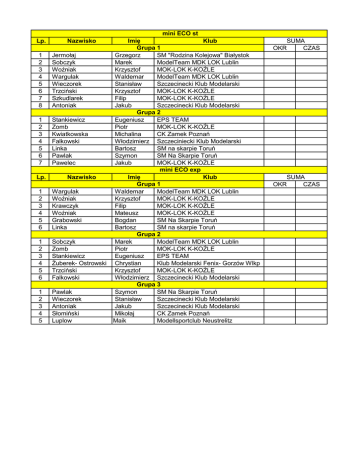 Lp. Nazwisko 1 2 3 4 5 6 7 8 Jermołaj Sobczyk Woźniak Wargulak Wieczorek Trzciński Szkudlarek Antoniak 1 2 3 4 5 6 7 Stankiewicz Zomb Kwiatkowska Falkowski Linka Pawlak Pawelec Lp. Nazwisko 1 2 3 4 5 6 Wargulak Woźniak Krawczyk Woźniak Grabowski Linka 1 2 3 4 5 6 Sobczyk Zomb Stankiewicz Żuberek- Ostrowski Trzciński Falkowski 1 2 3 4 5 Pawlak Wieczorek Antoniak Słomiński Luplow mini ECO st Imię Klub Grupa 1 Grzegorz SM "Rodzina Kolejowa" Białystok Marek ModelTeam MDK LOK Lublin Krzysztof MOK-LOK K-KOŹLE Waldemar ModelTeam MDK LOK Lublin Stanisław Szczecinecki Klub Modelarski Krzysztof MOK-LOK K-KOŹLE Filip MOK-LOK K-KOŹLE Jakub Szczecinecki Klub Modelarski Grupa 2 Eugeniusz EPS TEAM Piotr MOK-LOK K-KOŹLE Michalina CK Zamek Poznań Włodzimierz Szczeciniecki Klub Modelarski Bartosz SM na skarpie Toruń Szymon SM Na Skarpie Toruń Jakub MOK-LOK K-KOŹLE mini ECO exp Imię Klub Grupa 1 Waldemar ModelTeam MDK LOK Lublin Krzysztof MOK-LOK K-KOŹLE Filip MOK-LOK K-KOŹLE Mateusz MOK-LOK K-KOŹLE Bogdan SM Na Skarpie Toruń Bartosz SM na skarpie Toruń Grupa 2 Marek ModelTeam MDK LOK Lublin Piotr MOK-LOK K-KOŹLE Eugeniusz EPS TEAM Chrystian Klub Modelarski Fenix- Gorzów Wlkp Krzysztof MOK-LOK K-KOŹLE Włodzimierz Szczecinecki Klub Modelarski Grupa 3 Szymon SM Na Skarpie Toruń Stanisław Szczecinecki Klub Modelarski Jakub Szczecinecki Klub Modelarski Mikołaj CK Zamek Poznań Maik Modellsportclub Neustrelitz SUMA OKR CZAS SUMA OKR CZAS Lp. Nazwisko 1 2 3 4 5 6 Wargulak Stolarek Szkudlarek Woźniak Woźniak Krieger 1 2 3 4 5 6 Grabowski Trzciński Stankiewicz Słomiński Pawelec Luplow Lp. Nazwisko 1 2 3 4 5 6 Matuszak Stolarek Kusz Krawczyk Falkowski Luplow 1 2 3 4 5 6 Wieczorek Antoniak Zomb Stankiewicz Krieger Linka Lp. Nazwisko 1 2 3 4 5 6 Szymański Hoffa Penconek Sobczyk Linka Grabowski 1 2 3 4 5 Woźniak Jermołaj Kosik Linka Kozłowski ECO st Klub Grupa 1 Waldemar ModelTeam MDK LOK Lublin Piotr MOK-LOK K-KOŹLE Filip MOK-LOK K-KOŹLE Krzysztof MOK-LOK K-KOŹLE Mateusz MOK-LOK K-KOŹLE Ulrich Modellsportclub Neustrelitz Grupa 2 Bogdan SM Na Skarpie Toruń Krzysztof MOK-LOK K-KOŹLE Eugeniusz EPS TEAM Mikołaj CK Zamek Poznań Jakub MOK-LOK K-KOŹLE Maik Modellsportclub Neustrelitz ECO exp Imię Klub Grupa 1 Jerzy Modelteam Gdańsk Piotr MOK-LOK K-KOŹLE Jan MOK-LOK K-KOŻLE Filip MOK-LOK K-KOŹLE Włodzimierz Szczecinecki Klub Modelarski Maik Modellsportclub Neustrelitz Grupa 2 Stanisław Szczecinecki Klub Modelarski Jakub Szczecinecki Klub Modelarski Piotr MOK-LOK K-KOŹLE Eugeniusz EPS TEAM Ulrich Modellsportclub Neustrelitz Bartosz SM na skarpie Toruń MONO 1 Imię Klub Grupa 1 Dariusz SM Rodzina Kolejowa Białystok Michał Modelteam Polska Karol LOK WARSZAWA Marek ModelTeam MDK LOK Lublin Kacper SM na skarpie Toruń Bogdan SM Na Skarpie Toruń Grupa 2 Krzysztof MOK-LOK K-KOŹLE Grzegorz SM "Rodzina Kolejowa" Białystok Grzegorz ModelTeam Bartosz SM na skarpie Toruń Michał LOK Warszawa Imię SUMA OKR CZAS SUMA OKR CZAS SUMA OKR CZAS Lp. Nazwisko 1 2 3 4 5 Kozłowski Szymański Matuszak Penconek Hoffa 1 2 3 4 Kosik Woźniak Linka Zawadzki Lp. Nazwisko 1 2 3 4 5 6 Gajewski Nitecki Kusz Ostrowski Toruniewski Stolarek 1 2 3 4 5 Linka Krawczyk Woźniak Kozłowski Kosik Lp. Nazwisko 1 2 3 4 Gajewski Kachnowicz Kukolka Nitecki 1 2 3 4 Stolarek Toruniewski Woźniak Kozłowski Lp. 1 2 3 4 5 6 7 8 Nazwisko Kozłowski Stolarek Kachnowicz Szkudlarek Kosik Kukolka Wargulak Ostrowski Mono 2 Imię Klub Grupa 1 Michał LOK Warszawa Dariusz SM Rodzina Kolejowa Białystok Jerzy Modelteam Gdańsk Karol LOK WARSZAWA Michał Modelteam Polska Grupa 2 Grzegorz ModelTeam Krzysztof MOK-LOK K-KOŹLE Kacper SM na skarpie Toruń Marcin SM Na Skarpie Toruń Hydro 1 Imię Klub Grupa 1 Marcin CK Zamek Poznań Rafał CK Zamek Poznań Jan MOK-LOK K-KOŻLE Mariusz Klub Modelarski Fenix- Gorzów Wlkp Waldemar MOK-LOK K-KOŹLE Piotr MOK-LOK K-KOŹLE Grupa 2 Kacper SM na skarpie Toruń Filip MOK-LOK K-KOŹLE Mateusz MOK-LOK K-KOŹLE Michał LOK Warszawa Grzegorz ModelTeam Hydro 2 Imię Klub Grupa 1 Marcin CK Zamek Poznań Andrzej MOK-LOK K-KOŹLE Andrzej MOK-LOK K-KOŹLE Rafał CK Zamek Poznań Grupa 2 Adrian MOK-LOK K-KOŹLE Waldemar MOK-LOK K-KOŹLE Mateusz MOK-LOK K-KOŹLE Michał LOK Warszawa mini Hydro Imię Klub Grupa 1 Michał LOK Warszawa Piotr MOK-LOK K-KOŹLE Andrzej MOK-LOK K-KOŹLE Filip MOK-LOK K-KOŹLE Grzegorz ModelTam Andrzej MOK-LOK K-KOŹLE Waldemar ModelTeam MDK LOK Lublin Mariusz Klub Modelarski Fenix- Gorzów Wlkp SUMA OKR CZAS SUMA OKR CZAS SUMA OKR CZAS SUMA OKR CZAS Lp. 1 2 3 4 5 Lp. 1 2 3 4 Nazwisko Grabowski Krawczyk Linka Penconek Wargulak Nazwisko Krawczyk Luplow Matuszak Krieger mini Mono Imię Klub Grupa 1 Bogdan SM Na Skarpie Toruń Filip MOK-LOK K-KOŹLE Bartosz SM na skarpie Toruń Karol LOK WARSZAWA Waldemar ModelTeam MDK LOK Lublin FSR E Imię Klub Grupa 1 Filip MOK-LOK K-KOŹLE Maik Modellsportclub Neustrelitz Jerzy Modelteam Gdańsk Ulrich Modellsportclub Neustrelitz SUMA OKR CZAS SUMA OKR CZAS