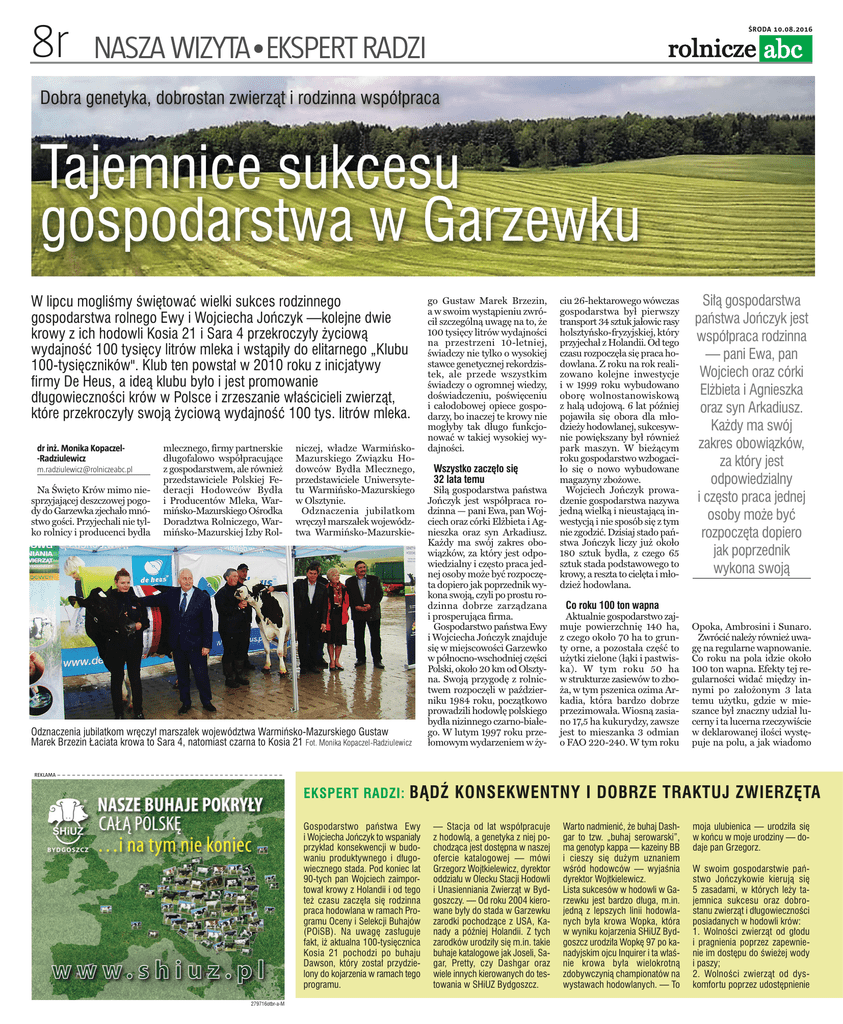 8r ŚRODA 10.08.2016 NASZA WIZYTA•EKSPERT RADZI rolnicze abc Dobra genetyka, dobrostan zwierząt i rodzinna współpraca Tajemnice sukcesu gospodarstwa w Garzewku W lipcu mogliśmy świętować wielki sukces rodzinnego gospodarstwa rolnego Ewy i Wojciecha Jończyk —kolejne dwie krowy z ich hodowli Kosia 21 i Sara 4 przekroczyły życiową wydajność 100 tysięcy litrów mleka i wstąpiły do elitarnego „Klubu 100-tysięczników". Klub ten powstał w 2010 roku z inicjatywy firmy De Heus, a ideą klubu było i jest promowanie długowieczności krów w Polsce i zrzeszanie właścicieli zwierząt, które przekroczyły swoją życiową wydajność 100 tys. litrów mleka. dr inż. Monika Kopaczel-Radziulewicz [email protected] Na Święto Krów mimo niesprzyjającej deszczowej pogody do Garzewka zjechało mnóstwo gości. Przyjechali nie tylko rolnicy i producenci bydła mlecznego, firmy partnerskie długofalowo współpracujące z gospodarstwem, ale również przedstawiciele Polskiej Federacji Hodowców Bydła i Producentów Mleka, Warmińsko-Mazurskiego Ośrodka Doradztwa Rolniczego, Warmińsko-Mazurskiej Izby Rol- niczej, władze WarmińskoMazurskiego Związku Hodowców Bydła Mlecznego, przedstawiciele Uniwersytetu Warmińsko-Mazurskiego w Olsztynie. Odznaczenia jubilatkom wręczył marszałek województwa Warmińsko-Mazurskie- Odznaczenia jubilatkom wręczył marszałek województwa Warmińsko-Mazurskiego Gustaw Marek Brzezin Łaciata krowa to Sara 4, natomiast czarna to Kosia 21 Fot. Monika Kopaczel-Radziulewicz REKLAMA go Gustaw Marek Brzezin, a w swoim wystąpieniu zwrócił szczególną uwagę na to, że 100 tysięcy litrów wydajności na przestrzeni 10-letniej, świadczy nie tylko o wysokiej stawce genetycznej rekordzistek, ale przede wszystkim świadczy o ogromnej wiedzy, doświadczeniu, poświęceniu i całodobowej opiece gospodarzy, bo inaczej te krowy nie mogłyby tak długo funkcjonować w takiej wysokiej wydajności. Wszystko zaczęło się 32 lata temu Siłą gospodarstwa państwa Jończyk jest współpraca rodzinna — pani Ewa, pan Wojciech oraz córki Elżbieta i Agnieszka oraz syn Arkadiusz. Każdy ma swój zakres obowiązków, za który jest odpowiedzialny i często praca jednej osoby może być rozpoczęta dopiero jak poprzednik wykona swoją, czyli po prostu rodzinna dobrze zarządzana i prosperująca firma. Gospodarstwo państwa Ewy i Wojciecha Jończyk znajduje się w miejscowości Garzewko w północno-wschodniej części Polski, około 20 km od Olsztyna. Swoją przygodę z rolnictwem rozpoczęli w październiku 1984 roku, początkowo prowadzili hodowlę polskiego bydła nizinnego czarno-białego. W lutym 1997 roku przełomowym wydarzeniem w ży- ciu 26-hektarowego wówczas gospodarstwa był pierwszy transport 34 sztuk jałowic rasy holsztyńsko-fryzyjskiej, który przyjechał z Holandii. Od tego czasu rozpoczęła się praca hodowlana. Z roku na rok realizowano kolejne inwestycje i w 1999 roku wybudowano oborę wolnostanowiskową z halą udojową. 6 lat później pojawiła się obora dla młodzieży hodowlanej, sukcesywnie powiększany był również park maszyn. W bieżącym roku gospodarstwo wzbogaciło się o nowo wybudowane magazyny zbożowe. Wojciech Jończyk prowadzenie gospodarstwa nazywa jedną wielką i nieustającą inwestycją i nie sposób się z tym nie zgodzić. Dzisiaj stado państwa Jończyk liczy już około 180 sztuk bydła, z czego 65 sztuk stada podstawowego to krowy, a reszta to cielęta i młodzież hodowlana. Siłą gospodarstwa państwa Jończyk jest współpraca rodzinna — pani Ewa, pan Wojciech oraz córki Elżbieta i Agnieszka oraz syn Arkadiusz. Każdy ma swój zakres obowiązków, za który jest odpowiedzialny i często praca jednej osoby może być rozpoczęta dopiero jak poprzednik wykona swoją Co roku 100 ton wapna Aktualnie gospodarstwo zajmuje powierzchnię 140 ha, z czego około 70 ha to grunty orne, a pozostała część to użytki zielone (łąki i pastwiska). W tym roku 50 ha w strukturze zasiewów to zboża, w tym pszenica ozima Arkadia, która bardzo dobrze przezimowała. Wiosną zasiano 17,5 ha kukurydzy, zawsze jest to mieszanka 3 odmian o FAO 220-240. W tym roku Opoka, Ambrosini i Sunaro. Zwrócić należy również uwagę na regularne wapnowanie. Co roku na pola idzie około 100 ton wapna. Efekty tej regularności widać między innymi po założonym 3 lata temu użytku, gdzie w mieszance był znaczny udział lucerny i ta lucerna rzeczywiście w deklarowanej ilości występuje na polu, a jak wiadomo ---------------------------------------------- EKSPERT RADZI: BĄDŹ KONSEKWENTNY I DOBRZE TRAKTUJ ZWIERZĘTA Gospodarstwo państwa Ewy i Wojciecha Jończyk to wspaniały przykład konsekwencji w budowaniu produktywnego i długowiecznego stada. Pod koniec lat 90-tych pan Wojciech zaimportował krowy z Holandii i od tego też czasu zaczęła się rodzinna praca hodowlana w ramach Programu Oceny i Selekcji Buhajów (POiSB). Na uwagę zasługuje fakt, iż aktualna 100-tysięcznica Kosia 21 pochodzi po buhaju Dawson, który został przydzielony do kojarzenia w ramach tego programu. 279716otbr-a-M — Stacja od lat współpracuje z hodowlą, a genetyka z niej pochodząca jest dostępna w naszej ofercie katalogowej — mówi Grzegorz Wojtkielewicz, dyrektor oddziału w Olecku Stacji Hodowli i Unasienniania Zwierząt w Bydgoszczy. — Od roku 2004 kierowane były do stada w Garzewku zarodki pochodzące z USA, Kanady a później Holandii. Z tych zarodków urodziły się m.in. takie buhaje katalogowe jak Joseli, Sagar, Pretty, czy Dashgar oraz wiele innych kierowanych do testowania w SHiUZ Bydgoszcz. Warto nadmienić, że buhaj Dashgar to tzw. „buhaj serowarski”, ma genotyp kappa — kazeiny BB i cieszy się dużym uznaniem wśród hodowców — wyjaśnia dyrektor Wojtkielewicz. Lista sukcesów w hodowli w Garzewku jest bardzo długa, m.in. jedną z lepszych linii hodowlanych była krowa Wopka, która w wyniku kojarzenia 