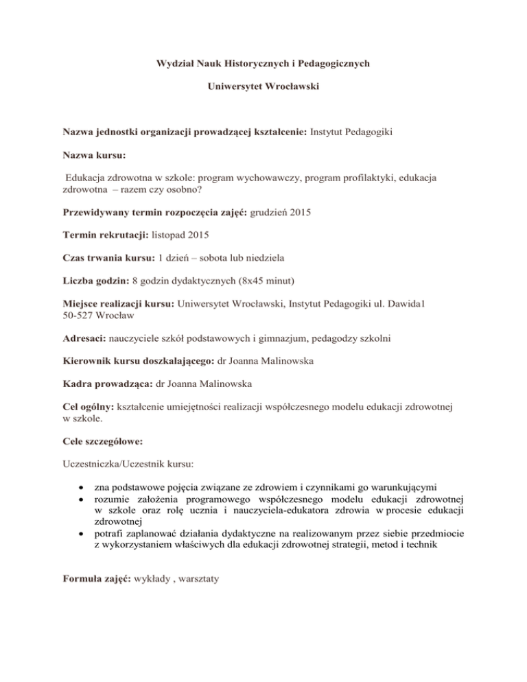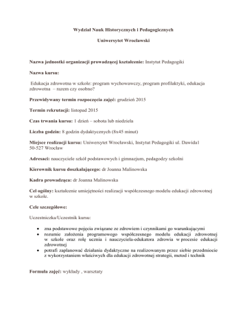 Wydział Nauk Historycznych i Pedagogicznych Uniwersytet Wrocławski Nazwa jednostki organizacji prowadzącej kształcenie: Instytut Pedagogiki Nazwa kursu: Edukacja zdrowotna w szkole: program wychowawczy, program profilaktyki, edukacja zdrowotna – razem czy osobno? Przewidywany termin rozpoczęcia zajęć: grudzień 2015 Termin rekrutacji: listopad 2015 Czas trwania kursu: 1 dzień – sobota lub niedziela Liczba godzin: 8 godzin dydaktycznych (8x45 minut) Miejsce realizacji kursu: Uniwersytet Wrocławski, Instytut Pedagogiki ul. Dawida1 50-527 Wrocław Adresaci: nauczyciele szkół podstawowych i gimnazjum, pedagodzy szkolni Kierownik kursu doszkalającego: dr Joanna Malinowska Kadra prowadząca: dr Joanna Malinowska Cel ogólny: kształcenie umiejętności realizacji współczesnego modelu edukacji zdrowotnej w szkole. Cele szczegółowe: Uczestniczka/Uczestnik kursu: zna podstawowe pojęcia związane ze zdrowiem i czynnikami go warunkującymi rozumie założenia programowego współczesnego modelu edukacji zdrowotnej w szkole oraz rolę ucznia i nauczyciela-edukatora zdrowia w procesie edukacji zdrowotnej potrafi zaplanować działania dydaktyczne na realizowanym przez siebie przedmiocie z wykorzystaniem właściwych dla edukacji zdrowotnej strategii, metod i technik Formuła zajęć: wykłady , warsztaty Plan kursu dokształcającego: Lp. Blok przedmiotowy 2. Podstawy współczesnego modelu edukacji zdrowotnej Metody i techniki pracy na zajęciach edukacji zdrowotnej 3. Liczba godzin wykładów 2 Liczba godzin warsztatów 2 4 Program kursu dokształcającego: Blok I Podstawy współczesnego modelu edukacji zdrowotnej Podejście do zdrowia: pojęcie zdrowia, jego aspekty, czynniki warunkujące zdrowie populacji i jednostki, status zdrowotny człowieka, modele zdrowia Mierniki zdrowia Modele, podejścia do edukacji zdrowotnej i wynikające z nich cele Model współczesnej edukacji zdrowotnej w szkole: edukacja dla zmiany, możliwości realizacji założeń programowych. Edukacja zdrowotna ukierunkowana na nabywanie umiejętności życiowych, edukacja zdrowotna a profilaktyka, terapia, wychowanie – jak budować program edukacji zdrowotnej w szkole Blok II Metody i techniki pracy na zajęciach edukacji zdrowotnej Workshops (warsztaty) jako strategia dydaktyczna w edukacji zdrowotnej, techniki planowania Analiza programu ukierunkowanego na umiejętności życiowe Projektowanie zajęć z wykorzystaniem wybranych technik Warunki ukończenia kursu doszkalającego: aktywny udział w pracach grupy, obecność na zajęciach Przewidywana liczba uczestników: 20 uczestników, minimum 15 osób Koszt kursu: 150 zł/osoba