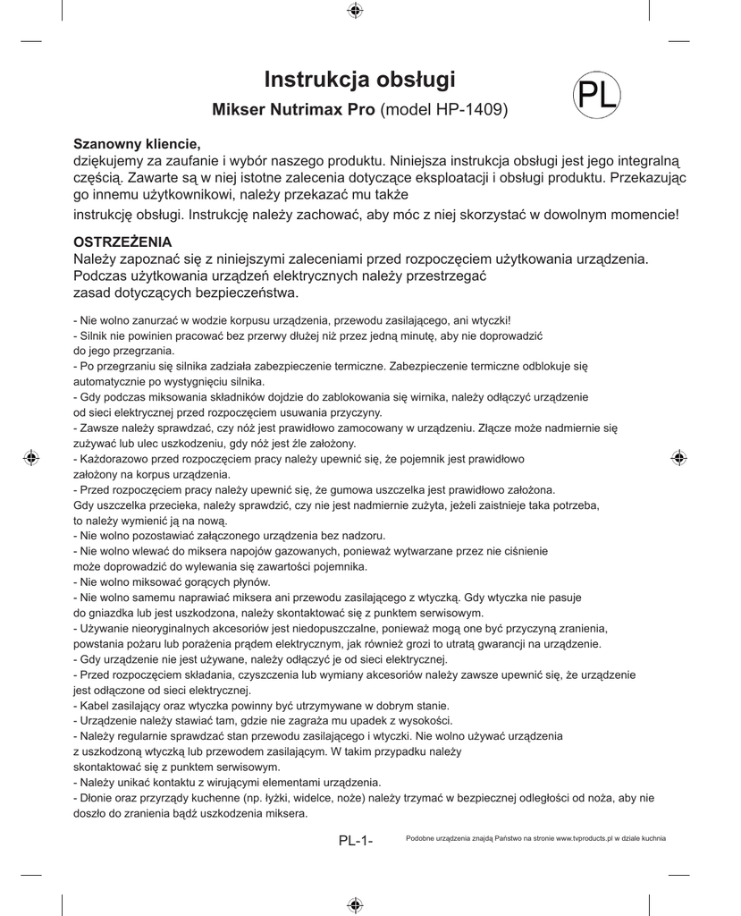 Instrukcja obsługi Návod k použití Mikser Nutrimax Pro (model HP-1409) Mixér Nutrimax Pro (model HP-1409) CZ Szanowny kliencie, Vážení zákazníci, děkujemezaVám za Vašii důvěru, kterou jste nám projevili nákupem tohoto výrobku. dziękujemy zaufanie wybór naszego produktu. Niniejsza instrukcja obsługi jest Tento jego integralną návodZawarte k obsluzesąjewsoučástí výrobku. Obsahuje důležité eksploatacji pokyny k uvedení výrobku do pro-Przekazując częścią. niej istotne zalecenia dotyczące i obsługi produktu. vozu a k użytkownikowi, jeho obsluze. Jestliže výrobek předáte osobám, dbejte na to, abyste jim odego innemu należy przekazać mujiným także vzdali i tento návod. Ponechejte si tento návod, abyste si jej mohli znovu kdykoliv přečíst! instrukcję obsługi. Instrukcję należy zachować, aby móc z niej skorzystać w dowolnym momencie! OSTRZEŻENIA VAROVÁNÍ Należy z niniejszymi zaleceniami przed rozpoczęciem użytkowania urządzenia. Tyto zapoznać instrukce sisię přečtěte ještě před použitím přístroje. Při používání elektrických zařízení dbejte na dodržování bezpečnostních zásad. Podczas użytkowania urządzeń elektrycznych należy przestrzegać zasad dotyczących bezpieczeństwa. • Nikdy neponořujte tělo přístroje, přívodní kabel ani zástrčku do vody! - Nie• wolno zanurzać w wodzie korpusu przewodu ani wtyczki! Nikdy nenechávejte motorurządzenia, běžet po dobu delšízasilającego, než 1 minuta z důvodu přehřátí. - Silnik pracować bez przerwy dłużej niż przez jedną minutę, aby nie doprowadzić • niePřipowinien přehřátí se může aktivovat tepelná pojistka. Tepelná pojistka se automaticky oddo jego przegrzania. blokuje po vypnutí a vychladnutí motoru. - Po•przegrzaniu się silnika zadziała zabezpieczenie termiczne. Zabezpieczenie termiczneze odblokuje Pokud dojde k zaseknutí potravin v mixéru, vždy jej nejdříve vypojte zásuvky,siępředautomatycznie po wystygnięciu silnika. odstraňovat. tím než budete potraviny - Gdy dojdzie do zablokowania wirnika, należySpojka odłączyć urządzenie • podczas Vždy miksowania se ujistěte,składników že nože jsou pevně nasazeny nasiętělo přístroje. nože se může od sieci elektrycznej usuwania opotřebit przed nebo rozpoczęciem poškodit, pokud neníprzyczyny. nůž správně nasazen. - Zawsze należysesprawdzać, czy nóżujistěte, jest prawidłowo zamocowany w urządzeniu. może nadmiernie się • Vždy před použitím že nádoba je správně nasazenaZłącze na tělo přístroje. zużywać lub ulec uszkodzeniu, gdy nóżže jest źle założony. • Před použitím se ujistěte, gumové těsnění je správně nasazeno. Pokud těsnění - Każdorazowo przed zkontrolujte rozpoczęciem pracy należy upewnić się, że pojemnik jest prawidłowo prosakuje, ho, případně vyměňte. założony na korpus urządzenia. • Spuštěný přístroj nikdy nenechávejte bez dozoru. - Przed pracynemíchejte należy upewnić się, że gumowa uszczelka jestvymrštit prawidłowo założona. • rozpoczęciem V mixéru nikdy perlivé nápoje, tlak by mohl nádobu. Gdy•uszczelka przecieka, należy sprawdzić, czy nie jest nadmiernie zużyta, jeżeli zaistnieje taka potrzeba, Nemixujte horké tekutiny. to należy wymienić ją na nową. • Nepokoušejte se mixér, nože ani zástrčku jakkoliv upravovat. Pokud zástrčka nepasuje - Nie wolno załączonego urządzenia bez nadzoru. dopozostawiać zásuvky, případně pokud je poškozena kontaktujte servisní oddělení. - Nie• wolno wlewać do miksera napojów gazowanych, ponieważ wytwarzane przez nie ciśnienie Použití neoriginálního příslušenství je nepřípustné, může způsobit zranění, vznik może doprowadzić wylewania się zawartości pojemnika. požáru čido úrazu elektrickým proudem, případně ztrátu záruky na výrobek. - Nie• wolno miksować płynów. vždy jej vypojte ze zásuvky. Pokud mixérgorących nepoužíváte, - Nie• wolno samemu naprawiać mikserači anipřidáváním przewodu zasilającego z wtyczką. Gdy wtyczkaže niejepasuje Před sestavením, čištěním příslušenství se vždy ujistěte, mixér do gniazdka lub jestze uszkodzona, vypojen zásuvky. należy skontaktować się z punktem serwisowym. - Używanie nieoryginalnych akcesoriówv jest niedopuszczalne, ponieważ mogą one być przyczyną zranienia, • Zástrčku i kabel udržujte dobrém stavu. powstania pożaru lub porażeniapřístroj prądem tak, elektrycznym, jak dojít również grozipádu to utratą gwarancji na urządzenie. • Nikdy neumisťujte aby mohlo k jeho z výšky. - Gdy jest używane, należy odłączyćkontrolujte. je od sieci elektrycznej. • urządzenie Přívodníniekabel i zástrčku pravidelně Pokud dojde k jejich poškození, pří- Przed rozpoczęciem składania, czyszczenia servisní lub wymiany akcesoriów należy zawsze upewnić się, że urządzenie stroj nepoužívejte. Kontaktujte středisko. jest •odłączone elektrycznej. Vždy od se sieci vyhněte kontaktu s pohyblivými součástkami. - Kabel oraznástroje wtyczka powinny być utrzymywane dobrymmohlo stanie.by dojít ke zranění či poško• zasilający Ruce a jiné držte vždy mimo dosahwnožů, - Urządzenie stawiać tam, gdzie nie zagraża mu upadek z wysokości. zenínależy přístroje. - Należy sprawdzać stan przewodu zasilającego Niedo wolno • regularnie Nikdy neprovádějte čištění mixéru, pokud jei wtyczki. zapojen sítě.używać urządzenia z uszkodzoną lub przewodem zasilającym. W takimpodmínkám. przypadku należy • Mixérwtyczką nevystavujte extrémním venkovním skontaktować sięsoučástky z punktem serwisowym. • Žádné mixéru nedávejte do mikrovlnné trouby. - Należy kontaktu z wirującymi urządzenia. • unikać Nádobku i nože je možnéelementami mýt v myčce. - Dłonie oraz przyrządy kuchenne (np. łyżki, widelce
