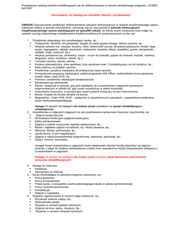 Przykładowy katalog kosztów kwalifikujących się do dofinansowania w ramach pilotażowego programu „UCZEŃ NA WSI” Informujemy, że katalog ma charakter otwarty i przykładowy! UWAGA! Dopuszczenie możliwości dofinansowania zakupów dokonywanych w ramach przedmiotowego zapisu traktować należy w sposób indywidualny, odnosząc się do rzeczywistych potrzeb edukacyjnych niepełnosprawnego ucznia wynikających ze specyfiki szkoły, do której uczeń uczęszcza oraz mając na uwadze wymóg racjonalnego wydatkowania środków publicznych przeznaczonych na ten cel. 1. 2. Przedmioty ułatwiające lub umożliwiające naukę, np.: Podręczniki, Słowniki, encyklopedie, książki do nauki języka obcego, lektury szkolne, itp.; Artykuły szkolne (np. zeszyty, bruliony, bloki, dzienniczki ucznia, akcesoria plastyczne, kredki, kleje, teczki, segregatory, okładki, wycinanki, malowanki, brystole, bibuły, plasteliny, gumki, temperówki, naklejki, linijki, nożyczki, itp.); Artykuły piśmienne (np. atramenty, tusze – w tym do drukarki, papier do drukarki, mazaki, markery, długopisy, pióra, korektory, ołówki, itp.); Tornister szkolny, plecak, piórnik; Kostium gimnastyczny, dres sportowy, buty sportowe (max. 2 komplety/pary na rok szkolny), itp.; Strój roboczy na praktyki zawodu; Przedmioty i przybory niezbędne do praktycznej nauki zawodu; Komputerowe programy edukacyjne, pakiet programów MS Office, multimedialne kursy językowe, kasety wideo, płyty DVD, itp.; Pomoce i przedmioty edukacyjno-terapeutyczne; Edukacyjne gry planszowe; Rower, wyłącznie w sytuacji, gdy jest niezbędny do uczestnictwa w zajęciach sportowych organizowanych w szkole lub, gdy uczeń uczestniczy w sekcji kolarskiej; Instrumenty muzyczne, w sytuacji gdy uczeń pobiera naukę gry na tym instrumencie; Biurko, krzesło do biurka, lampka na biurko; Magnetofon, Video VHS, DVD – wyłącznie w uzasadnionych sytuacjach- uzasadnienie podpisane przez wychowawcę/pedagoga. Uwaga! W ramach tej kategorii nie można uznać wydatków na sprzęt rehabilitacyjny i ortopedyczny! Uczestnictwo w zajęciach mających na celu podniesienie sprawności fizycznej i psychicznej, np.: Zajęcia terapeutyczne; Gimnastyka korekcyjna (zajęcia korekcyjne); Kółka zainteresowań; Zajęcia w szkole muzycznej, ognisku plastycznym, itp.; Basen i odpłatne zajęcia na basenie, np. nauka pływania, itp.; Siłownia, fitness, gimnastyka, itp.; Jazda konna, w tym hippoterapia; Zajęcia w sekcji komputerowej fotograficznej, teatralnej, sportowej, itp.; Obozy, kolonie, zimowiska. Uwaga! Koszt uczestnictwa w zajęciach może obejmować również koszty dojazdów na zajęcia i powrotu z zajęć do miejsca zamieszkania a także inne uzasadnione koszty bezpośrednio związane z uczestnictwem w zajęciach. Uwaga! W ramach tej kategorii nie można uznać kosztów wizyt lekarskich oraz kosztów turnusów rehabilitacyjnych! 3. 4. 5. Dostęp do Internetu: Instalacja; Abonament za Internet. Kursy doszkalające w zakresie programu nauczania, np.: Kursy językowe; Kursy komputerowe; Prawo jazdy, w przypadku ucznia pobierającego naukę w szkole samochodowej; Kursy naukowo-poznawcze; Korepetycje; Zajęcia z Logopedą. Wyjazdy organizowane w ramach zajęć szkolnych, np.: Wycieczki szkolne (rajdy), itp.; Zielona/biała szkoła; Wyjazdy w ramach praktyk szkolnych; Wyjście do kina, teatru, muzeum, itp.; Wyjazdy w ramach olimpiad szkolnych.