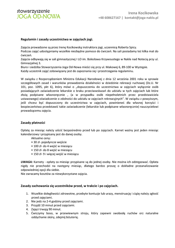 Irena Kocikowska +48 608627167 | [email protected] Regulamin i zasady uczestnictwa w zajęciach jogi. Zajęcia prowadzone są przez Irenę Kocikowską instruktora jogi, uczennicę Roberta Spicy. Podczas zajęć udostępniamy wszelkie niezbędne pomoce do ćwiczeń. Na sali posiadamy też kilka mat do ćwiczeń. Zajęcia odbywają się w sali gimnastycznej I LO im. Bolesława Krzywoustego w Nakle nad Notecią przy ul. Gimnazjalnej 3. Biuro i siedziba Stowarzyszenia Joga Od-Nowa mieści się przy ul. Makowej 6, 89-100 w Występie. Każdy uczestnik zajęć zobowiązany jest do zapoznania się i przestrzegania regulaminu. W związku z Rozporządzeniem Ministra Edukacji Narodowej z dnia 12 września 2001 roku w sprawie szczegółowych zasad i warunków prowadzenia działalności w dziedzinie rekreacji ruchowej (Dz.U. Nr 101, poz. 1095, pkt 6), który mówi o „dopuszczeniu do uczestnictwa w zajęciach wyłącznie osób posiadających zaświadczenie lekarskie o braku przeciwwskazań do udziału w tych zajęciach lub które złożą podpisane własnoręcznie , (a w przypadku osób niepełnoletnich przez przedstawiciela ustawowego) oświadczenie o zdolności do udziału w zajęciach rekreacyjnych”. W związku z powyższym, jeśli chcesz być dopuszczony do uczestnictwa w zajęciach, powinieneś dla własnej korzyści i bezpieczeństwa przedstawić takie zaświadczenie (lekarskie lub podpisane własnoręcznie) nauczycielowi prowadzącemu zajęcia. Zasady płatności Opłatę za miesiąc należy uiścić bezpośrednio przed lub po zajęciach. Karnet ważny jest jeden miesiąc kalendarzowy i przypisany jest do danej osoby. Aktualne ceny: • 30 zł- pojedyncze wejście • 100 zł- do 4 wejść w miesiącu • 150 zł- do 8 wejść w miesiącu • 150 zł- 9 i więcej wejść w miesiącu UWAGA: Karnety - opłaty za miesiąc przypisane są do jednej osoby. Nie można ich odstępować. Opłata nigdy nie przechodzi na następny miesiąc, dlatego bardzo proszę o dokładne przeanalizowanie odpowiedniej opcji dla siebie. Nie zwracamy kosztów za niewykorzystane zajęcia. Zasady zachowania się uczestników przed, w trakcie i po zajęciach. 1. Wszelkie dolegliwości zdrowotne, przebyte kontuzje lub urazy, menstruację i ciążę należy zgłosić przed zajęciami. 2. Nie jedz na 2-4 godziny przed zajęciami. 3. Przyjdź 10 minut przed zajęciami. 4. Zajęci trwają 90 minut. 5. Ćwiczymy boso, w przewiewnym stroju, który zapewni swobodę ruchów orz naturalne oddychanie skóry, zdejmij biżuterię. Irena Kocikowska +48 608627167 | [email protected] 6. Program zajęć stanowi całość, więc nie spóźniamy się, szanując czas innych i nie opuszczamy zajęć przed ich zakończeniem. 7. Zanim wejdziesz na salę wyłącz telefon komórkowy lub przełącz go w tryb bezgłośny. 8. Zachowaj ciszę. 9. Matę rozłóż w jednym z dwóch rzędów tak aby środek pozostał wolny. 10. Preferowana własna mata. 11. Przygotuj sobie pomoce do ćwiczeń: 3 koce, 2 paski, 2 klocki. 12. Obserwuj i słuchaj wskazówek prowadzącego. 13. W trakcie zajęć nie pomagamy innym uczestnikom, chyba że poprosi o to prowadzący. 14. Wszelkie niepokojące objawy w trakcie wykonywania ćwiczeń (nagły wzrost ciśnienia, napięcie w oczach, ból w stawach itp.) należy zgłosić prowadzącemu. 15. Utrzymuj na sali porządek w trakcie i po ćwiczeniach. 16. Po zakończeniu zajęć pomoce odłóż na swoje miejsce. UWAGA: Za rzeczy i przedmioty pozostawione w szatni lub na sali Stowarzyszenie Joga Od-Nowa nie odpowiada. „ Gdy wydaje Ci się, że już nic nie możesz, to masz rację. Tylko Ci się wydaje” ~Anonim --------------------------------------------------------------KONIEC------------------------------------------------------------------