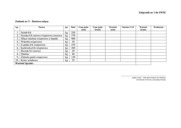 Załącznik nr 1 do SWIZ Zadanie nr 3 – Dostawa mięsa l.p. Nazwa 1. Schab b/k 2. Szynka b/k surowa wieprzowa zrazowa 3. Mięso mielone wieprzowe z łopatki 4. Wątroba wieprzowa 5. Łopatka b/k wieprzowa 6. Karkówka b/k wieprzowa 7. Boczek b/ż surowy 8. Słonina 9. Żeberka paski wieprzowe 10. Kości schabowe Wartość łącznie: jm Ilość kg kg kg kg kg kg kg kg kg kg 250 570 900 30 470 300 20 40 150 25 Cena jedn. netto Cena jedn. brutto Wartość netto Stawka VAT Wartość brutto Producent ……………………………………………. podpis osoby – osób uprawnionych do składania oświadczeń woli wraz z pieczątką imienną Zadanie nr 7 – Dostawa drobiu l.p. Nazwa 1. Ćwiartki z kurczaka świeże 2. Dramstiki z kurczaka świeże 3. Filet z piersi kurczaka świeży 4. Kurczak świeży 5. Porcje rosołowe świeże 6. Mięso gulaszowe z indyka świeże Wartość łącznie: jm Ilość kg kg kg kg kg kg 250 300 165 55 750 50 Cena jedn. netto Cena jedn. brutto Wartość netto Stawka VAT Wartość brutto Producent ……………………………………………. podpis osoby – osób uprawnionych do składania oświadczeń woli wraz z pieczątką imienną Zadanie nr 8 – Dostawa wędlin - produkowanych zgodnie z tradycyjną technologią, bez środków podwyższających wydajność, sztucznych barwników i ekstraktów, z naturalnymi przyprawami, peklowanych, konserwowanych i wędzonych w sposób naturalny. l.p. Nazwa 1. Kiełbasa zwyczajna 2. Ogonówka 3. Polędwica sopocka 4. Polędwica łososiowa 5. Szynka gotowana 6. Kiełbasa żywiecka 7. Baleron 8. Boczek wędzony 9. Parówki (paluszki odtłuszczone) 10. Pieczeń rzymska 11. Pasztet wieprzowy 12. Schab pieczony 13. Szynka pieczona Wartość łącznie: jm Ilość kg kg kg kg kg kg kg kg kg kg kg kg kg 100 50 50 10 60 70 35 70 40 30 20 20 20 Cena jedn. netto Cena jedn. brutto Wartość netto Stawka VAT Wartość brutto Producent ……………………………………………. podpis osoby – osób uprawnionych do składania oświadczeń woli wraz z pieczątką imienną Zadanie nr 9 – Dostawa wędlin drobiowych l.p. Nazwa 1. Pasztet drobiowy 2. Parówki drobiowe odtłuszczone 3. Szynka z indyka 4. Pierś pieczona z indyka 5. Polędwica miodowa Wartość łącznie: jm Ilość kg kg kg kg kg 20 20 46 20 10 Cena jedn. netto Cena jedn. brutto Wartość netto Stawka VAT Wartość brutto Producent