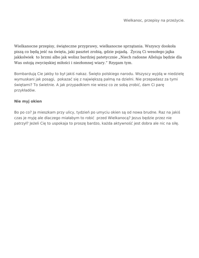 Wielkanoc, przepisy na przeżycie. Wielkanocne przepisy, świąteczne przyprawy, wielkanocne sprzątania. Wszyscy dookoła piszą co będą jeść na święta, jaki pasztet zrobią, gdzie pojadą. Życzą Ci wesołego jajka jakkolwiek to brzmi albo jak wolisz bardziej patetycznie „Niech radosne Alleluja będzie dla Was ostoją zwycięskiej miłości i niezłomnej wiary.” Rzygam tym. Bombardują Cie jakby to był jakiś nakaz. Święto polskiego narodu. Wszyscy wyjdą w niedzielę wymuskani jak posągi, pokazać się z największą palmą na dzielni. Nie przepadasz za tymi świętami? To świetnie. A jak przypadkiem nie wiesz co ze sobą zrobić, dam Ci parę przykładów. Nie myj okien Bo po co? Ja mieszkam przy ulicy, tydzień po umyciu okien są od nowa brudne. Raz na jakiś czas je myję ale dlaczego miałabym to robić przed Wielkanocą? Jezus będzie przez nie patrzył? Jeżeli Cię to uspokaja to proszę bardzo, każda aktywność jest dobra ale nic na siłę. Wielkanoc, przepisy na przeżycie. Zrób zakupy Ale bez przesady, to nie armagedon. Ja co roku zapominam a potem i tak okazuje się, że jednak jakiś sklep jest czynny. Za to przed świętami wszyscy w kolejce, po mięso, po alkohol, po papier toaletowy. Nie marnuj jedzenia, przemyśl ile naprawdę jesteś w stanie zjeść przez te pare dni. Książka i film Zawsze na to brakuje czasu a może święta to właśnie ten czas na książkę? Zamiast siedzieć przy stole i zapychać się dziwnymi potrawami pochłaniaj książkę albo dobry film. Zawsze to lepsze niż świąteczne kłótnie. Wielkanoc, przepisy na przeżycie. Nie kłóć się. Święta to taki czas gdy zjeżdżają się ludzie przypadkowi, bliscy i dalecy, o wielu różnych poglądach. Raczej nie da się uniknąć tematu polityki, dzieci, pańtwa czy Twojego weganizmu. Mam dla Ciebie radę, nie idź w to. Z doświadczenia wiem, że są tacy ludzie, którzy żyją uświadamianiem Ciebie, że robisz źle. A także tacy, którzy dają Tobie i Twojej połówce dobre rady. Sytuacja prawdziwa, z grudnia. Wychodzę z psem (w wigilię) na spacer, po drodze mijam wędrujące rodziny z dziećmi. Nagle wybiega kobieta z dzieckiem na ręku, rozhisteryzowana otwiera samochód. Za nią biegnie konkubent, mąż, partner cokolwiek. Ona krzyczy: -Nie! Andrzej. Nie broniłeś mnie przed swoją matka ani przed swoim bratem. Nie Wielkanoc, przepisy na przeżycie. masz już rodziny. Zostań sobie z nimi. Wykrzykując te słowa, wsiadła do auta i odjechała. Możemy sobie tylko wyobrazić o co poszło. Po świętach, rozmawiałam ze znajomymi i prawie przy każdym stole nastąpił rozłam, polityczny. Dlatego mówię, nie warto. Bo niektórzy uważają, że zawsze mają rację. Idź, poczytaj książkę. Idź na spacer albo na rower Ale najlepiej w godzinach gdy inni siedzą przy stole albo jeszcze nie obudzili się po wczorajszym dniu. W takie święta staram się wychodzić z psami bardzo wcześnie, potem jest to już niefajne. Całe stada maszerują ulubionymi ścieżkami mojego psa, dzieci krzyczą, dorośli dochodzą do siebie albo po prostu rozmawiają. Żeby nie było, że patologię tylko spotykam. Na rowerze zawsze lepiej. Mniej ludzi, więcej szczęścia. Wyluzuj Wielkanoc, przepisy na przeżycie. I ostania, najważniejsza rzecz, której życzę mojej matce oraz waszym wszystkim matkom, które są jak moja. Wyluzuj, powtarzam jej od 36 lat a ona nic. Chora, nie chora, zła czy nie zła zawsze idzie do tej kuchni i gotuje, za dużo. Co roku jej mówię, że nawet nasza piątka nie była w stanie tego zjeść przez 3 dni, więc niech nie robi tyle bo się marnuje. Pełne lodówki, zapchane mięsem ale kupują dalej bo przecież sklep będzie nieczynny. Sprzątają podłogi, okna, szafki jakby sam Jezus stał za ich plecami. A jak wiadomo ciśnienie rodzi ciśnienie. Ona wkurzona, zarobiona i zmęczona, nie ma czasu odsapnąć. Co chwila parzy komuś kawę, herbatkę, kroi ciasto a wieczorem narzeka, że wszystko ją boli. Czy wasze matki też tak mają? Mówię Ci zatem matko polko, wyluzuj. Szkoda zdrowia, każdy i tak docenia Twój wkład w to by te dni były wyjątkowe i mimo, iż mam gdzieś te święta to wierzę, że Ty chcesz dobrze ale nie kosztem samopoczucia bo w te dni ( każde wolne od pracy) powinno się zacieśniać więzy a nie luzować. Spędzać czas z tymi, których się kocha i dla których nie ma się czasu na co dzień. A jeżeli nie jesteś matką tylko zarobionym robotem z korporacji jak ja to życzę Ci by święta mimo wszystko były jak najcześciej bo to jedyny raz kiedy bez wyrzutów sumienia masz wolne. Bo w dzisiejszych czasach nawet gorączka czy zwykłe zmęczenie nie pozwala Ci myśleć, że możesz wziąć urlop. Bo jak to tak? Jeden niedziałający tryb spowalnia przecież inne. Spokojnego wolnego, na własny sposób, życzę wam. Róbcie to co uczyni was szczęśliwymi, nawet jeżeli jest to mycie tych cholernych okien. Wielkanoc, przepisy na przeżycie. Podziel się: Udostępnij na Twitterze(Otwiera się w nowym oknie) Click to share on Facebook(Otwiera się w nowym oknie) Click to share on Google+(Otwiera się w nowym oknie) Click to share on Pocket(Otwiera się w nowym oknie) Kliknij, aby udostępnić na LinkedIn(Otwiera się w nowym oknie) Więcej Wielkanoc, przepisy na przeżycie. Dodaj do ulubionych: Lubię Wczytywanie...