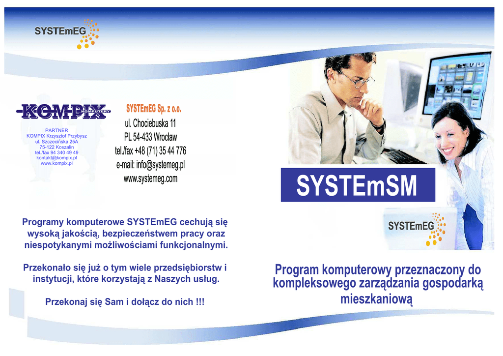 PARTNER KOMPIX Krzysztof Przybysz ul. Szczecińska 25A 75-122 Koszalin tel./fax 94 340 49 49 [email protected] www.kompix.pl SYSTEmSM Programy komputerowe SYSTEmEG cechują się wysoką jakością,bezpieczeństwem pracy oraz niespotykanymimożliwościamifunkcjonalnymi. Przekonało się już o tym wiele przedsiębiorstw i instytucji,które korzystają zNaszych usług. Przekonajsię Sam idołączdo nich !!! Program komputerowy przeznaczony do kompleksowego zarządzania gospodarką mieszkaniową Jest specjalistycznym narzędziem wspomagającym zarządzanie zasobami mieszkaniowymi. System przeznaczony jest do prowadzenia licznych rozrachunków czynszowych zlokatorami, właścicielami czy też najemcami, ponadto służy łatwej ewidencji danych archiwalnych dotyczących zarządzania zasobami. Niezwykłą uniwersalność programu osiągnięto poprzez zastosowanie odpowiednich modułów znacznie ułatwiających pracę użytkownika. Jego wszechstronność pozwala na wykorzystanie jego atutów w: -Spółdzielniach mieszkaniowych, -Pojedynczych wspólnotach mieszkaniowych, -Firmach Zarządzających Gospodarki Mieszkaniowej obsługujących zarówno wspólnoty mieszkaniowe jaki mieszkania czynszowe. Sam projekt SYSTEmSM został stworzony całkowicie od podstaw dzięki współpracy zjedną zwiększych Spółdzielni we Wrocławiu. SYSTEmSM to program całkowicie polski, dzięki czemu poruszanie się po wszystkich jego funkcjach jest zrozumiałe i nie sprawia żadnych problemów. Dodatkowo działa on pod systemem operacyjnym Windows ®, co daje gwarancję, iż korzystanie i obsługa programu jest prosta i intuicyjna. SYSTEmSM jestodpowiedzią na potrzeby konkretnego użytkownika. Daje to gwarancję, że zastosowane w programie rozwiązania i funkcje będą odpowiadać oczekiwaniom osób, które faktycznie podejmą pracę na systemie w rzeczywistych warunkach, a nie są jedynie oparte na teoretycznych założeniach twórców oprogramowania. SYSTEmSM dzięki zastosowaniu połączenia najnowszej technologii tworzenia oprogramowania i jednych znajlepszych programistów na rynku, charakteryzuje się bardzo wysoką jakością. Gwarantujemy Państwu stabilność,profesjonalność i bezpieczeństwo naszego programu. Natomiast biorąc pod uwagę dużą elastyczność programu i wcześniej już wspomnianą współpracę ze Spółdzielnią, mogą być Państwo pewni, iż SYSTEmSM będzie idealny także dla Państwa. STEmSM TO OPROG RAMOW AN I E PRZYSZŁOŚCI SYSTEmSM Program składa się znastępujących modułów: Wybrane właściwości programu SYSTEmSM : 1. Przegląd : -Spółdzielni/Współnoty, -Budynki, -Lokale, 2. Stawki. 3. Dokumenty (czynszowe, przelewy, wyciągi bankowe i inne). 4. Operacje (naliczenia finansowe). 5. Analizy (statystyki). 6. Słowniki : -Stawki, -Cennik, -Osiedla, -Budynki, -Status lokalu, -Lokale, -Powierzchnie, -Wysposażenie/instalacje, -Ulica, -VAT, -Rodzaje meldunku, -Odsetki, -Grupy okresów rozliczeniowych. -zastosowanie technologii "klient-serw er", co w praktyce oznacza, iż wszystkie komórki przedsiębiorstwa będą pracować na jednej, centralnej bazie danych; -Wielopoziomowy system zabezpieczeń zapewnia całkowitą poufność danych orazchroni je przed dostępem osób niepowołanych; -zapewnia dużą wydajność i komfort pracy, oraz posiada intuicyjny interfejs; -sprawniejsze i szybsze operacje na danych osobowych czy też rozliczeniach finansowych; -archiwum rozliczeń finansowych; -możliwość ustalenia praw do korzystania zprogramu dla poszczególnych pracowników; -szablony wydruków dokumentów wbudowane w System; -proste naliczanie stawekVAT; -obliczanie opłat zbiorowych; -wszelkiego rodzaju obliczenia wykonuje System; Cechy programu SYSTEmSM: -tworzenie statystyki zestawień finansowych; -bezpieczne wprowadzanie i nawigacja danych, dzięki swobodnemu poruszaniu się między oknami; -możliwość rozbudowy istniejących modułów bądź dodanie zupełnie nowych; -drukowanie książeczekczynszowych; -intergralność i spójność pracy na bazach danych,dzięki m.in. generowaniu komunikatów -możliwość współpracy zurządzeniami typu o potencjalnych błędach w pracy; PSION, umożliwiającymi m.in. odczyty liczników. -elastyczność i otwartość pracy zprogramem (m.in. dostosowanie funkcjonalności programu pod specyfikę pracy danej Spółdzielni); -zestawy raportów i sprawozdań; -tworzenie własnych szablonów wydruków; -bezpośredni import i export danych do programów finansowo-księgowych; -połączenie zMS Office ®; -dostosowanie do wymogów polskich przepisów.
