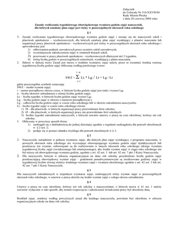 Załącznik do Uchwały Nr 516/XXVII/04 Rady Miasta Płocka z dnia 28 czerwca 2004 roku Zasady rozliczania tygodniowego obowiązkowego wymiaru godzin zajęć nauczycieli, dla których ustalony plan zajęć jest różny w poszczególnych okresach roku szkolnego §1 1. Zasady rozliczania tygodniowego obowiązkowego wymiaru godzin zajęć i stosuje się do nauczycieli szkół i 2. placówek opiekuńczo – wychowawczych, dla których ustalony plan zajęć wynikający z planów nauczania lub organizacji pracy placówek opiekuńczo - wychowawczych jest różny w poszczególnych okresach roku szkolnego i spowodowany jest: 1) odbywaniem praktyk zawodowych przez uczniów szkół zawodowych, 2) wcześniejszym zakończeniem zajęć w ostatnich klasach szkół, 3) przerwami w pracy placówek opiekuńczo - wychowawczych dłuższymi niż 2 tygodnie, 4) różną liczbą godzin w poszczególnych semestrach, wynikającą z planu nauczania. Ilekroć w dalszej treści Zasad jest mowa o średnim wymiarze zajęć należy przez to rozumieć średnią ważoną tygodniową liczbę godzin zajęć obliczaną według poniższego wzoru: i =n SWZ = Σ Lt * Lg / Lt = Lg / Lt i i i=1 gdzie poszczególne symbole oznaczają: SWZ – średni wymiar zajęć; i – numer porządkowy okresu czasu, w którym liczba godzin zajęć jest stała i wynosi Lgi; n – liczbę okresów zatrudnienia o różnej liczbie godzin zajęć; Lti – liczbę tygodni, w których liczba godzin zajęć wynosi Lgi; Lgi – liczbę godzin zajęć w okresie o numerze porządkowym i; Lg – całkowita liczba godzin zajęć w czasie roku szkolnego lub w okresie zatrudnienia nauczyciela; Lt – liczba tygodni zajęć w czasie roku szkolnego równa: 1) 38 - dla placówek, w których organizacji pracy przewidziano ferie szkolne; 2) 45 - dla placówek, w których organizacji pracy nie przewidziano ferii szkolnych. 3) liczbie tygodni zatrudnienia nauczycieli, z którymi zawarto umowy o pracę na czas określony, krótszy niż rok szkolny. 3. Obliczony w powyższy sposób iloraz: 1) zaokrągla się z dokładnością do jednej dziesiątej zgodnie z regułami zaokrąglania dla potrzeb określonych w § 2 ust. 2; 2) podaje się w postaci ułamka zwykłego dla potrzeb określonych w § 3. §2 1. Nauczyciele zatrudnieni w pełnym wymiarze zajęć, dla których plan zajęć wynikający z programu nauczania, w 2. pewnych okresach roku szkolnego nie wyczerpuje obowiązującego wymiaru godzin zajęć dydaktycznych lub przekracza ten wymiar, zobowiązani są do realizowania w innych okresach roku szkolnego takiego wymiaru tygodniowej liczby zajęć (zwiększonego lub zmniejszonego), aby średni wymiar zajęć w ciągu roku szkolnego nie był niższy od obowiązkowego wymiaru godzin, zgodnie z art. 42 ust. 3 lub art. 42 ust. 7 pkt 3 Karty Nauczyciela. Dla nauczycieli, którym w arkuszu organizacyjnym na dany rok szkolny przydzielono liczbę godzin zajęć przekraczającą obowiązkowy wymiar zajęć - godzinami ponadwymiarowymi są zrealizowane godziny zajęć w tygodniowej liczbie równej różnicy średniego wymiaru zajęć i wymiaru określonego zgodnie z art. 42 ust. 3 lub art. 42 ust. 7 pkt 3 Karty Nauczyciela. §3 Dla nauczycieli zatrudnionych w niepełnym wymiarze zajęć, realizujących różny wymiar zajęć w poszczególnych okresach roku szkolnego, w umowie o pracę określa się średni wymiar zajęć z całego okresu zatrudnienia. §4 Umowy o pracę na czas określony, krótszy niż rok szkolny z nauczycielami, o których mowa w §1 ust. 1 należy zawierać wyłącznie w taki sposób, aby termin rozpoczęcia i zakończenia świadczenia pracy był określony datą. §5 Rozkład zajęć, ustalony według powyższych zasad dla każdego nauczyciela, powinien być określony w arkuszu organizacyjnym szkoły na dany rok szkolny.