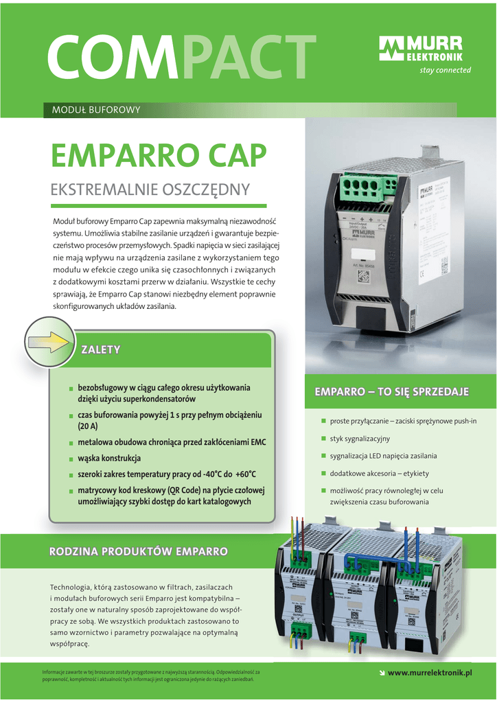 MODUŁ BUFOROWY EMPARRO CAP EKSTREMALNIE OSZCZĘDNY Moduł buforowy Emparro Cap zapewnia maksymalną niezawodność systemu. Umożliwia stabilne zasilanie urządzeń i gwarantuje bezpieczeństwo procesów przemysłowych. Spadki napięcia w sieci zasilającej nie mają wpływu na urządzenia zasilane z wykorzystaniem tego modułu w efekcie czego unika się czasochłonnych i związanych z dodatkowymi kosztami przerw w działaniu. Wszystkie te cechy sprawiają, spra sp rawiają, że Emparro Cap stanowi niezbędny element poprawnie skonfigurowanych układów skon sk onfigu guro rowa wany nych ch u kład kł adów ów zzasilania. asililan as ania ia.. Placeholders ZALETY bezobsługowy w ciągu całego okresu użytkowania dzięki użyciu superkondensatorów czas buforowania powyżej 1 s przy pełnym obciążeniu (20 A) metalowa obudowa chroniąca przed zakłóceniami EMC EMPARRO – TO SIĘ SPRZEDAJE proste przyłączanie – zaciski sprężynowe push-in styk sygnalizacyjny wąska konstrukcja sygnalizacja LED napięcia zasilania szeroki zakres temperatury pracy od -40°C do +60°C dodatkowe akcesoria – etykiety matrycowy kod kreskowy (QR Code) na płycie czołowej umożliwiający szybki dostęp do kart katalogowych możliwość pracy równoległej w celu zwiększenia czasu buforowania RODZINA PRODUKTÓW EMPARRO Technologia, którą zastosowano w filtrach, zasilaczach i modułach buforowych serii Emparro jest kompatybilna – zostały one w naturalny sposób zaprojektowane do współpracy ze sobą. We wszystkich produktach zastosowano to samo wzornictwo i parametry pozwalające na optymalną współpracę. Informacje zawarte wcontained tej broszurze przygotowane najwyższą starannością. Odpowiedzialność za The information hereinzostały has been compiled with zthe utmost care. Liability for the correctness, poprawność, kompletność i aktualność tych informacji jest ograniczona jedynie do rażących zaniedbań. completeness and topicality of the information is restricted to gross negligence.   www.murrelektronik.com  www.murrelektronik.pl Kondensatory o dużej pojemności Kondensatory o dużej pojemności pozwalają na gromadzenie energii ponad 1000 J, co umożliwia bezpieczne wyłączenie zasilanych układów wykonawczych. Proste okablowanie Obciążenie Bufor Moduły Emparro Cap 20/24 można umieszczać w bezpośrednim sąsiedztwie zasilaczy i przyłączać równolegle. W efekcie uproszczeniu ulega okablowanie i rozmieszczenie elementów w szafie rozdzielczej. Wyjątkowa oszczędność miejsca Moduły Emparro Cap 20/24 nie wymagają dużo miejsca na szynie DIN – szerokość modułu wynosi jedynie 65 mm. 65 mm Moduł buforowy Emparro Cap 20/24 – całkowicie bezobsługowy Dane do zamówienia 24 V Wejście Napięcie znamionowe Prąd znamionowy Czas ładowania Wyjście Napięcie wyjściowe Prąd znamionowy Czas buforowania Dane ogólne Zgodność z normami Wymiary Temperatura pracy Montaż Dane ogólne Certyfikaty Nr art. 85458 21.6…26.4 VDC 20 A typ. 80 sec 25.5…19 VDC 20 A > 1.0 sec (20 A) EN 61000-6-2, EN 61000-6-4 125 x 65 x 13 mm -40…+60 °C Szyna DIN TH35-7.5/TH 35-15 (EN 0715) styk sygnalizacyjny dla napięcia zasilania UL (w oczekiwaniu na decyzję) Informacjecontained zawarteherein w tej has broszurze zostaływith przygotowane z najwyższą starannością. Odpowiedzialność za The information been compiled the utmost care. Liability for the correctness, poprawność, kompletność i aktualność informacji ograniczona jedynie do rażących zaniedbań. completeness and topicality of the information is tych restricted to grossjest negligence.   www.murrelektronik.com  www.murrelektronik.pl