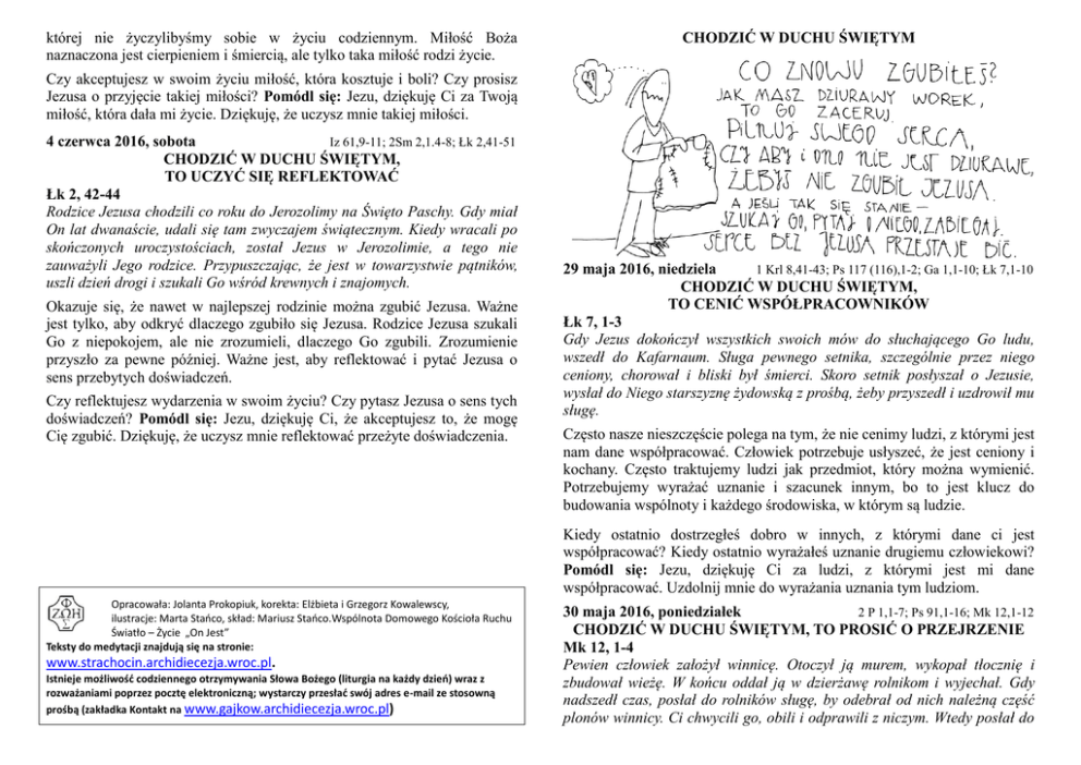 której nie życzylibyśmy sobie w życiu codziennym. Miłość Boża naznaczona jest cierpieniem i śmiercią, ale tylko taka miłość rodzi życie. CHODZIĆ W DUCHU ŚWIĘTYM Czy akceptujesz w swoim życiu miłość, która kosztuje i boli? Czy prosisz Jezusa o przyjęcie takiej miłości? Pomódl się: Jezu, dziękuję Ci za Twoją miłość, która dała mi życie. Dziękuję, że uczysz mnie takiej miłości. 4 czerwca 2016, sobota Iz 61,9-11; 2Sm 2,1.4-8; Łk 2,41-51 CHODZIĆ W DUCHU ŚWIĘTYM, TO UCZYĆ SIĘ REFLEKTOWAĆ Łk 2, 42-44 Rodzice Jezusa chodzili co roku do Jerozolimy na Święto Paschy. Gdy miał On lat dwanaście, udali się tam zwyczajem świątecznym. Kiedy wracali po skończonych uroczystościach, został Jezus w Jerozolimie, a tego nie zauważyli Jego rodzice. Przypuszczając, że jest w towarzystwie pątników, uszli dzień drogi i szukali Go wśród krewnych i znajomych. Okazuje się, że nawet w najlepszej rodzinie można zgubić Jezusa. Ważne jest tylko, aby odkryć dlaczego zgubiło się Jezusa. Rodzice Jezusa szukali Go z niepokojem, ale nie zrozumieli, dlaczego Go zgubili. Zrozumienie przyszło za pewne później. Ważne jest, aby reflektować i pytać Jezusa o sens przebytych doświadczeń. Czy reflektujesz wydarzenia w swoim życiu? Czy pytasz Jezusa o sens tych doświadczeń? Pomódl się: Jezu, dziękuję Ci, że akceptujesz to, że mogę Cię zgubić. Dziękuję, że uczysz mnie reflektować przeżyte doświadczenia. 29 maja 2016, niedziela 1 Krl 8,41-43; Ps 117 (116),1-2; Ga 1,1-10; Łk 7,1-10 CHODZIĆ W DUCHU ŚWIĘTYM, TO CENIĆ WSPÓŁPRACOWNIKÓW Łk 7, 1-3 Gdy Jezus dokończył wszystkich swoich mów do słuchającego Go ludu, wszedł do Kafarnaum. Sługa pewnego setnika, szczególnie przez niego ceniony, chorował i bliski był śmierci. Skoro setnik posłyszał o Jezusie, wysłał do Niego starszyznę żydowską z prośbą, żeby przyszedł i uzdrowił mu sługę. Często nasze nieszczęście polega na tym, że nie cenimy ludzi, z którymi jest nam dane współpracować. Człowiek potrzebuje usłyszeć, że jest ceniony i kochany. Często traktujemy ludzi jak przedmiot, który można wymienić. Potrzebujemy wyrażać uznanie i szacunek innym, bo to jest klucz do budowania wspólnoty i każdego środowiska, w którym są ludzie. Kiedy ostatnio dostrzegłeś dobro w innych, z którymi dane ci jest współpracować? Kiedy ostatnio wyrażałeś uznanie drugiemu człowiekowi? Pomódl się: Jezu, dziękuję Ci za ludzi, z którymi jest mi dane współpracować. Uzdolnij mnie do wyrażania uznania tym ludziom. Opracowała: Jolanta Prokopiuk, korekta: Elżbieta i Grzegorz Kowalewscy, ilustracje: Marta Stańco, skład: Mariusz Stańco.Wspólnota Domowego Kościoła Ruchu Światło – Życie „On Jest” Teksty do medytacji znajdują się na stronie: www.strachocin.archidiecezja.wroc.pl. Istnieje możliwość codziennego otrzymywania Słowa Bożego (liturgia na każdy dzień) wraz z rozważaniami poprzez pocztę elektroniczną; wystarczy przesłać swój adres e-mail ze stosowną prośbą (zakładka Kontakt na www.gajkow.archidiecezja.wroc.pl) 30 maja 2016, poniedziałek 2 P 1,1-7; Ps 91,1-16; Mk 12,1-12 CHODZIĆ W DUCHU ŚWIĘTYM, TO PROSIĆ O PRZEJRZENIE Mk 12, 1-4 Pewien człowiek założył winnicę. Otoczył ją murem, wykopał tłocznię i zbudował wieżę. W końcu oddał ją w dzierżawę rolnikom i wyjechał. Gdy nadszedł czas, posłał do rolników sługę, by odebrał od nich należną część plonów winnicy. Ci chwycili go, obili i odprawili z niczym. Wtedy posłał do nich drugiego sługę; lecz i tego zranili w głowę i znieważyli. Nieszczęściem owych rolników była ślepota, która sprawiała, że zwyczajnie byli głupi. Mieli utrzymanie od właściciela, który przygotował im winnicę do uprawy. Głupota i brak wdzięczności rodzi nieszczęścia także w naszym życiu. Potrzebujemy zauważyć dobro, które otrzymaliśmy od innych. Potrzebujemy dostrzegać dobro i wyrażać wdzięczność. Logika Boża jest inna niż logika ludzka. Potrzebujemy prosić Jezusa, aby objawiał nam Swoje myślenie i Swoją logikę dotyczącą naszych problemów i naszego życia. Bóg żywy spogląda na nasze życie i nasze problemy z perspektywy wieczności. Wszystko co trudne w naszym życiu, a co prowadzi nas do spotkania z Bogiem jest dobrym i błogosławionym doświadczeniem. Jak często prosisz Jezusa o przejrzenie? Czy potrafisz wyrażać wdzięczność innym? Pomódl się: Jezu, dziękuję Ci, że mogę zobaczyć dobro otrzymane od innych. Dziękuję za postawę wdzięczności. Czy prosisz Jezusa o ujrzenie Jego logiki związanej z naszymi problemami? Czy prosisz o przymnożenie wiary? Pomódl się: Jezu, dziękuję za Twoją logikę w moim życiu. Dziękuję za Twoje miłosierdzie. 31 maja 2016, wtorek – Nawiedzenie NMP 2 czerwca 2016, czwartek 2 Tm 2,8-15; Ps 25,4-14; Mk 12,28-34 CHODZIĆ W DUCHU ŚWIĘTYM, TO UCZYĆ SIĘ SŁUCHAĆ, ABY KOCHAĆ Mk 12, 29-31 Które jest pierwsze ze wszystkich przykazań? Jezus odpowiedział: Pierwsze jest: „Słuchaj, Izraelu, Pan Bóg nasz jest jedynym Panem. Będziesz miłował Pana, Boga swego, całym swoim sercem, całą swoją duszą, całym swoim umysłem i całą swoją mocą”. Drugie jest to: „Będziesz miłował swego bliźniego jak siebie samego”. Nie ma innego przykazania większego od tych. So 3,14-18 lub Rz 12,9-16; Ps: Iz 12,2-6; Łk 1,39-56 CHODZIĆ W DUCHU ŚWIĘTYM, TO DOŚWIADCZYĆ SWOJEGO NAWIEDZENIA Łk 1, 39-42 Maryja wybrała się i poszła z pośpiechem w góry do pewnego miasta w pokoleniu Judy. Weszła do domu Zachariasza i pozdrowiła Elżbietę. Gdy Elżbieta usłyszała pozdrowienie Maryi, poruszyło się dzieciątko w jej łonie, a Duch Święty napełnił Elżbietę. Wydała ona okrzyk i powiedziała: „Błogosławiona jesteś między niewiastami i błogosławiony jest owoc Twojego łona. Każdy z nas potrzebuje doświadczyć swojego nawiedzenia przez Maryję. Matk