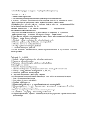 Materiał obowiązujący na zajęcia z Fizjologii tkanki mięśniowej Ćwiczenie 1 – 4-5.11 1. Pompa sodowo-potasowa 2. Mechanizmy jonowe potencjału spoczynkowego i czynnościowego 3. Struktura sarkomeru /miofilamenty cienkie i grube, linia Z i M, miomezyna, titina/ 2.Rola retikulum sarkoplazmatycznego w skurczu mięśnia szkieletowego 3.Białka kurczliwe mięśnia – aktyna – budowa, funkcje; miozyna - meromiozyna lekka i ciężka, funkcje subfragmentów S1, S2 5.Białka regulacyjne i ich funkcje /troponina C, I, T i tropomiozyna/. 6.Przekładnia elektromechaniczna. 7.Depolaryzacja sarkolemmy i cechy jej transmisji przez kanały T i retikulum sarkoplazmatyczne /receptory dihydropirydynowe i rianodynowe/ 8. Fazy skurczu mięśniowego, skurcz pojedynczy, skurcz tężcowy zupełny i niezupełny 9. Ślizgowy model skurczu mięśnia. 11. Rodzaje i właściwości miocytów mięśni szkieletowych 12. Mięśnie gładkie, cechy strukturalne mięśni gładkich. 13. Mięśnie trzewne i wielojednostkowe. 14. Cechy czynnościowe mięśni gładkich. 15. Automatyzm mięśni gładkich. 16. Rola bodźców mechanicznych, chemicznych i hormonów w wyzwalaniu skurczów mięśni gładkich. Ćwiczenie 2 – 18-19.11 1. Rodzaje i właściwości miocytów mięśni szkieletowych 2. Elastyczne własności mięśni. 3. Plastyczne własności mięśni szkieletowych i gładkich. 4. Rozciągliwość mięśni 5. Czynniki określające siłę skurczu 6. Jednostka motoryczna, współczynnik unerwienia mięśni, pole motoryczne 7. Rodzaje i cechy jednostek motorycznych (S, FR, FF). 8. Rekrutacja jednostek motorycznych. 9. Zmęczenie mięśniowe – przyczyny i objawy. 10. Energetyka skurczu mięśnia szkieletowego. Rola ATP w skurczu mięśniowym. 11. Praca dynamiczna i statyczna 12. Przemiany cieplne w mięśniach 13. Reakcja miokinazowa. 14. Znaczenie fosfokreatyny w przemianach energetycznych mięśni. 15. Znaczenie glukozy i kwasów tłuszczowych w przemianach energetycznych mięśni. 16. Wydajność mięśni szkieletowych 17.Wpływ treningu na powstawanie zmęczenia mięśniowego. 18. Kontraktura - przyczyny i mechanizm powstawania. 19. Stężenie pośmiertne, czynniki warunkujące szybkość pojawiania się i trwania stężenia pośmiertnego.