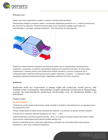 Rekuperacja Każdy nasz dom wyposażony zostaje w system mechanicznej wentylacji. Rekuperacja polega na odzysku ciepła z usuwanego wilgotnego powietrza m.in. z takich pomieszczeń jak: kuchnia czy łazienka. Powietrze przechodząc przez wymiennik oddaje swoje ciepło do wchodzącego z zewnątrz czystego powietrza – oba strumienie nie mieszają się. Właściwe funkcjonowanie wentylacji mechanicznej opiera się na odpowiednim rozmieszczeniu nawiewów i wywiewów w budynku odpowiednio połączonych systemem kanałów. W myśl zasad projektowych, nawiewy którymi jest dostarczane świeże powietrze, powinny znajdować się w pomieszczeniach najmniej zanieczyszczonych (pokój, sypialnia), a wywiew – w miejscach, gdzie występuje najwięcej zanieczyszczonego i wilgotnego powietrza (kuchnia, łazienka). Kotłownia Kotłownia może być wyposażona w pompę ciepła lub tradycyjny kocioł gazowy. Dla każdego domu wykonujemy indywidualny projekt instalacji wewnętrznych dopasowując systemy do indywidualnych preferencji użytkownika oraz do lokalizacji działki i jej uzbrojenia. Pompa ciepła Na czym polega? Powietrzna pompa ciepła wykorzystuje ciepło zawarte w powietrzu atmosferycznym do ogrzania domu lub podgrzania wody. Pompa ciepła działa na takiej samej zasadzie jak lodówka, z tą różnicą, że grzeje zamiast chłodzić. Pracuje ona w szerokim zakresie temperatur od -20’C - + 45’C. Jeżeli temperatura powietrza spadnie poniżej -25’C, co w naszym klimacie zdarza się bardzo rzadko, praca pompy wspomagana jest poprzez grzałkę elektryczną. Montaż powietrznej pompy ciepła jest najprostszy, ponieważ nie ma konieczności wykonywania odwiertów w ziemi oraz układania kolektorów. ul. Szamotulska 40/1, 60-366 Poznań tel. 667 821 007, [email protected] www.genero.net.pl Ile kosztuje? Aby uzyskać 4kW energii potrzebne jest 3 kW energii pobranej ze środowiska ( a więc darmowej) oraz 1 kW energii elektrycznej. Koszt instalacji powietrznej pompy ciepła jest najniższy, ze względu na brak konieczności przygotowania dolnego źródła ciepła. Kocioł gazowy W kotłowniach gazowych wykorzystujemy piece sprawdzonych producentów takich jak Viesmann, Vaillant. ul. Szamotulska 40/1, 60-366 Poznań tel. 667 821 007, [email protected] www.genero.net.pl