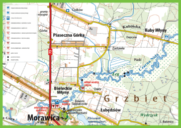 Przewodnik kajakarza Czarna Nida i Bobrza Przewodnik kajakarza Czarna Nida i Bobrza Przewodnik kajakarza Czarna Nida i Bobrza Szlak na rzece Czarna Nida Czarna Nida była zwana także kiedyś Morawicą. Płynie przez Góry Świętokrzyskie i Podgórze Szydłowskie. Powstaje około 2 km od granicy gminy Morawica, koło miejscowości Marzysz, z połączenia rzek Bielnianki i Lubrzanki. W pobliżu miejscowości Żerniki, łączy się z Białą Nidą i wówczas powstaje Nida, która jest lewobrzeżnym dopływem Wisły. Długość rzeki wynosi ok. 64 km, powierzchnia dorzecza to 1224 km2. Prawie w całości zaliczana jest do III klasy czystości, co oznacza wody zadawalającej jakości. Szerokość rzeki wynosi maksymalnie do kilkunastu metrów przy moście w Tokarni. Jej głównym dopływem lewobrzeżnym jest Morawka, a prawobrzeżnym Bobrza. Przed Bieleckimi Młynami do Czarnej Nidy wpada mniejszy prawobrzeżny dopływ Chodcza. Rzeka na całej długości zachowała naturalny charakter i tworzy malownicze meandry. Szlak niezbyt trudny, ale szczególnie na odcinku Kuby Młyny – Morawica może być uciążliwy. W lecie i okresach suszy można się spodziewać niskiego stanu wody na rzece i wówczas częstsza może okazać się konieczność przeciągania kajaka. Do pokonania większości przeszkód nie jest konieczne wychodzenie z kajaka, jednak płynięcie wymaga pewnych umiejętności. Przy niższych stanach wody płynięcie kajakami dwuosobowymi polecane od Bieleckich Młynów. Opis trasy Czarna Nida na odcinku: Kuby Młyny do Morawicy Początek szlaku znajduje się w okolicach pozostałości po starym młynie. Najłatwiej dotrzeć tam jadąc od strony Bilczy, na końcu wsi Kuby Młyny należy łagodnie skręcić w prawo w drogę szutrową (droga ostro w prawo w pod górkę prowadzi do prywatnej posiadłości). Po przejechaniu ok. 150 metrów wita nas znak informacyjny dotyczący szlaku po prawej stronie drogi, a po lewej sama rzeka. Odcinek do Morawicy liczy ok. 8 km, czas spływu ok. 4 godziny. Rzeka jest dość szeroka, niekiedy płytka, innym razem głęboka, należy spodziewać się różnych przeszkód. Po drodze znajduje się miejscowość Bieleckie Młyny, gdzie po lewej stronie jest duże bystrze i mocny prąd. Polecamy koło tej miejscowości przenieść kajaki na odcinku ok. 10 m. dopływając do Morawicy, gdy będzie już widać most należy również dobić do brzegu i przenieść kajaki za most ze względu na mocny prąd i przeszkodę w postaci tamy. Kilometraż/opis: 0 km – Kuby Młyny, na rzece pozostałości po starym młynie. Przegroda betonowa i betonowe elementy porosłe roślinnością. Mamy możliwość startu z młynówki lub kawałek dalej (ok. 50 m) z właściwej rzeki. Krótki odcinek przed połączeniem młynówki z rzeką dość wąski i zarośnięty. Rzeka płynie w lesie wśród zieleni. Co jakiś czas napotykamy na powalone, lub pochylone nad wodą drzewa, całkiem, lub częściowo przegradzające koryto rzeki. W zależności od poziomu wody wymagają przeciągnięcia kajaka, lub opłynięcia lewą, albo prawą stroną i manewrów między konarami. Następnie wypływamy z lasu i przez kilka kilometrów płynąć będziemy na otwartej przestrzeni, wśród podmokłych łąk i pastwisk. Rzeka meandruje ciasnymi zakolami. 5,1 km – z prawej strony dopływ małej strugi Chodczy. Po kolejnym silnym meandrze rzeka pozwala nieco odpocząć: koryto jest szersze, prostsze i niezatarasowane. Rzeka kieruje się na południowy zachód. Przewodnik kajakarza Czarna Nida i Bobrza 5,2 km – za dużym meandrem na wysokości miejscowości Zastawie wypływamy na wprost odeskowanego nabrzeża z małym pomostem. Poniżej, po prawej stronie spore koło napędzające turbinę. Płynąc w stronę młyna konieczna przenoska, najlepiej prawą stroną. Możemy też wybrać lewą odnogę omijając w ten sposób młyn, który widoczny będzie po prawej stronie, lekko ukryty za drzewami. Kolejny odcinek z drzewami w nurcie prowadzi nas do rozwidlenia: po prawej stronie przegrodzone stawidłami i dalej płytko. Przepływamy lewą stroną pokonując wąskie dwudziestometrowe bystrze. Następnie obie odnogi łączą się i zbliżają do mostu na drodze lokalnej Łabędziów – Bieleckie Młyny. 6,7 km - Rzeka od młyna niesie więcej wody i płynie się wygodniej. 7,6 km – z lewej strony dopływ rzeki Morawki. Wpływamy do Morawicy malowniczym odcinkiem rzeki – zaobserwować można grążele – rośliny spotykanie w jeziorach. 7,7 km – po lewej stronie widoczny kościół, a po prawej betonowe nabrzeże. Można tu przenieść kajak do prawej odnogi rzeki. 7,9 km – nieprzepływalna przegroda na rzece – zastawka jako pozostałość po dawnym młynie – obecnie budynek hotelu. Dopływając do Morawicy, gdy będzie już widać most, należy dobić do brzegu i przenieść kajaki prawą stroną rzeki. Lewą odnogą możemy płynąć dalej jeśli nie działa mała elektrownia znajdująca się tuż za muszlą. Jeśli elektrownia działa, zastawka kieruje wodę na tę elektrownię i dalsze płynięcie możemy kontynuować prawą odnogą. Tuż za zastawką na lewej odnodze znajduje się przejście dla pieszych, a za muszlą koncertową miejsce odpoczynku dla kajakarzy – zadaszona wiata z miejscami siedzącymi. Miejsce to jest niemal w samym centrum Morawicy. Na parkingu obok starego młyna znajduje się bar szybkiej obsługi, a obok nowoczesne Centrum Samorządowe i zabytkowy park.