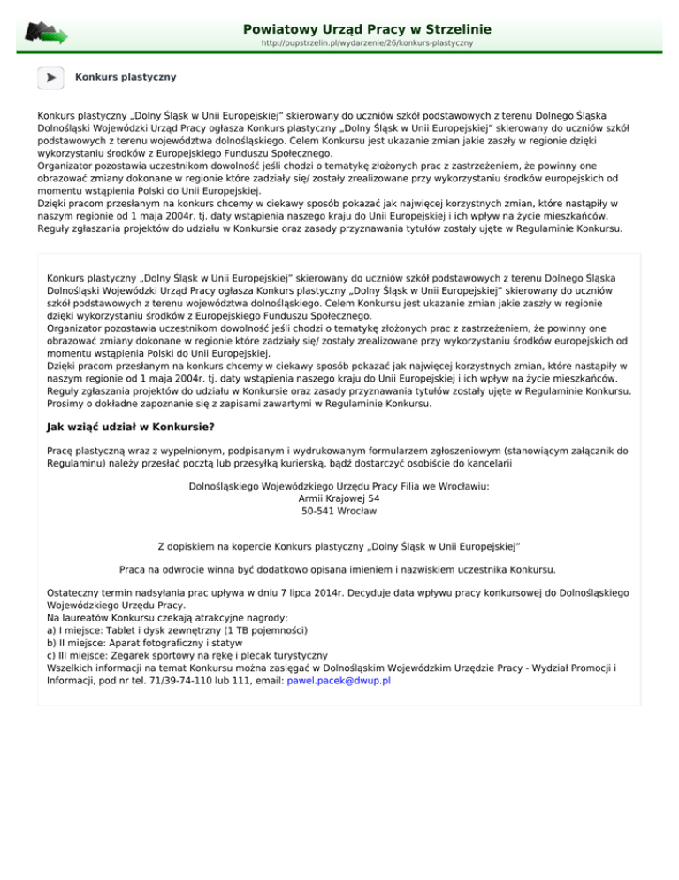 Powiatowy Urząd Pracy w Strzelinie http://pupstrzelin.pl/wydarzenie/26/konkurs-plastyczny Konkurs plastyczny Konkurs plastyczny „Dolny Śląsk w Unii Europejskiej” skierowany do uczniów szkół podstawowych z terenu Dolnego Śląska Dolnośląski Wojewódzki Urząd Pracy ogłasza Konkurs plastyczny „Dolny Śląsk w Unii Europejskiej” skierowany do uczniów szkół podstawowych z terenu województwa dolnośląskiego. Celem Konkursu jest ukazanie zmian jakie zaszły w regionie dzięki wykorzystaniu środków z Europejskiego Funduszu Społecznego. Organizator pozostawia uczestnikom dowolność jeśli chodzi o tematykę złożonych prac z zastrzeżeniem, że powinny one obrazować zmiany dokonane w regionie które zadziały się/ zostały zrealizowane przy wykorzystaniu środków europejskich od momentu wstąpienia Polski do Unii Europejskiej. Dzięki pracom przesłanym na konkurs chcemy w ciekawy sposób pokazać jak najwięcej korzystnych zmian, które nastąpiły w naszym regionie od 1 maja 2004r. tj. daty wstąpienia naszego kraju do Unii Europejskiej i ich wpływ na życie mieszkańców. Reguły zgłaszania projektów do udziału w Konkursie oraz zasady przyznawania tytułów zostały ujęte w Regulaminie Konkursu. Konkurs plastyczny „Dolny Śląsk w Unii Europejskiej” skierowany do uczniów szkół podstawowych z terenu Dolnego Śląska Dolnośląski Wojewódzki Urząd Pracy ogłasza Konkurs plastyczny „Dolny Śląsk w Unii Europejskiej” skierowany do uczniów szkół podstawowych z terenu województwa dolnośląskiego. Celem Konkursu jest ukazanie zmian jakie zaszły w regionie dzięki wykorzystaniu środków z Europejskiego Funduszu Społecznego. Organizator pozostawia uczestnikom dowolność jeśli chodzi o tematykę złożonych prac z zastrzeżeniem, że powinny one obrazować zmiany dokonane w regionie które zadziały się/ zostały zrealizowane przy wykorzystaniu środków europejskich od momentu wstąpienia Polski do Unii Europejskiej. Dzięki pracom przesłanym na konkurs chcemy w ciekawy sposób pokazać jak najwięcej korzystnych zmian, które nastąpiły w naszym regionie od 1 maja 2004r. tj. daty wstąpienia naszego kraju do Unii Europejskiej i ich wpływ na życie mieszkańców. Reguły zgłaszania projektów do udziału w Konkursie oraz zasady przyznawania tytułów zostały ujęte w Regulaminie Konkursu. Prosimy o dokładne zapoznanie się z zapisami zawartymi w Regulaminie Konkursu. Jak wziąć udział w Konkursie? Pracę plastyczną wraz z wypełnionym, podpisanym i wydrukowanym formularzem zgłoszeniowym (stanowiącym załącznik do Regulaminu) należy przesłać pocztą lub przesyłką kurierską, bądź dostarczyć osobiście do kancelarii Dolnośląskiego Wojewódzkiego Urzędu Pracy Filia we Wrocławiu: Armii Krajowej 54 50-541 Wrocław Z dopiskiem na kopercie Konkurs plastyczny „Dolny Śląsk w Unii Europejskiej” Praca na odwrocie winna być dodatkowo opisana imieniem i nazwiskiem uczestnika Konkursu. Ostateczny termin nadsyłania prac upływa w dniu 7 lipca 2014r. Decyduje data wpływu pracy konkursowej do Dolnośląskiego Wojewódzkiego Urzędu Pracy. Na laureatów Konkursu czekają atrakcyjne nagrody: a) I miejsce: Tablet i dysk zewnętrzny (1 TB pojemności) b) II miejsce: Aparat fotograficzny i statyw c) III miejsce: Zegarek sportowy na rękę i plecak turystyczny Wszelkich informacji na temat Konkursu można zasięgać w Dolnośląskim Wojewódzkim Urzędzie Pracy - Wydział Promocji i Informacji, pod nr tel. 71/39-74-110 lub 111, email: [email protected]