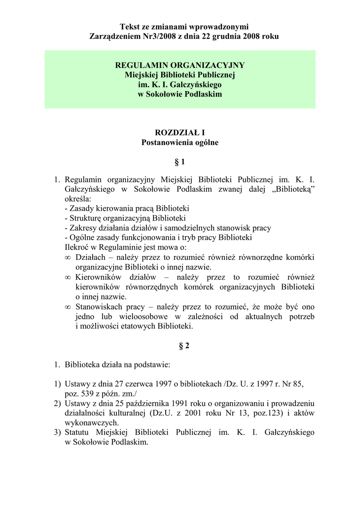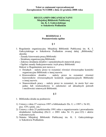 Tekst ze zmianami wprowadzonymi Zarządzeniem Nr3/2008 z dnia 22 grudnia 2008 roku REGULAMIN ORGANIZACYJNY Miejskiej Biblioteki Publicznej im. K. I. Gałczyńskiego w Sokołowie Podlaskim ROZDZIAŁ I Postanowienia ogólne §1 1. Regulamin organizacyjny Miejskiej Biblioteki Publicznej im. K. I. Gałczyńskiego w Sokołowie Podlaskim zwanej dalej „Biblioteką” określa: - Zasady kierowania pracą Biblioteki - Strukturę organizacyjną Biblioteki - Zakresy działania działów i samodzielnych stanowisk pracy - Ogólne zasady funkcjonowania i tryb pracy Biblioteki Ilekroć w Regulaminie jest mowa o: • Działach – należy przez to rozumieć również równorzędne komórki organizacyjne Biblioteki o innej nazwie. • Kierowników działów – należy przez to rozumieć również kierowników równorzędnych komórek organizacyjnych Biblioteki o innej nazwie. • Stanowiskach pracy – należy przez to rozumieć, że może być ono jedno lub wieloosobowe w zależności od aktualnych potrzeb i możliwości etatowych Biblioteki. §2 1. Biblioteka działa na podstawie: 1) Ustawy z dnia 27 czerwca 1997 o bibliotekach /Dz. U. z 1997 r. Nr 85, poz. 539 z późn. zm./ 2) Ustawy z dnia 25 października 1991 roku o organizowaniu i prowadzeniu działalności kulturalnej (Dz.U. z 2001 roku Nr 13, poz.123) i aktów wykonawczych. 3) Statutu Miejskiej Biblioteki Publicznej im. K. I. Gałczyńskiego w Sokołowie Podlaskim. 4) Ustawy z dnia 29 września 1994 r.o Rachunkowości /Dz.U. Nr 121, poz.591 z późn. zm./ 5) Porozumienia w sprawie powierzenia Miejskiej Bibliotece Publicznej im. K. I. Gałczyńskiego w Sokołowie Podlaskim zadań powiatowej biblioteki publicznej dla Powiatu Sokołowskiego, zawartego w dniu 31 sierpnia 2011 r. pomiędzy Zarządem Powiatu Sokołowskiego a Zarządem Miasta Sokołowa Podlaskiego 6) Ustawy z dnia 29 sierpnia 1997 r. o ochronie danych osobowych /Dz. U. Nr 133, poz.883/ 7) Niniejszego regulaminu oraz innych regulaminów wewnętrznych i instrukcji wprowadzanych zarządzeniami Dyrektora Biblioteki. ROZDZIAŁ II Zasady kierowania pracą Biblioteki §3 1. Pracą Biblioteki kieruje Dyrektor przy pomocy Księgowego i Kierowników poszczególnych działów. 2. Kierownicy działów wykonując określone przez Dyrektora zadania i kompetencje zapewniają w tym zakresie kompleksowe rozwiązanie problemów oraz realizację zadań podporządkowanemu im działowi. 3. W celu omówienia zagadnień programowych, spraw mających usprawnić pracę, zwiększyć jej wydajność oraz podnieść poziom i terminowość załatwianych spraw Dyrektor zwołuje w miarę potrzeb narady pracownicze. §4 1. Do wyłącznej kompetencji i obowiązków Dyrektora Biblioteki należą: 1. Kierowanie działalnością Biblioteki, odpowiedzialność za nią i reprezentowanie jej na zewnątrz. 2. Ustalanie szczegółowej organizacji wewnątrz Biblioteki oraz zakresów działania poszczególnych komórek organizacyjnych – nadawanie regulaminu organizacyjnego i innych regulaminów wewnętrznych. 3. Wykonywanie uprawnień kierownika zakładu pracy w stosunku do pracowników Biblioteki, a w szczególności zatrudnianie, awansowanie, przydzielanie zakresu obowiązków i zwalnianie pracowników, przyznawanie premii, nagród, wymierzanie kar porządkowych. 4. Opracowanie budżetu Biblioteki i nadzorowanie jego wykonania. 2 5. Zbieranie materiałów sprawozdawczych działów i bibliotek terenowych i opracowywanie na ich podstawie okresowych sprawozdań zbiorczych (półrocznych i rocznych) przedkładanych odpowiednio: Burmistrzowi Miasta Sokołów Podlaski, Starostwu Powiatowemu w Sokołowie oraz Bibliotece Publicznej m.st. Warszawy – Bibliotece Głównej Województwa Mazowieckiego. 6. Zaopatrywanie Biblioteki w potrzebny sprzęt, materiały i druki. 7. Sprawowanie nadzoru nad gospodarowaniem powierzonym księgozbiorem, materiałami i sprzętem. 8. Realizowanie zadań powiatowej biblioteki publicznej i odpowiedzialność za nie wspólnie z samorządem miejskim wobec samorządu powiatowego zgodnie z zawartym Porozumieniem pomiędzy Zarządami Miasta i Powiatu. 9. Organizowanie praktyk dla studentów oraz słuchaczy studium bibliotekarskiego. 10.Inicjowanie i organizowanie spotkań autorskich, wystaw, prelekcji i pogadanek w Bibliotece. 11.Współdziałanie z placówkami upowszechniania kultury, organizacjami społecznymi, szkołami i stowarzyszeniami na terenie miasta i powiatu. §5 1. W razie nieobecności Dyrektora zastępuje go wyznaczony przez Dyrektora Kierownik jednego z działów. 2. Zakres zastępstwa obejmuje bieżące kierowanie pracą Biblioteki ROZDZIAŁ III Struktura Biblioteki §6 Dla zapewnienia właściwego funkcjonowania Biblioteki i należytej obsługi osób korzystających z jej usług, ustanawia się następującą strukturę organizacyjną: 1. W skład Biblioteki wchodzą następujące działy i komórki organizacyjne oraz samodzielne stanowiska pracy : a/ Księgowy – ¼ etatu b/ Dział Udostępniania Zbiorów dla Dorosłych – 4 etaty c/ Dział dla Dzieci i Młodzieży – 2 etaty d/ Czytelnia – 1 etat e/ Dział Zbiorów Specjalnych z Czytelnią Internetową– 1 etat 3 f/ Instruktor powiatowy – 1 pracownik z rozszerzonym zakresem obowiązków. g/ Kasjer – pracownik z rozszerzonym zakresem obowiązków o obsługę kasową. h/ Referent ds. pracowniczych- pracownik z rozszerzonym zakresem obowiązków. h’/ Referent ds. gospodarczych – 1 etat i/ Informatyk – stała umowa – zlecenie j/ Sprzątaczka - pracownik z rozszerzonym zakresem obowiązków. 2. Pracą działu kieruje Kierownik, w razie jego nieobecności zastępuje go inny, wyznaczony przez niego pracownik. 3. Kierownicy odpowiadają za całokształt pracy powierzonych komórek organizacyjnych przed Dyrektorem. 4. Poszczególne Działy posiadają własne zakresy działania. 5. Strukturę Biblioteki przedstawia załącznik Nr 1 ROZDZIAŁ IV Zakres działania poszczególnych działów i samodzielnych stanowisk pracy §7 Obow