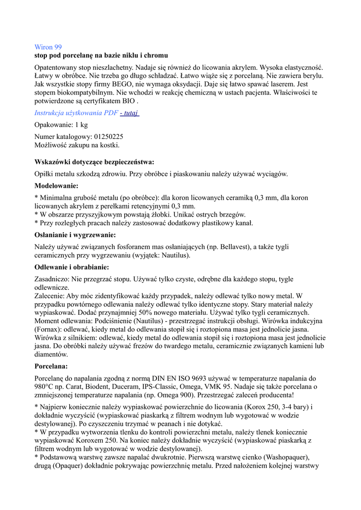Wiron 99 stop pod porcelanę na bazie niklu i chromu Opatentowany stop nieszlachetny. Nadaje się również do licowania akrylem. Wysoka elastyczność. Łatwy w obróbce. Nie trzeba go długo schładzać. Łatwo wiąże się z porcelaną. Nie zawiera berylu. Jak wszystkie stopy firmy BEGO, nie wymaga oksydacji. Daje się łatwo spawać laserem. Jest stopem biokompatybilnym. Nie wchodzi w reakcję chemiczną w ustach pacjenta. Właściwości te potwierdzone są certyfikatem BIO . Instrukcja użytkowania PDF - tutaj Opakowanie: 1 kg Numer katalogowy: 01250225 Możliwość zakupu na kostki. Wskazówki dotyczące bezpieczeństwa: Opiłki metalu szkodzą zdrowiu. Przy obróbce i piaskowaniu należy używać wyciągów. Modelowanie: * Minimalna grubość metalu (po obróbce): dla koron licowanych ceramiką 0,3 mm, dla koron licowanych akrylem z perełkami retencyjnymi 0,3 mm. * W obszarze przyszyjkowym powstają żłobki. Unikać ostrych brzegów. * Przy rozległych pracach należy zastosować dodatkowy plastikowy kanał. Osłanianie i wygrzewanie: Należy używać związanych fosforanem mas osłaniających (np. Bellavest), a także tygli ceramicznych przy wygrzewaniu (wyjątek: Nautilus). Odlewanie i obrabianie: Zasadniczo: Nie przegrzać stopu. Używać tylko czyste, odrębne dla każdego stopu, tygle odlewnicze. Zalecenie: Aby móc zidentyfikować każdy przypadek, należy odlewać tylko nowy metal. W przypadku powtórnego odlewania należy odlewać tylko identyczne stopy. Stary materiał należy wypiaskować. Dodać przynajmniej 50% nowego materiału. Używać tylko tygli ceramicznych. Moment odlewania: Podciśnienie (Nautilus) - przestrzegać instrukcji obsługi. Wirówka indukcyjna (Fornax): odlewać, kiedy metal do odlewania stopił się i roztopiona masa jest jednolicie jasna. Wirówka z silnikiem: odlewać, kiedy metal do odlewania stopił się i roztopiona masa jest jednolicie jasna. Do obróbki należy używać frezów do twardego metalu, ceramicznie związanych kamieni lub diamentów. Porcelana: Porcelanę do napalania zgodną z normą DIN EN ISO 9693 używać w temperaturze napalania do 980°C np. Carat, Biodent, Duceram, IPS-Classic, Omega, VMK 95. Nadaje się także porcelana o zmniejszonej temperaturze napalania (np. Omega 900). Przestrzegać zaleceń producenta! * Najpierw koniecznie należy wypiaskować powierzchnie do licowania (Korox 250, 3-4 bary) i dokładnie wyczyścić (wypiaskować piaskarką z filtrem wodnym lub wygotować w wodzie destylowanej). Po czyszczeniu trzymać w peanach i nie dotykać. * W przypadku wytworzenia tlenku do kontroli powierzchni metalu, należy tlenek koniecznie wypiaskować Koroxem 250. Na koniec należy dokładnie wyczyścić (wypiaskować piaskarką z filtrem wodnym lub wygotować w wodzie destylowanej). * Podstawową warstwę zawsze napalać dwukrotnie. Pierwszą warstwę cienko (Washopaquer), drugą (Opaquer) dokładnie pokrywając powierzchnię metalu. Przed nałożeniem kolejnej warstwy porcelany należy koronę umyć pod bieżącą wodą. * Zaleca się wolne schładzanie (faza schładzania do ok. 600°C). Prace końcowe: Należy widoczne powierzchnie metalu wypiaskować tlenkiem Korox 50, a zewnętrzne powierzchnie Perlablastem. Wypolerować gumkami do polerowania, następnie pastą do polerowania (niebieską). Potem dokładnie oczyścić (wypiaskować piaskarką z filtrem wodnym lub wygotować w wodzie destylowanej). Lutowanie: Przed napalaniem lutować płomieniem (1165°C): Wiron-Lot i płyn Fluxsol. Po napalaniu lutować w piecu (860°C): WGL-Lot i płyn Minoxyd. Zaleca się wolne schładzanie (faza schładzania do ok. 600°C). Lutowanie laserem: Dodatkowy materiał: drut Wiroweld NC 0,35 mm lub drut Wiroweld 0,5 mm. Działanie uboczne: Alergia na składniki stopu lub reakcje elektrochemiczne zdarzają się bardzo rzadko. Wzajemne oddziaływania: Przy kontakcie okluzyjnym różnych stopów reakcje elektrochemiczne zdarzają się bardzo rzadko. Przeciwwskazania: Przy znanej alergii na składniki stopu. Gwarancja: Nasze wskazówki, niezależnie od tego czy zostały przekazane ustnie, pisemnie, czy też w trakcie praktycznych instrukcji, opierają się na naszym własnym doświadczeniu oraz próbach i mogą być traktowane tylko jako standardowe wartości. Nasze produkty są ciągle rozwijane. Z wyżej wymienionych powodów zastrzegamy sobie prawo do zmian w konstrukcji i składzie. Cechy stopu: Standardowe wartości Posiada certyfikat Bio Typ bardzo twardy (4) Kolor srebrny Gęstość [g/cm3] 8,2 Twardość Vickera (HV 10) 180 Granica elastyczności (rp 0,2) [Mpa] 330 Wytrzymałość na pęknięcia (A5) [%] 25 Moduł elastyczności ok. [Mpa] 205.000 Przedział topliwości [°C] 1310-1250 Temperatura odlewania [°C] ok. 1420 Temperatura wygrzewania [°C] 900-950 Współczynnik rozszerzalności cieplnej WAK [10-6K-1] 20-600°C 14,0 20-500°C 13,8 Skład (w %): Ni: 65,0 Si: 1,0 Cr: 22,5 Fe: 0,5 Mo: 9,5 Ce: 0,4 Nb: 1,0 C: max. 0,02