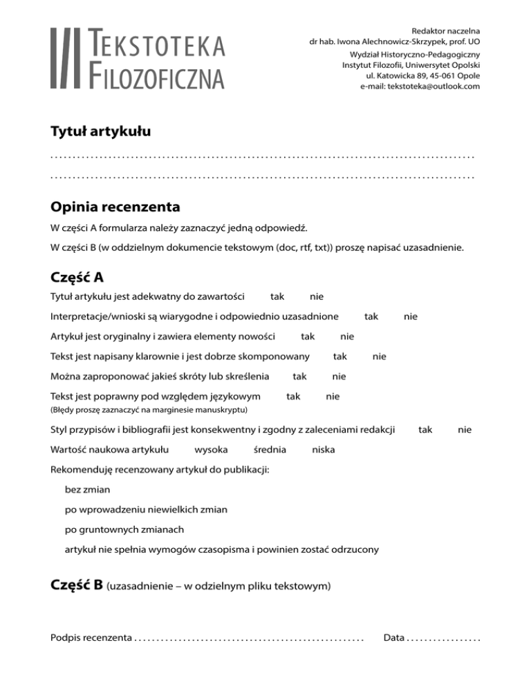 Redaktor naczelna dr hab. Iwona Alechnowicz-Skrzypek, prof. UO Wydział Historyczno-Pedagogiczny Instytut Filozofii, Uniwersytet Opolski ul. Katowicka 89, 45-061 Opole e-mail: [email protected] Tytuł artykułu ............................................................................................... ............................................................................................... Opinia recenzenta W części A formularza należy zaznaczyć jedną odpowiedź. W części B (w oddzielnym dokumencie tekstowym (doc, rtf, txt)) proszę napisać uzasadnienie. Część A Tytuł artykułu jest adekwatny do zawartości tak nie Interpretacje/wnioski są wiarygodne i odpowiednio uzasadnione Artykuł jest oryginalny i zawiera elementy nowości tak tak nie Tekst jest napisany klarownie i jest dobrze skomponowany tak Można zaproponować jakieś skróty lub skreślenia nie Tekst jest poprawny pod względem językowym tak tak nie nie nie (Błędy proszę zaznaczyć na marginesie manuskryptu) Styl przypisów i bibliografii jest konsekwentny i zgodny z zaleceniami redakcji Wartość naukowa artykułu wysoka średnia tak nie niska Rekomenduję recenzowany artykuł do publikacji: bez zmian po wprowadzeniu niewielkich zmian po gruntownych zmianach artykuł nie spełnia wymogów czasopisma i powinien zostać odrzucony Część B (uzasadnienie – w odzielnym pliku tekstowym) Podpis recenzenta . . . . . . . . . . . . . . . . . . . . . . . . . . . . . . . . . . . . . . . . . . . . . . . . . . . . Data . . . . . . . . . . . . . . . . .