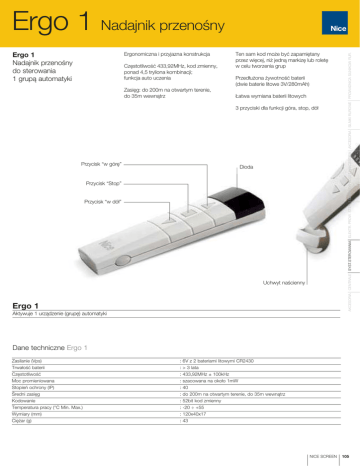 Ergonomiczna i przyjazna konstrukcja Ergo 1 Nadajnik przenośny do sterowania 1 grupą automatyki Częstotliwość 433,92MHz, kod zmienny, ponad 4,5 tryliona kombinacji; funkcja auto uczenia Zasięg: do 200m na otwartym terenie, do 35m wewnątrz Ten sam kod może być zapamiętany przez więcej, niż jedną markizę lub roletę w celu tworzenia grup Przedłużona żywotność baterii (dwie baterie litowe 3V/280mAh) Łatwa wymiana baterii litowych 3 przyciski dla funkcji góra, stop, dół Przycisk “w górę” Dioda Przycisk “Stop” Przycisk “w dół” Uchwyt naścienny Ergo 1 Aktywuje 1 urządzenie (grupę) automatyki AKCESORIA CENTRALE SYST.STEROWANIA ELEKTR. PROW. STER. SILNIKI DO ROLET I AKCESORIA AKCESORIA SILNIKI RUROWE PROWADNICA SILNIKOW RUR. Ergo 1 Nadajnik przenośny € 36,00 Dane techniczne Ergo 1 Zasilanie (Vps) : 6V z 2 bateriami litowymi CR2430 Trwałość baterii Częstotliwość : > 3 lata Moc promieniowana : szacowana na około 1mW Stopień ochrony (IP) : 40 Średni zasięg Kodowanie : do 200m na otwartym terenie, do 35m wewnątrz Temperatura pracy (°C Min. Max.) : -20 ÷ +55 Wymiary (mm) Ciężar (g) : 120x40x17 : 433,92MHz ± 100kHz : 52bit kod zmienny : 43 NICE SCREEN 105 Ergo 4 Nadajnik przenośny Ergo 4 Nadajnik przenośny do obsługi 4 grup automatyki z oddzielną aktywacją czujników pogody Ergonomiczna i przyjazna konstrukcja Przedłużona żywotność baterii (dwie baterie litowe 3V/280mAh) Częstotliwość 433,92MHz, kod zmienny, ponad 4,5 tryliona kombinacji; funkcja auto uczenia Aktywuje do 4 grup automatyki lub multigrup 3 przyciski dla funkcji góra, stop, dół, plus dwa przyciski wyboru Zasięg: do 200m na otwartym terenie, do 35m wewnątrz Nadajnik włącza / wyłącza czujniki pogody Ten sam kod nadajnika może być zapamiętany przez więcej, niż jedną markizę lub roletę w celu tworzenia grup Standardowy uchwyt naścienny Diody wyboru Przycisk “w górę” Przycisk “Stop” Przycisk “w dół” Prosta wymiana baterii litowych Ergo 4 Aktywuje do 4 grup automatyki oddzielnie, albo w grupach wielokrotnych. 2 kody sterowania dla trybów - “Wiatr” oraz “Wiatr - słońce” € 50,00 Dane techniczne Ergo 4 Zasilanie (Vps) : 6V z 2 bateriami litowymi CR2430 Trwałość baterii Częstotliwość : > 3 lata Moc promieniowana : szacowana na około 1mW Stopień ochrony (IP) : 40 Średni zasięg Kodowanie : do 200m na otwartym terenie, do 35m wewnątrz Temperatura pracy (°C Min. Max.) : -20 ÷ +55 Wymiary (mm) Ciężar (g) : 120x40x17 106 NICE SCREEN : 433,92MHz ± 100kHz : 52bit, kod zmienny : 43 Ergo6 Nadajnik przenośny do obsługi do 6 urządzeń automatyki Ergonomiczna i przyjazna konstrukcja Łatwa wymiana baterii litowych Częstotliwość 433,92MHz, kod zmienny, ponad 4,5 tryliona kombinacji; funkcja auto uczenia Aktywuje do 6 urządzeń automatyki pojedynczo, albo w grupach, wybieranych 6 diodami LED Zasięg: do 200m na otwartym terenie, do 35m wewnątrz Memogroup dla przywołania ostatnich 8 grup Ten sam kod nadajnika może być zapamiętany przez więcej, niż jedną markizę lub roletę w celu tworzenia grup 3 przyciski dla funkcji góra, stop, dół, plus dwa przyciski wyboru Przedłużona żywotność baterii (dwie baterie litowe 3V/280mAh) Diody wyboru Przycisk “w górę” Przycisk “Stop” Przycisk “w dół” Uchwyt naścienny Ergo 6 Aktywuje do 6 grup automatyki oddzielnie, albo w multigrupach. Pamięta 8 ostatnio wybranych grup AKCESORIA CENTRALE SYST.STEROWANIA ELEKTR. PROW. STER. SILNIKI DO ROLET I AKCESORIA AKCESORIA SILNIKI RUROWE PROWADNICA SILNIKOW RUR. Ergo 6 Nadajnik przenośny € 46,00 Dane techniczne Ergo 6 Zasilanie (Vps) : 6V z 2 bateriami litowymi CR2430 Trwałość baterii Częstotliwość : > 3 lata Moc promieniowana : szacowana na około 1mW Stopień ochrony (IP) : 40 Średni zasięg Kodowanie : do 200m na otwartym terenie, do 35m wewnątrz Temperatura pracy (°C Min. Max.) : -20 ÷ +55 Wymiary (mm) Ciężar (g) : 120x40x17 : 433,92MHz ± 100kHz : 52bit, kod zmienny : 43 NICE SCREEN 107