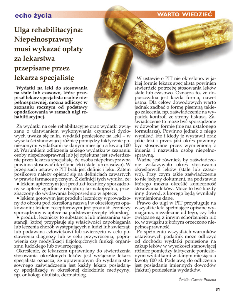 echo życia Ulga rehabilitacyjna: Niepełnosprawny musi wykazać opłaty za lekarstwa przepisane przez lekarza specjalistę Wydatki na leki do stosowania na stałe lub czasowo, które przepisał lekarz specjalista osobie niepełnosprawnej, można odliczyć w zeznaniu rocznym od podstawy opodatkowania w ramach ulgi rehabiltiacyjnej. Za wydatki na cele rehabilitacyjne oraz wydatki związane z ułatwianiem wykonywania czynności życiowych uważa się m.in. wydatki poniesione na leki – w wysokości stanowiącej różnicę pomiędzy faktycznie poniesionymi wydatkami w danym miesiącu a kwotą 100 zł. Warunkiem odliczenia takiego wydatku w zeznaniu osoby niepełnosprawnej lub jej opiekuna jest stwierdzenie przez lekarza specjalistę, że osoba niepełnosprawna powinna stosować określone leki (stale lub czasowo). W przepisach ustawy o PIT brak jest definicji leku. Zatem posiłkowo należy opierać się na definicjach zawartych w prawie farmaceutycznym. Z definicji tych wynika, że: ● lekiem aptecznym jest produkt leczniczy sporządzony w aptece zgodnie z recepturą farmakopealną, przeznaczony do wydawania bezpośrednio w aptece; ● lekiem gotowym jest produkt leczniczy wprowadzony do obrotu pod określoną nazwą i w określonym opakowaniu; lekiem recepturowym jest produkt leczniczy sporządzony w aptece na podstawie recepty lekarskiej; ● produkt leczniczy to substancja lub mieszanina substancji, której przypisuje się właściwości zapobiegania lub leczenia chorób występujących u ludzi lub zwierząt, lub podawana człowiekowi lub zwierzęciu w celu postawienia diagnozy lub w celu przywrócenia, poprawienia czy modyfikacji fizjologicznych funkcji organizmu ludzkiego lub zwierzęcego. Określenie, że lekarzem uprawniony do stwierdzenia stosowania określonych leków jest wyłącznie lekarz specjalista oznacza, że uprawnionym do wydania stosownego zaświadczenia jest każdy lekarz posiadający specjalizację w określonej dziedzinie medycyny, np. onkolog, okulista, dermatolog. WARTO WIEDZIEĆ W ustawie o PIT nie określono, w jakiej formie lekarz specjalista powinien stwierdzić potrzebę stosowania leków stale lub czasowo. Oznacza to, że dopuszczalna jest każda forma, nawet ustna. Dla celów dowodowych warto jednak zadbać o formę pisemną takiego zalecenia, np. zaświadczenie na wypadek kontroli ze strony fiskusa. Zaświadczenie to może być sporządzone w dowolnej formie (nie ma ustalonego formularza). Powinno jednak z niego wynikać, kto i kiedy je wystawił oraz jakie leki i przez jaki okres powinny być stosowane przez wymienioną z imienia i nazwiska osobę niepełnosprawną. Ważne jest również, by zaświadczenie wskazywało okres stosowania określonych leków (stale lub czasowo). Przy czym takie zaświadczenie to nie jedyny dokument, na podstawie którego można określić konieczność stosowania leków. Może to być każdy inny dowód, z którego będą wynikały wymienione dane. Prawo do ulgi w PIT przysługuje na wszystkie leki spełniające opisane wymagania, niezależnie od tego, czy leki związane są z innym schorzeniem niż to, w związku z którym orzeczono niepełnosprawność. Po spełnieniu wszystkich warunków ustawowych podatnik może odliczyć od dochodu wydatki poniesione na zakup leków w wysokości stanowiącej różnicę pomiędzy faktycznie poniesionymi wydatkami w danym miesiącu a kwotą 100 zł. Podstawą do odliczenia jest posiadanie imiennych dowodów (faktur) poniesienia wydatków. Źródło: Gazeta Prawna 31